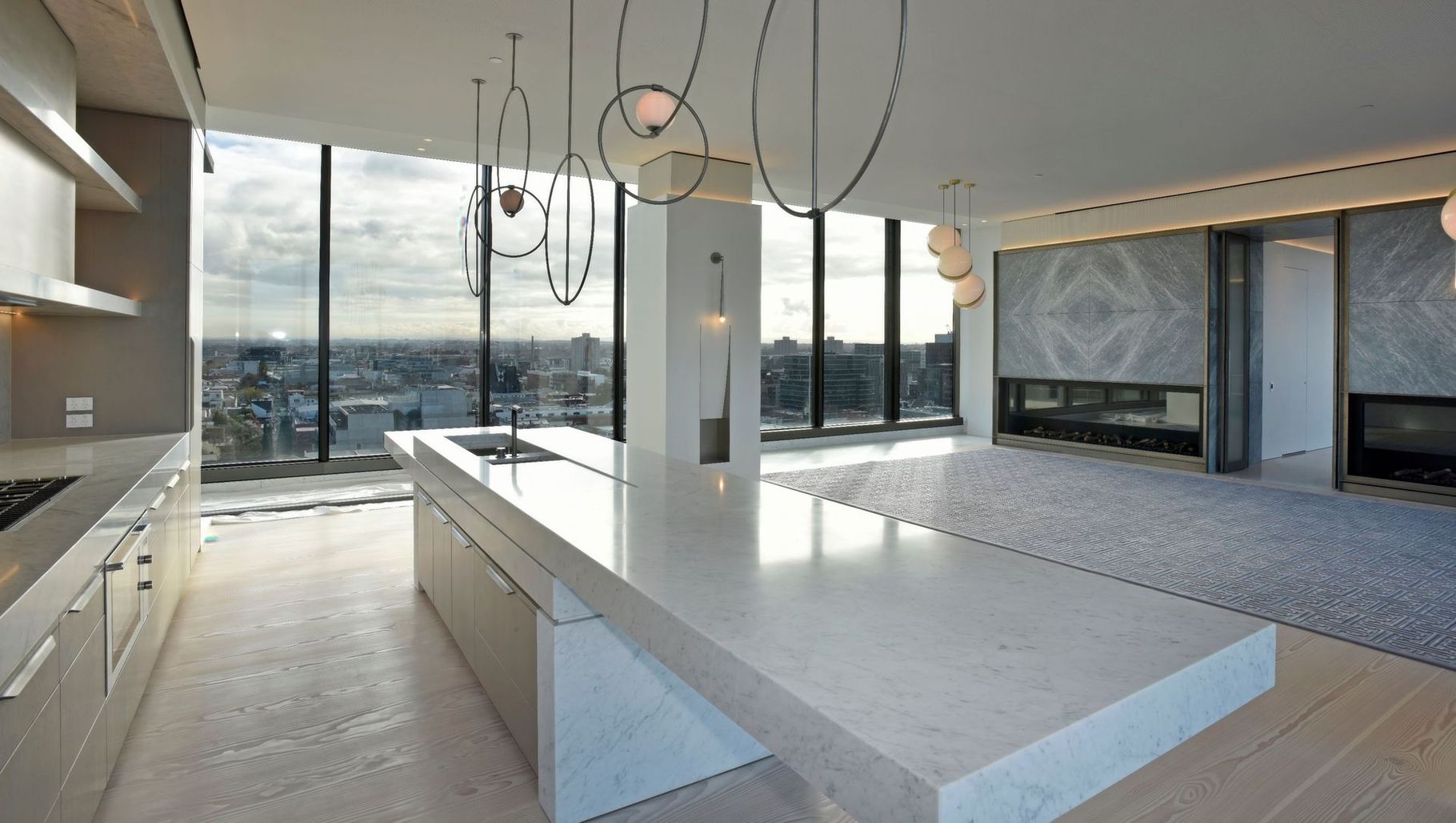 ArchiPro Project Summary - The Eastbourne residence showcases elegant marble detailing, including waterfall island benchtops and vein-matched marble wall panels, creating a timeless sophistication that complements the building's panoramic views and architectural lighting.