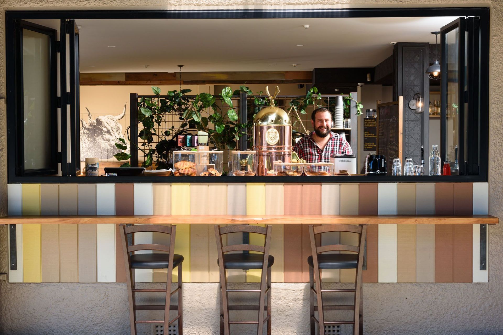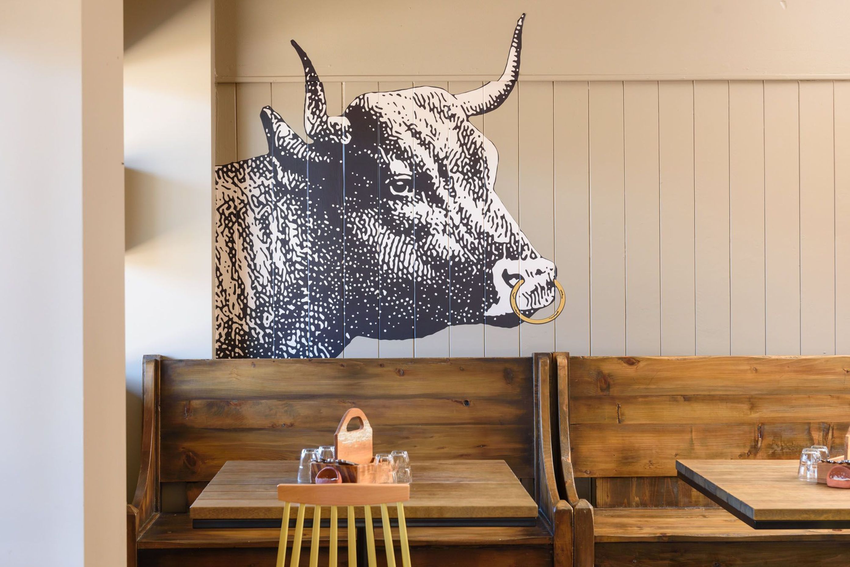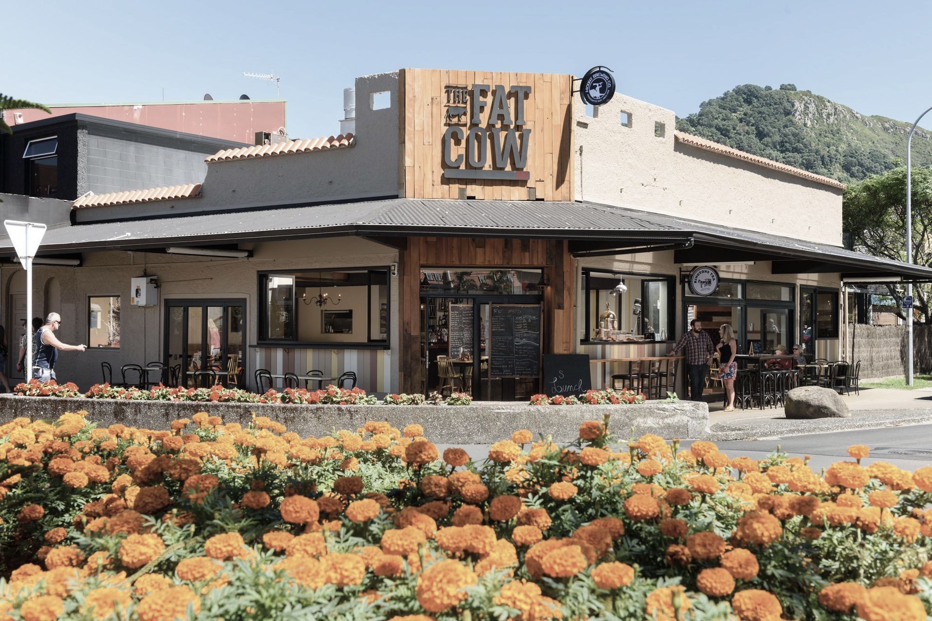 ArchiPro Project Summary - The Fat Cow Restaurant is a mixed-use establishment with a modern design, featuring an inviting awning and vibrant landscaping.