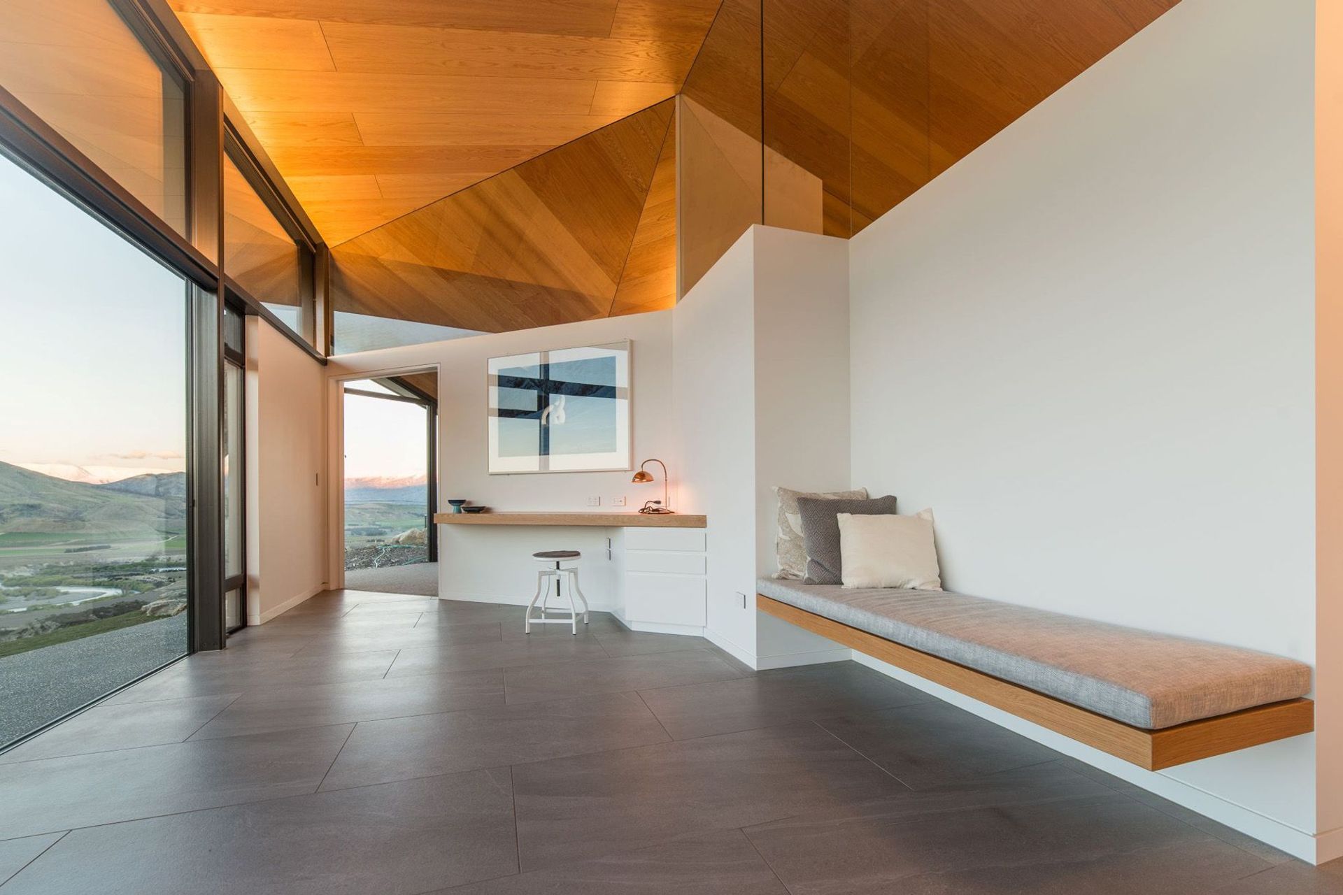 ArchiPro Project Summary - The Hawk House in Queensberry features a stunning Plymasters Classique Oak ceiling, designed in collaboration with architect James Stockwell and builder Nick Mizzi, showcasing unique angles and breathtaking views, while embracing natural materials for a warm, inviting atmosphere.