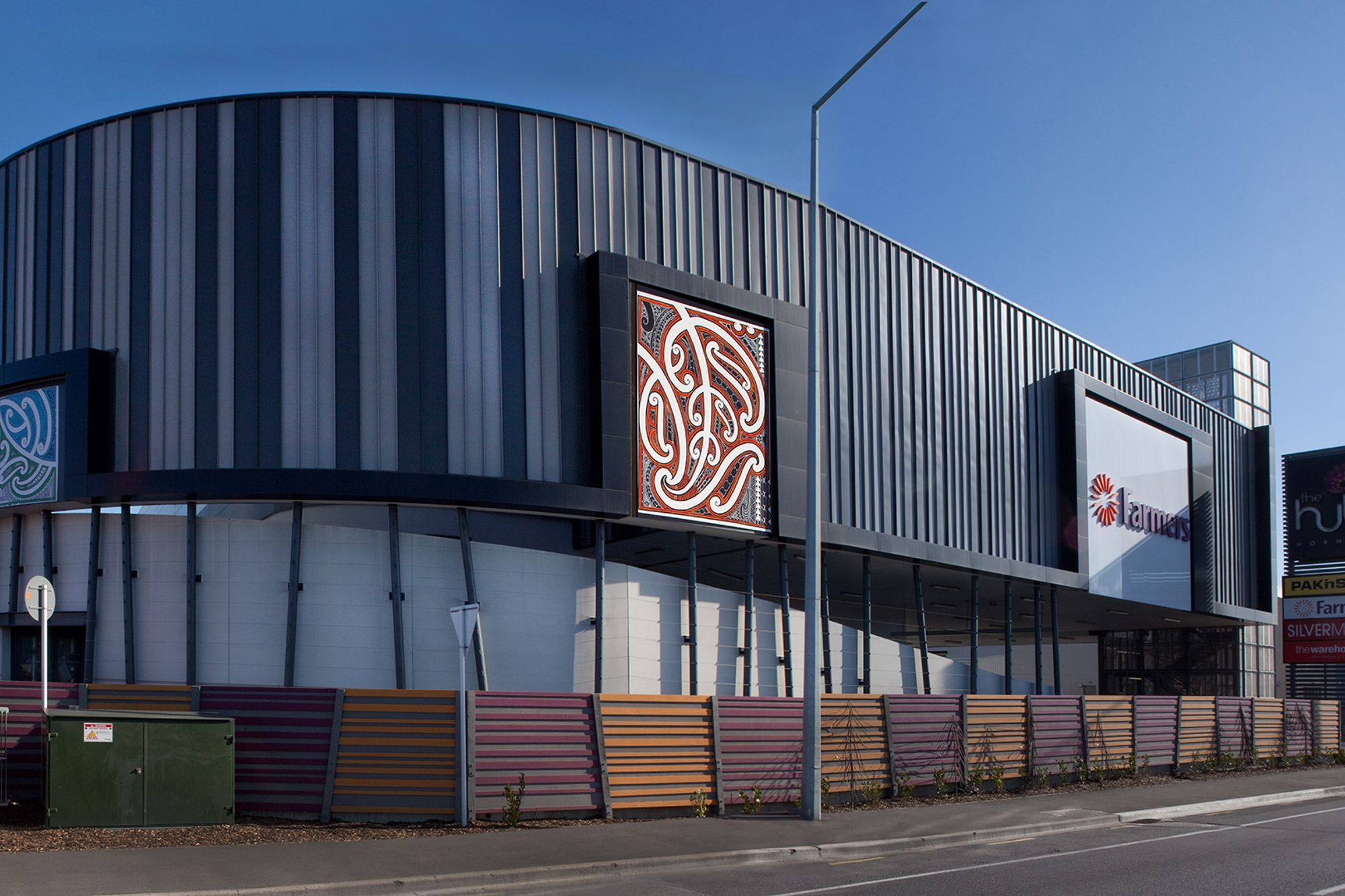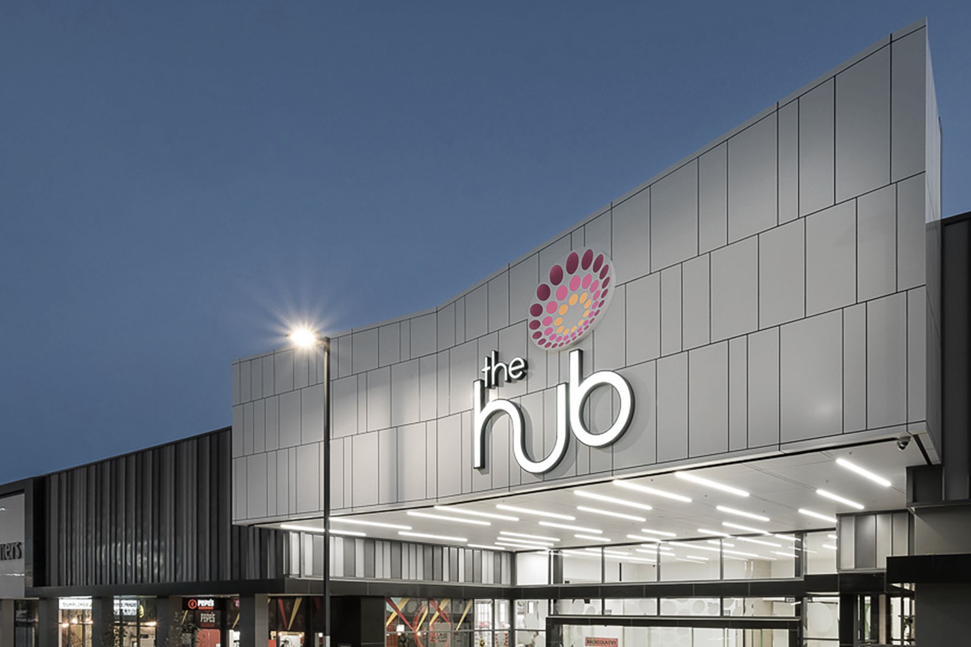 ArchiPro Project Summary - The Hub Hornby: A pioneering sustainable shopping centre in southern Christchurch, featuring Enviro-Mark Gold accreditation, enhanced public amenities, and a blend of aesthetic and functional design elements.