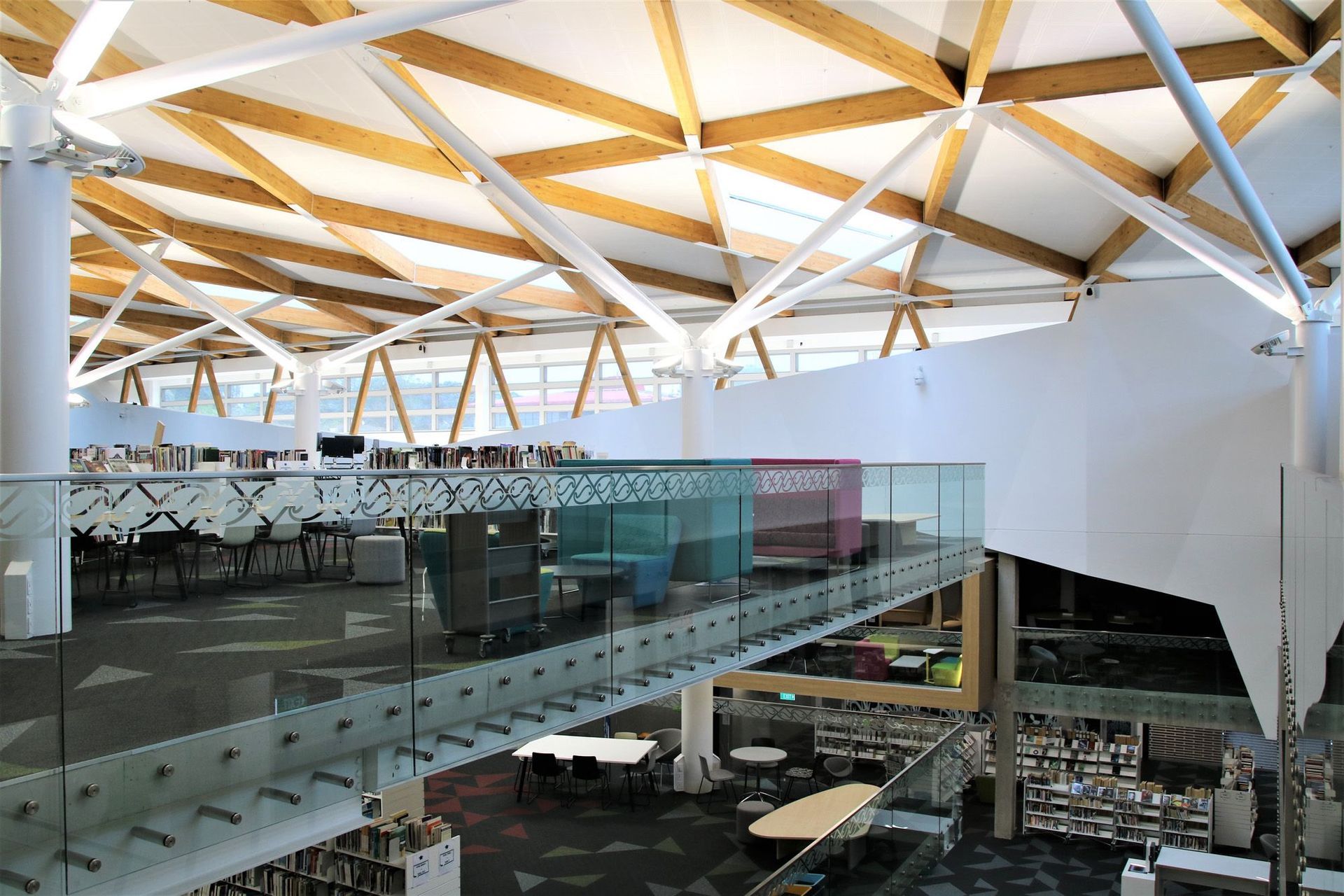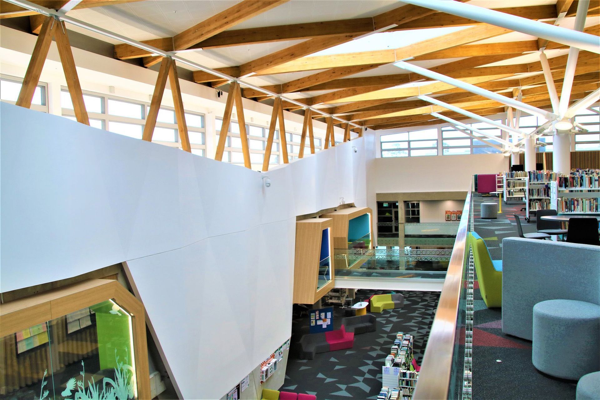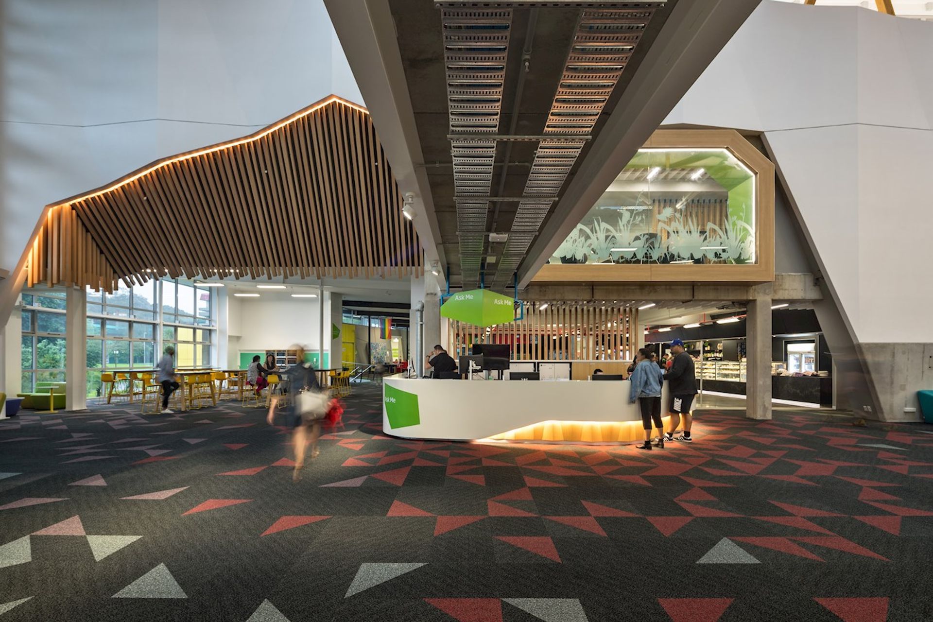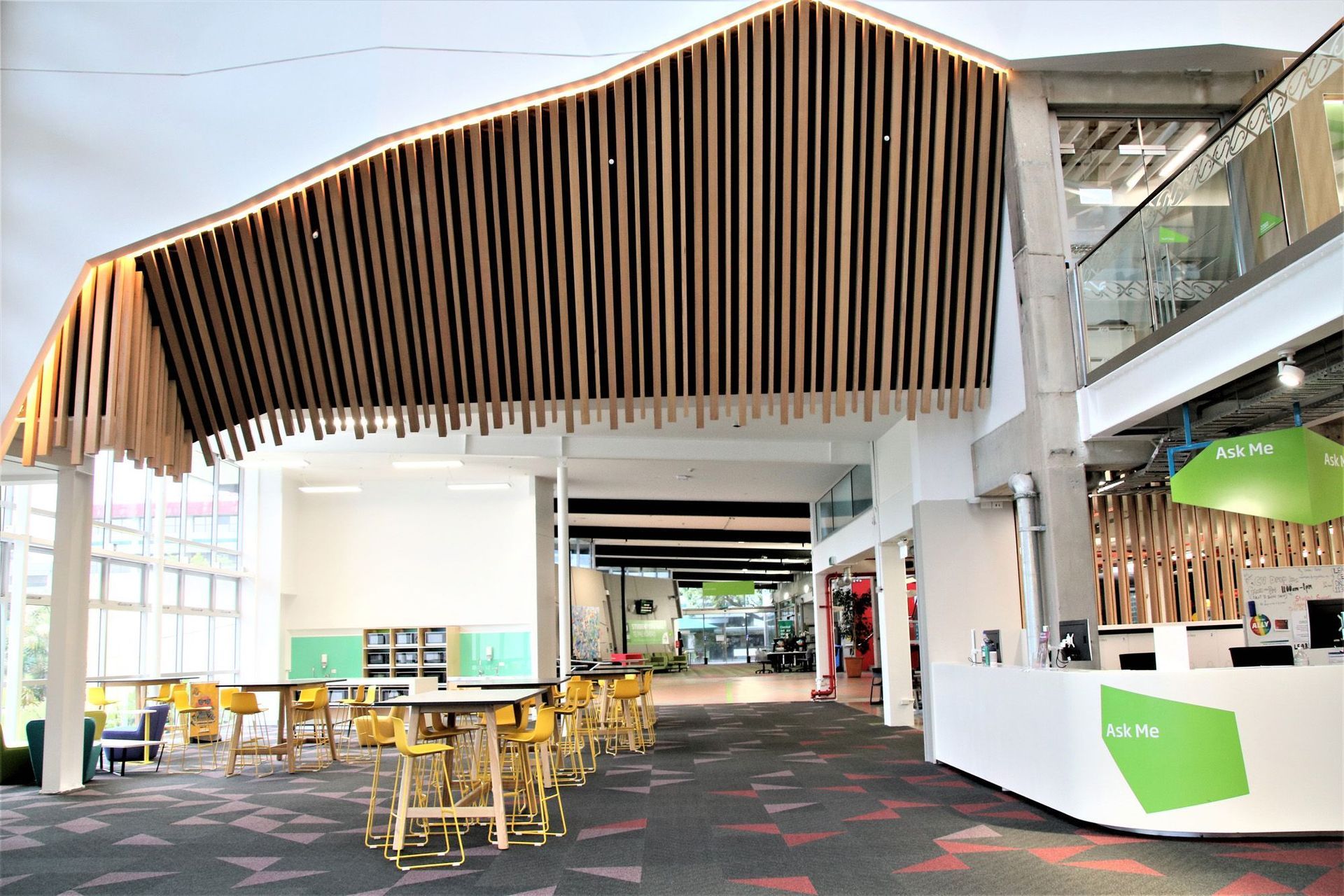 ArchiPro Project Summary - The Hub at Unitec: A $1.5M structural fit-out project featuring a modern 6,900sqm student centre with innovative design elements including exposed glue-laminated beams, diamond-shaped skylights, and a stunning living wall, completed in September 2017.