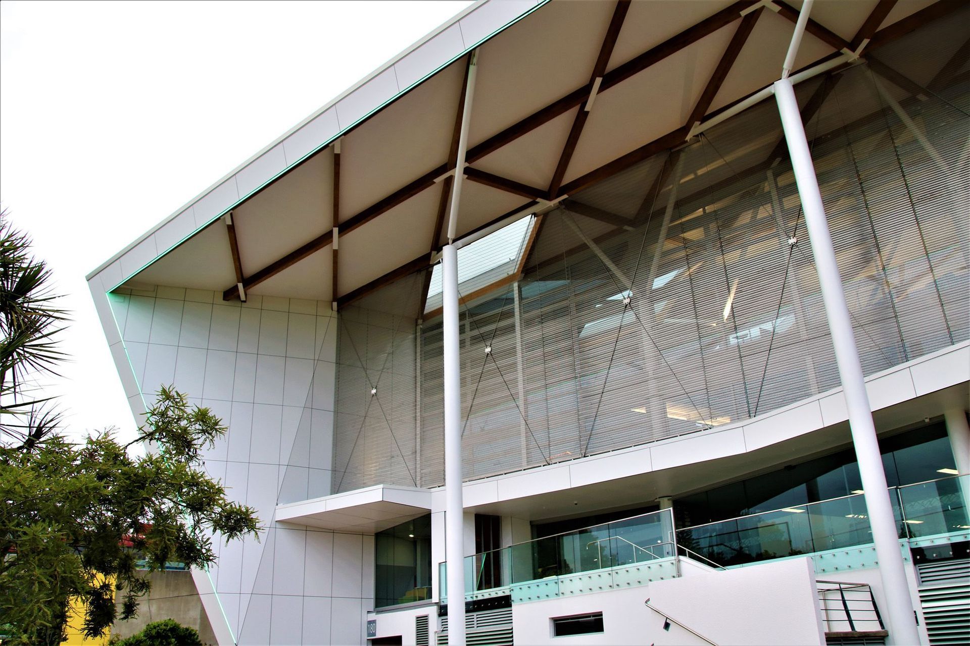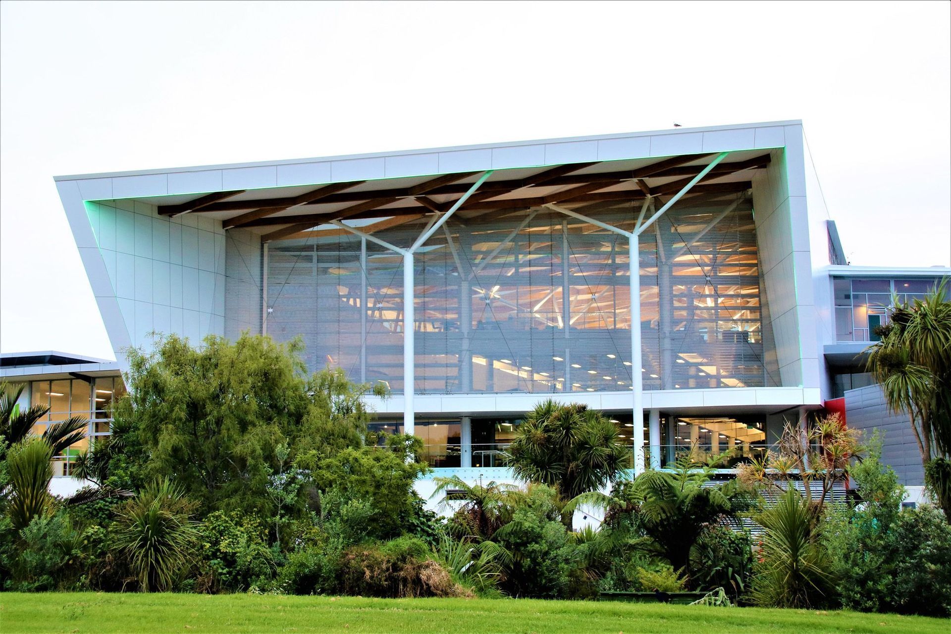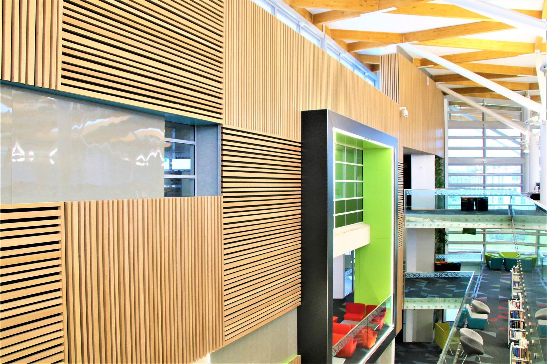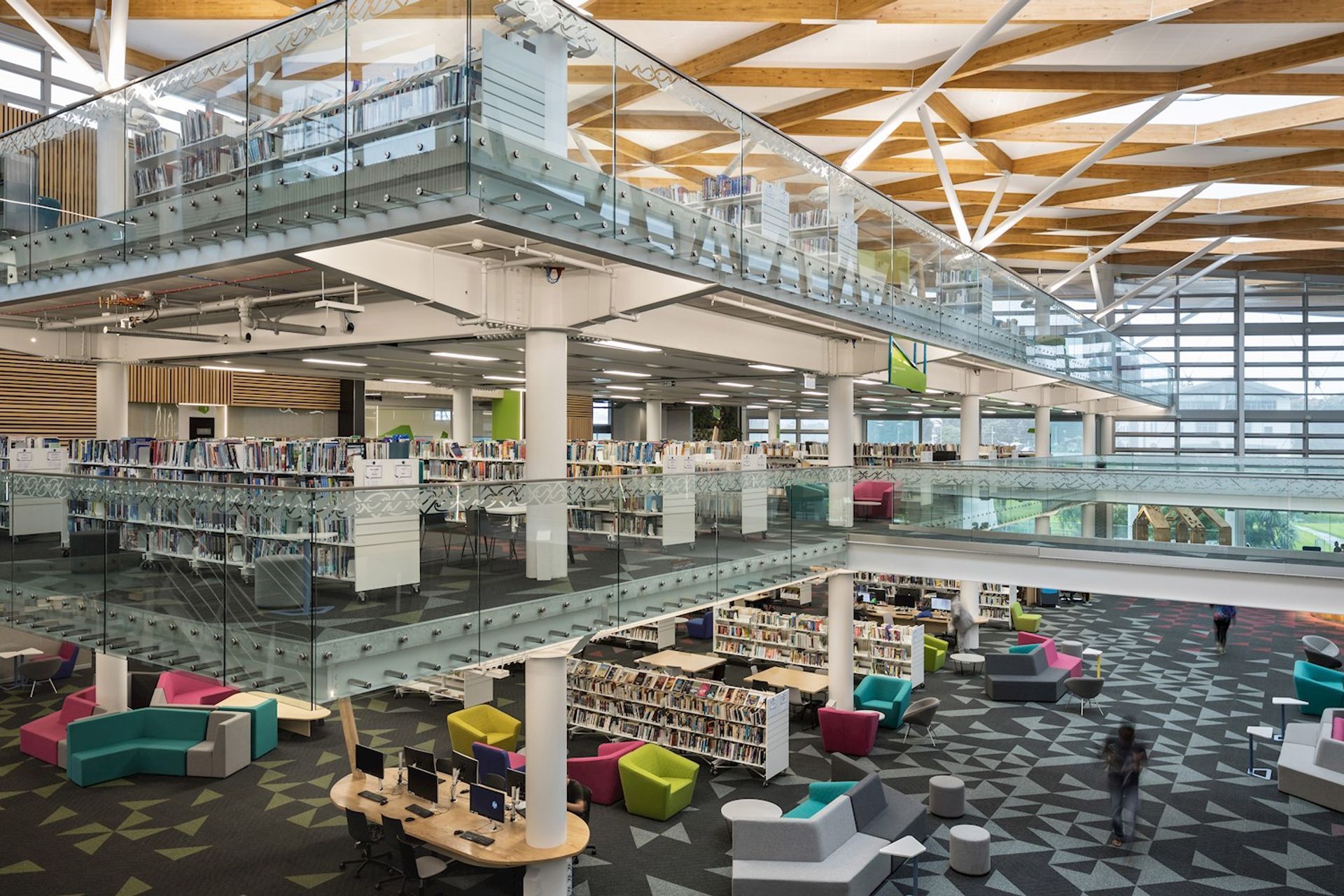 ArchiPro Project Summary - The Hub at Unitec: A $1.5M structural fit-out project featuring a modern 6,900sqm student centre with innovative design elements including exposed glue-laminated beams, diamond-shaped skylights, and a stunning living wall, completed in September 2017.