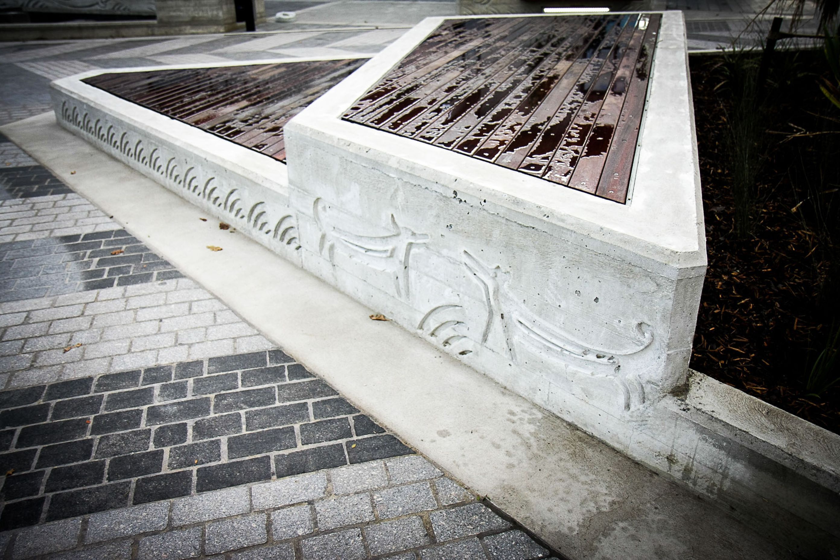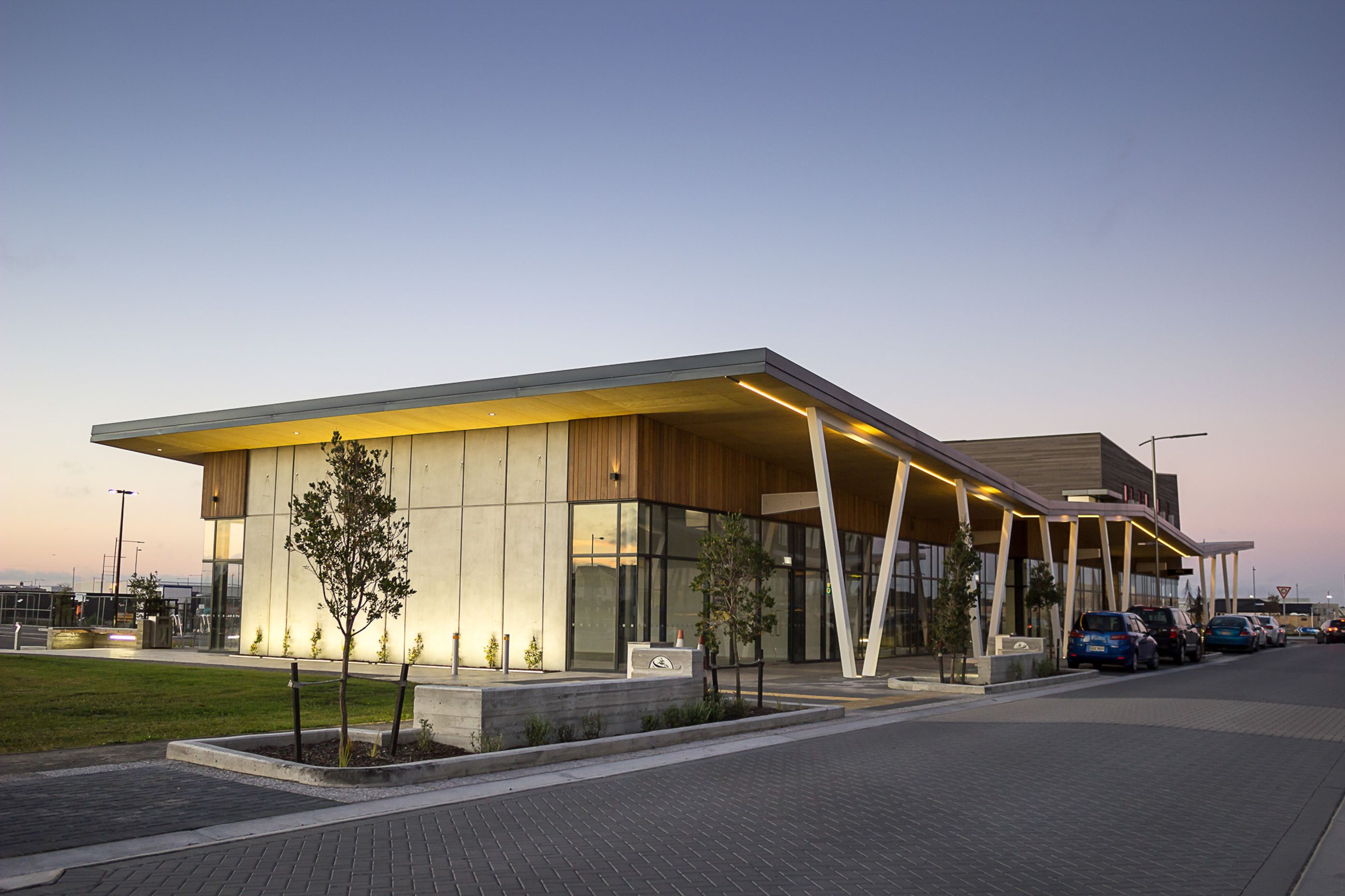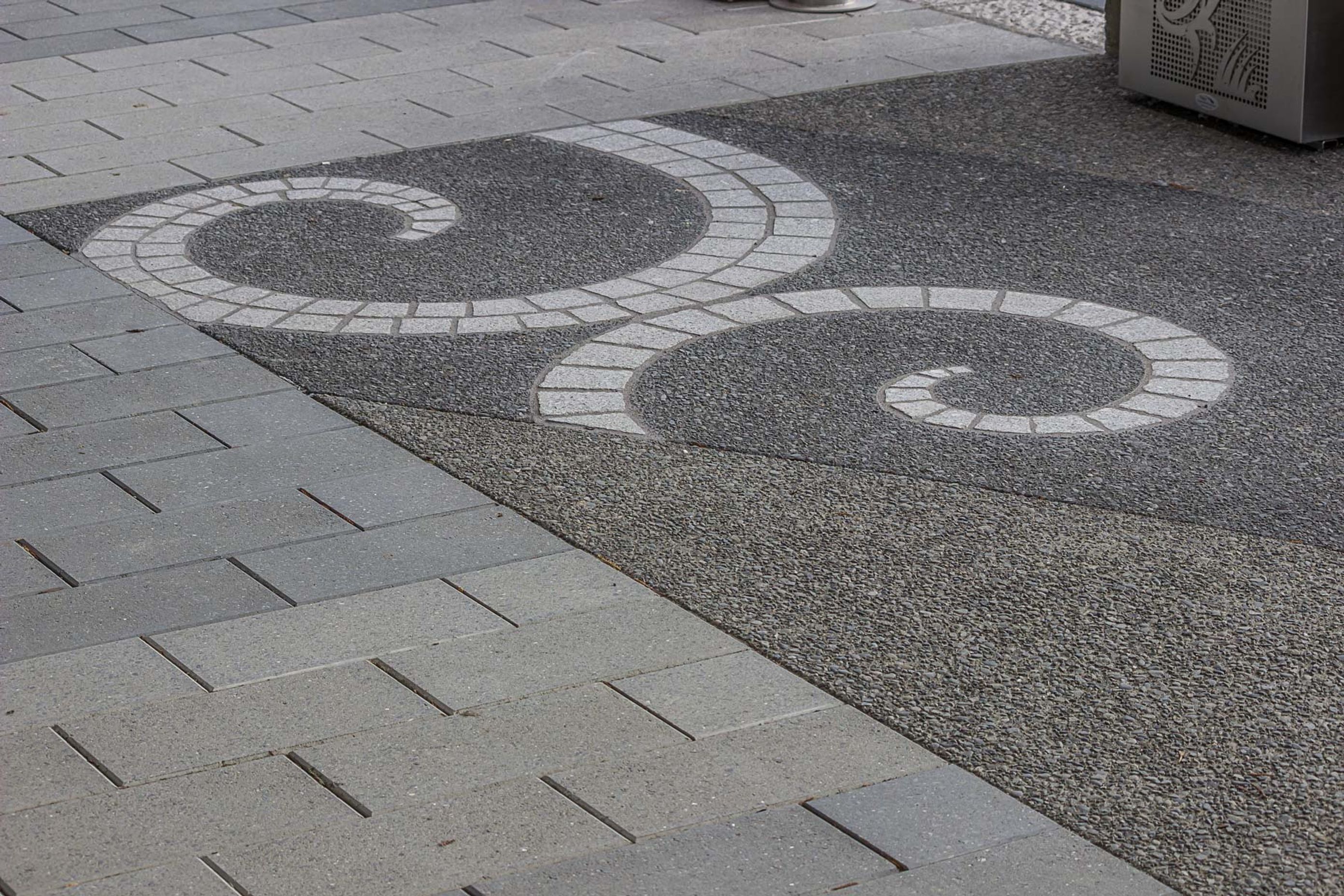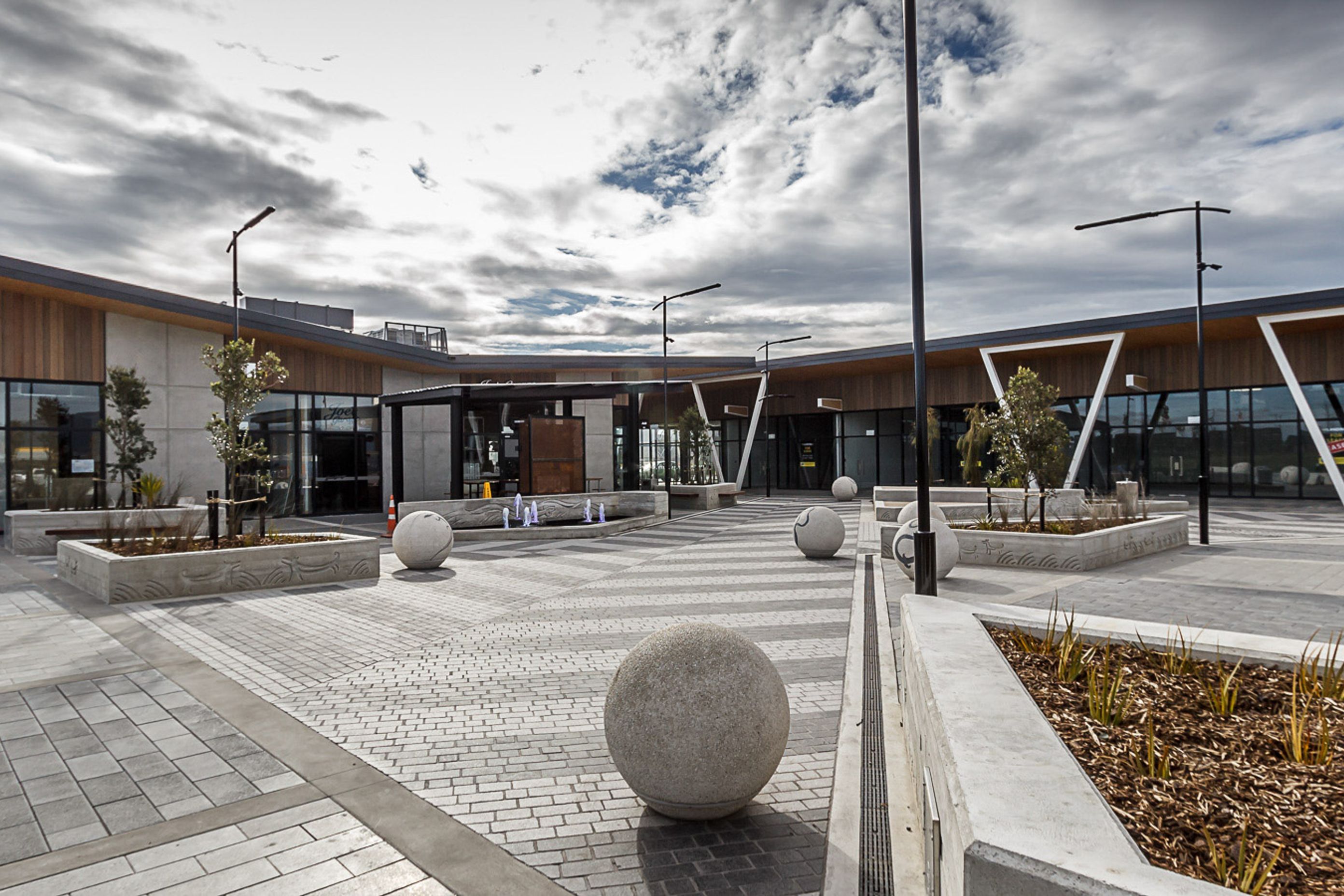 ArchiPro Project Summary - The Landing Town Centre: A vibrant mixed-use development featuring retail and office spaces, designed by Kamo Marsh Landscape Architects in collaboration with a multidisciplinary project team, complemented by artworks from Priscilla Cowie.