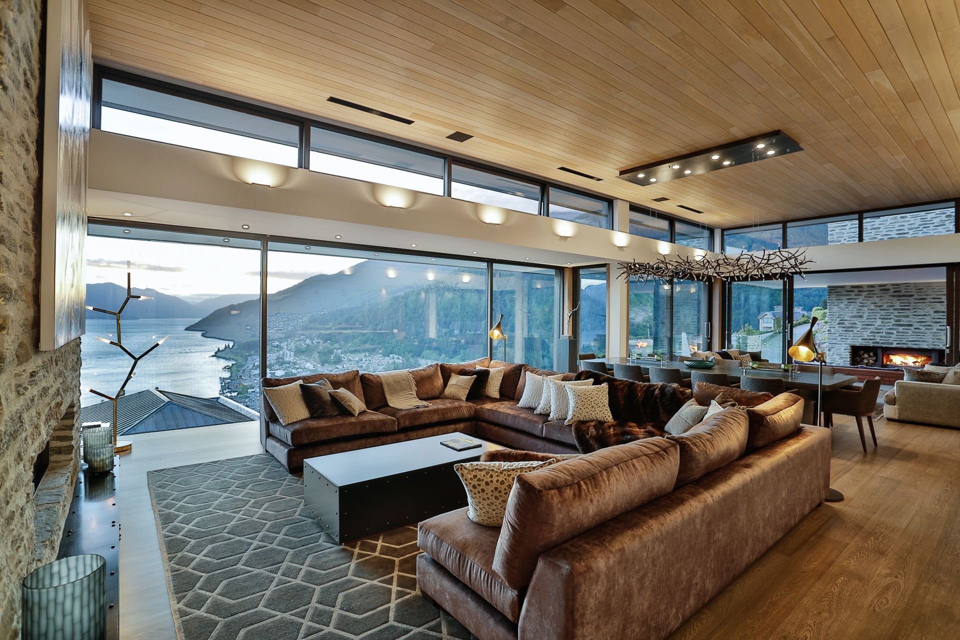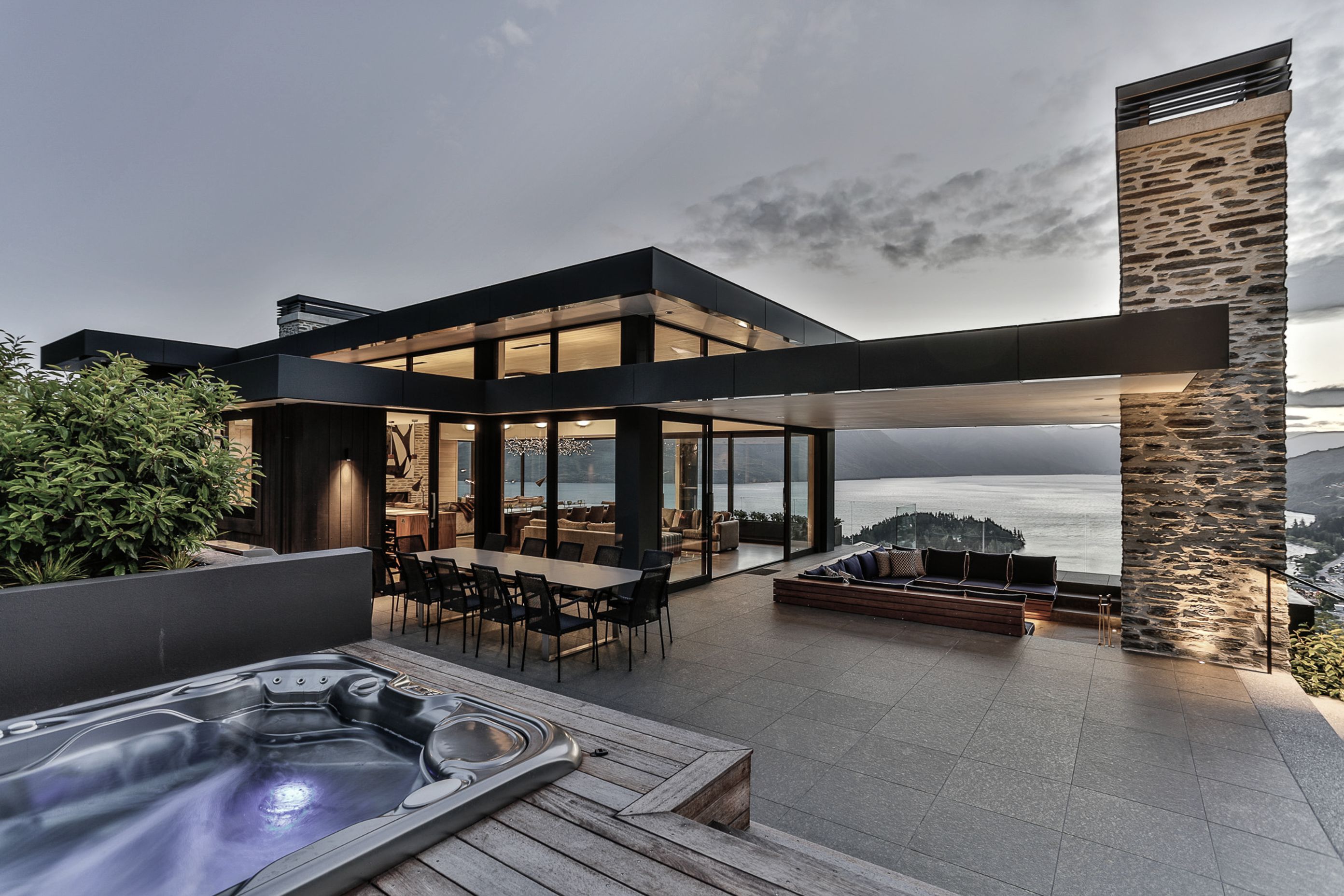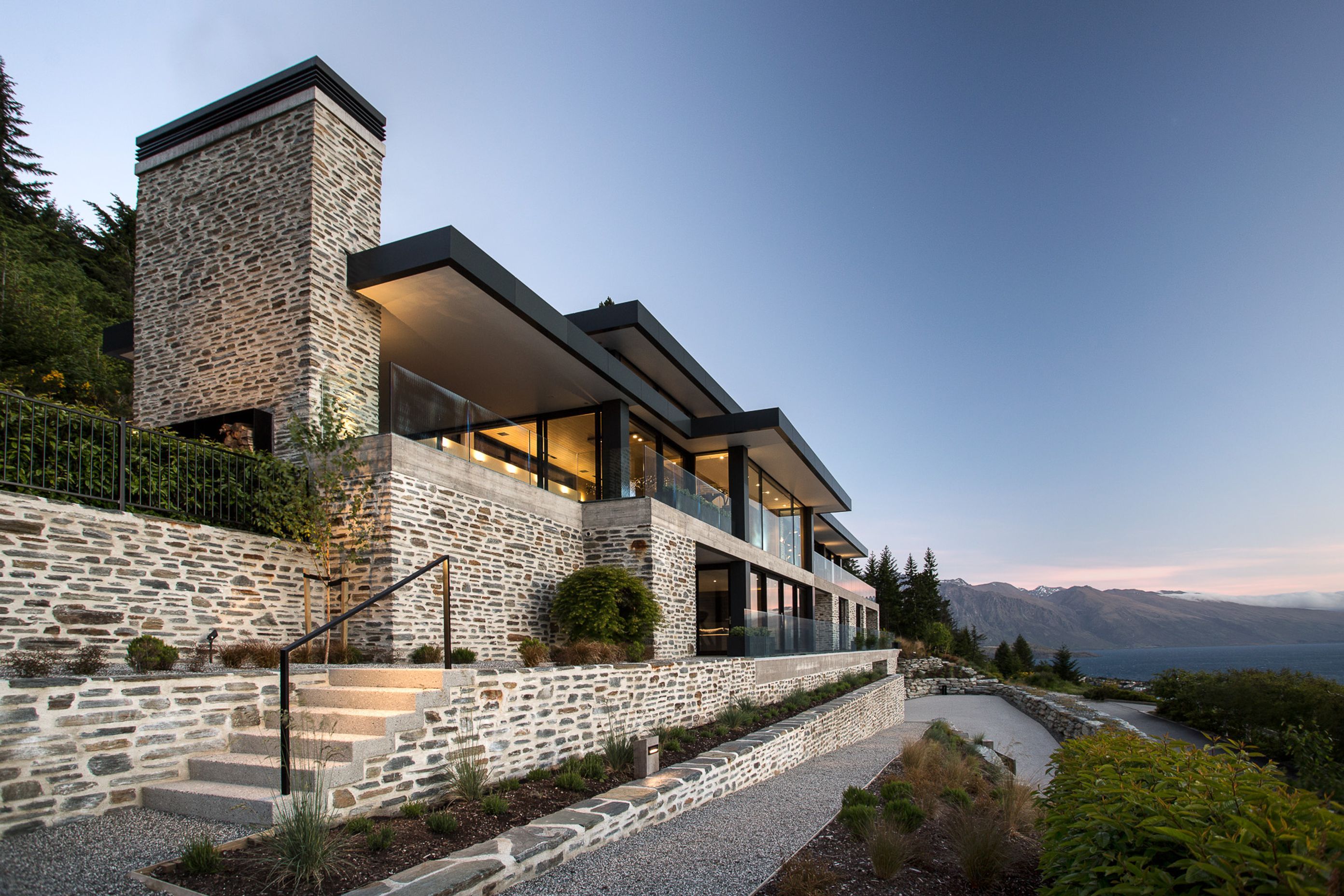 ArchiPro Project Summary - Luxurious split-level family home on Queenstown Hill, designed to maximize solar gain and stunning lake views, featuring six bedrooms, extensive living areas, and a striking exterior of schist and concrete.