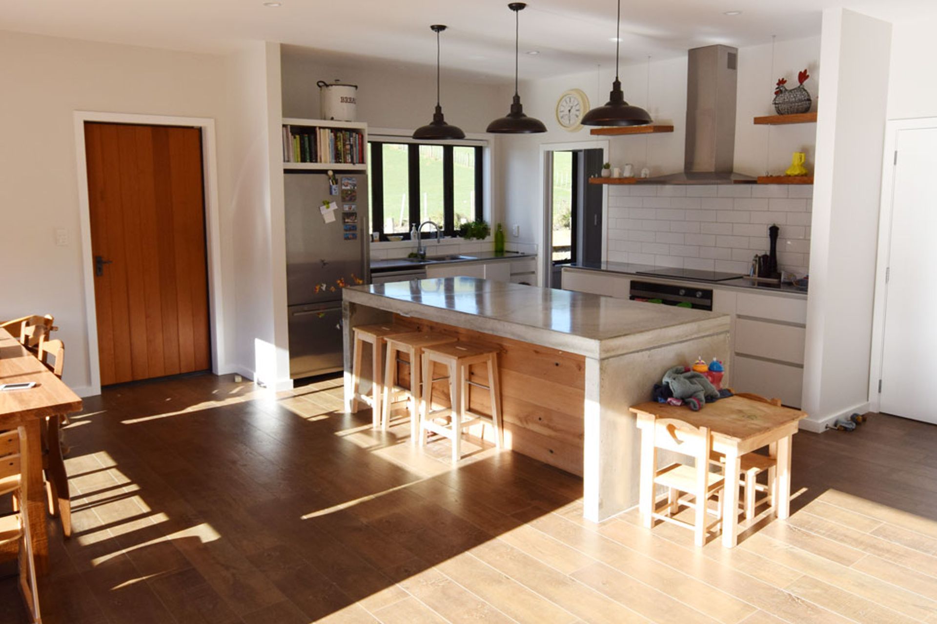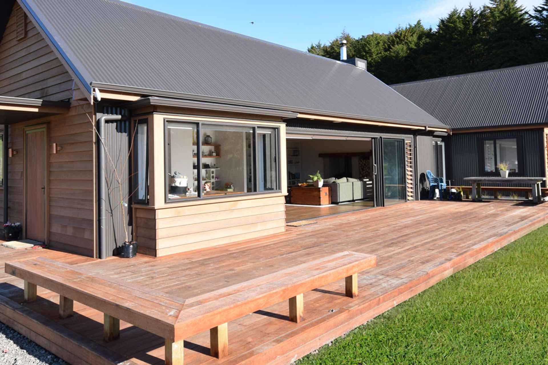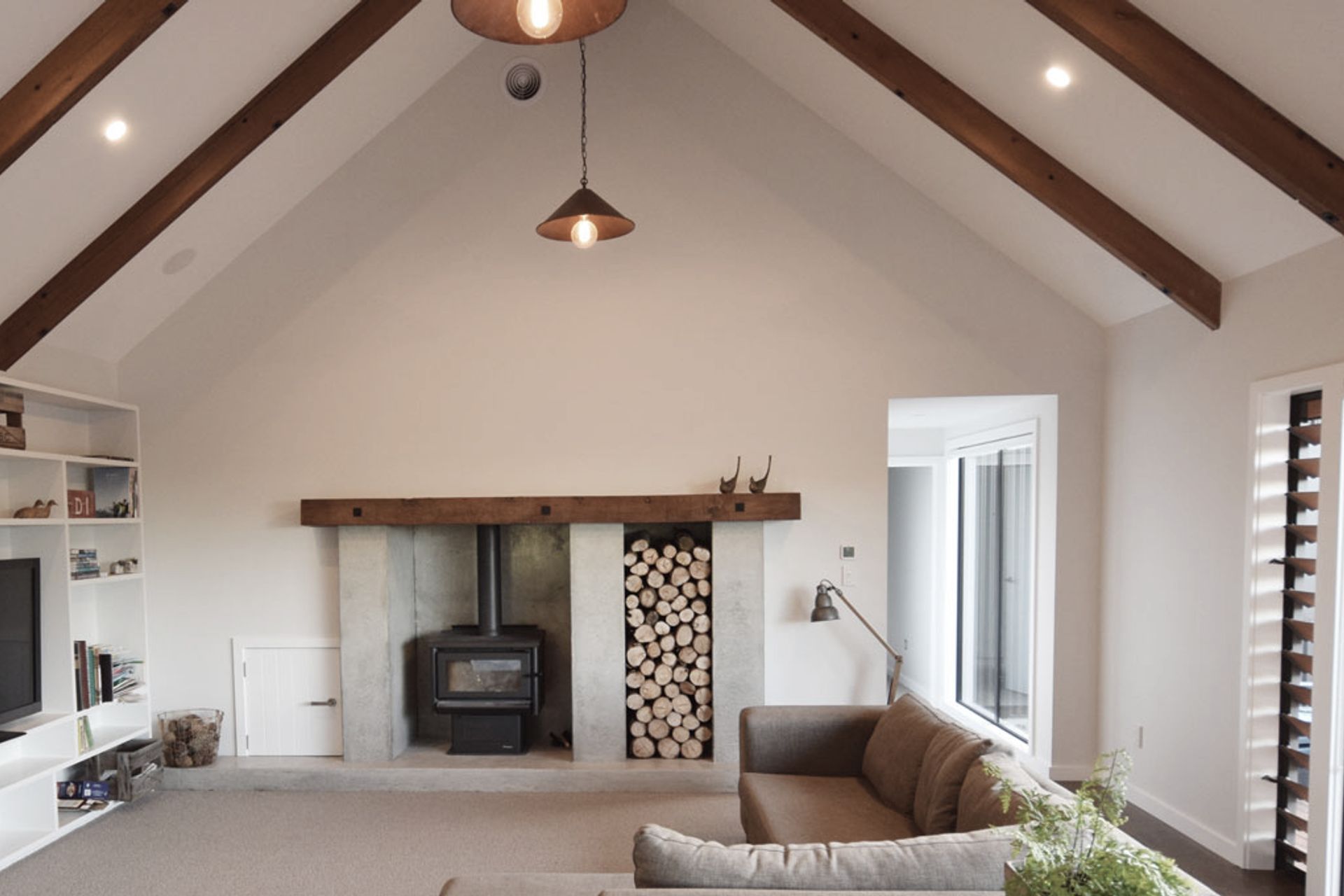 ArchiPro Project Summary - A beautifully designed country home for a young family, nestled among scenic pine trees, featuring cedar weatherboard cladding, Colorsteel corrugate, and a unique solid concrete fire surround that retains warmth long after the fire has diminished.