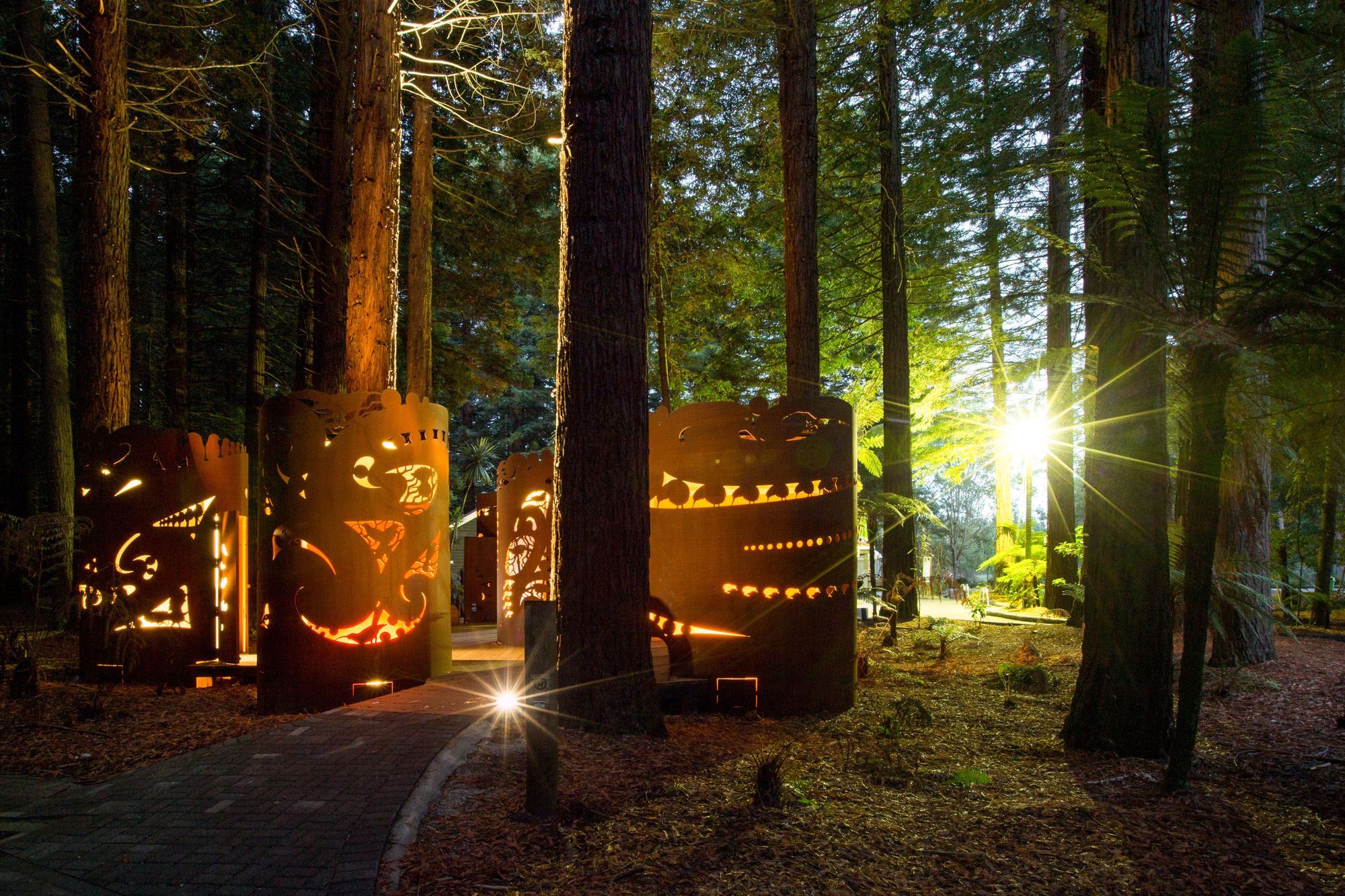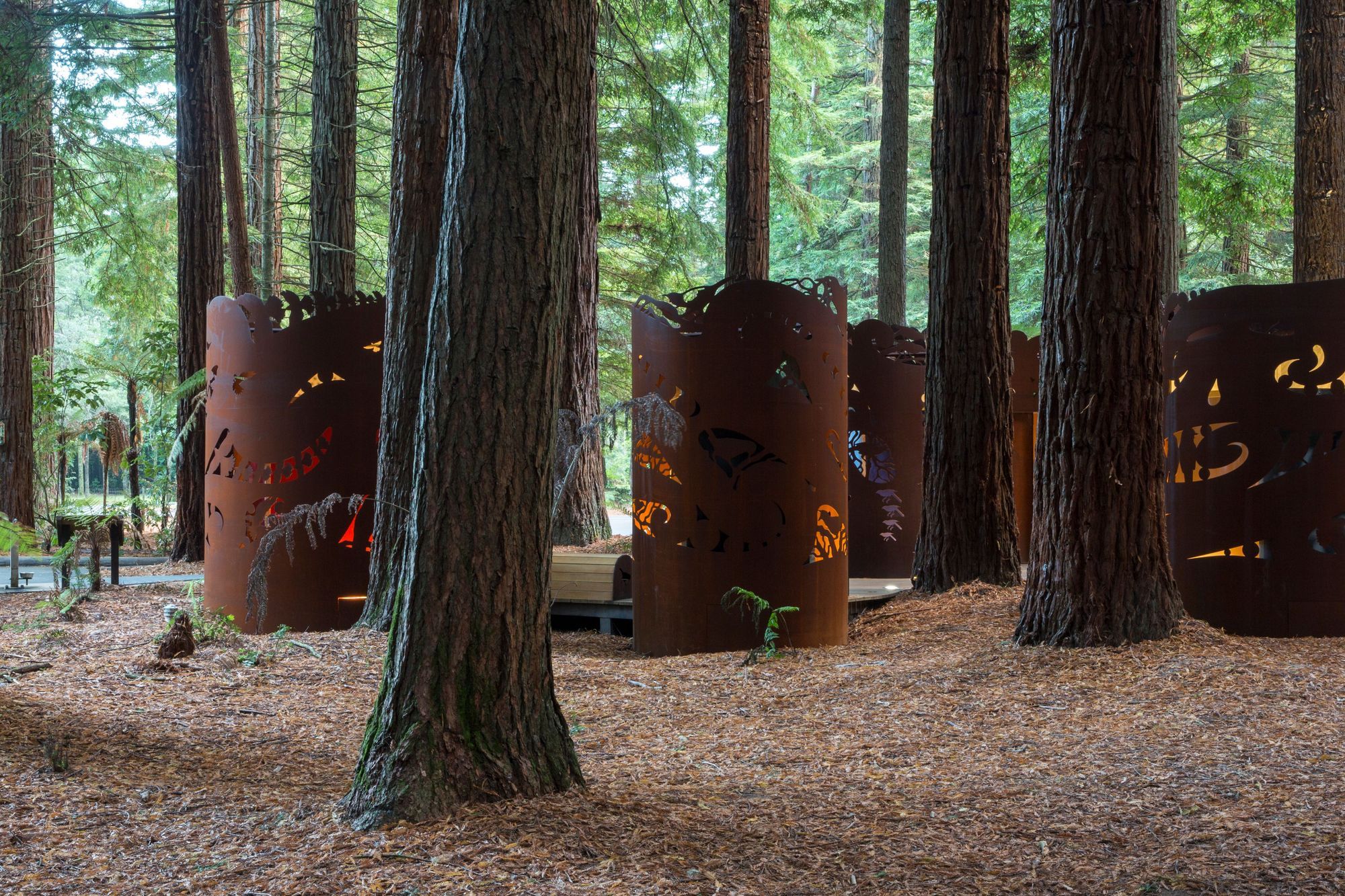 ArchiPro Project Summary - The Redwoods Toilets: A unique blend of functionality and public art, harmonizing with the natural landscape through corten steel shrouds and indigenous-inspired graphic patterns by artist Kereama Taepa, set in a historic park.