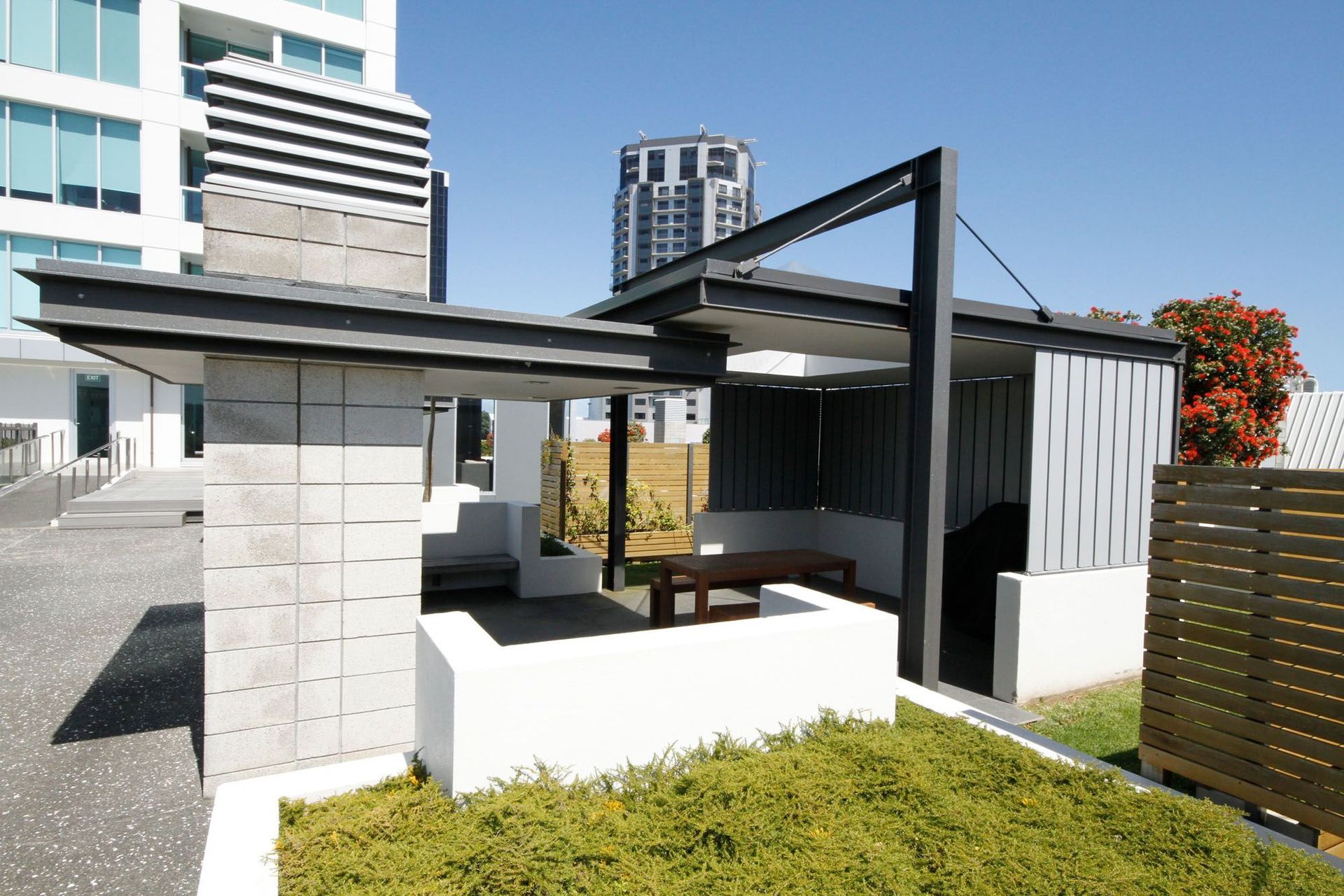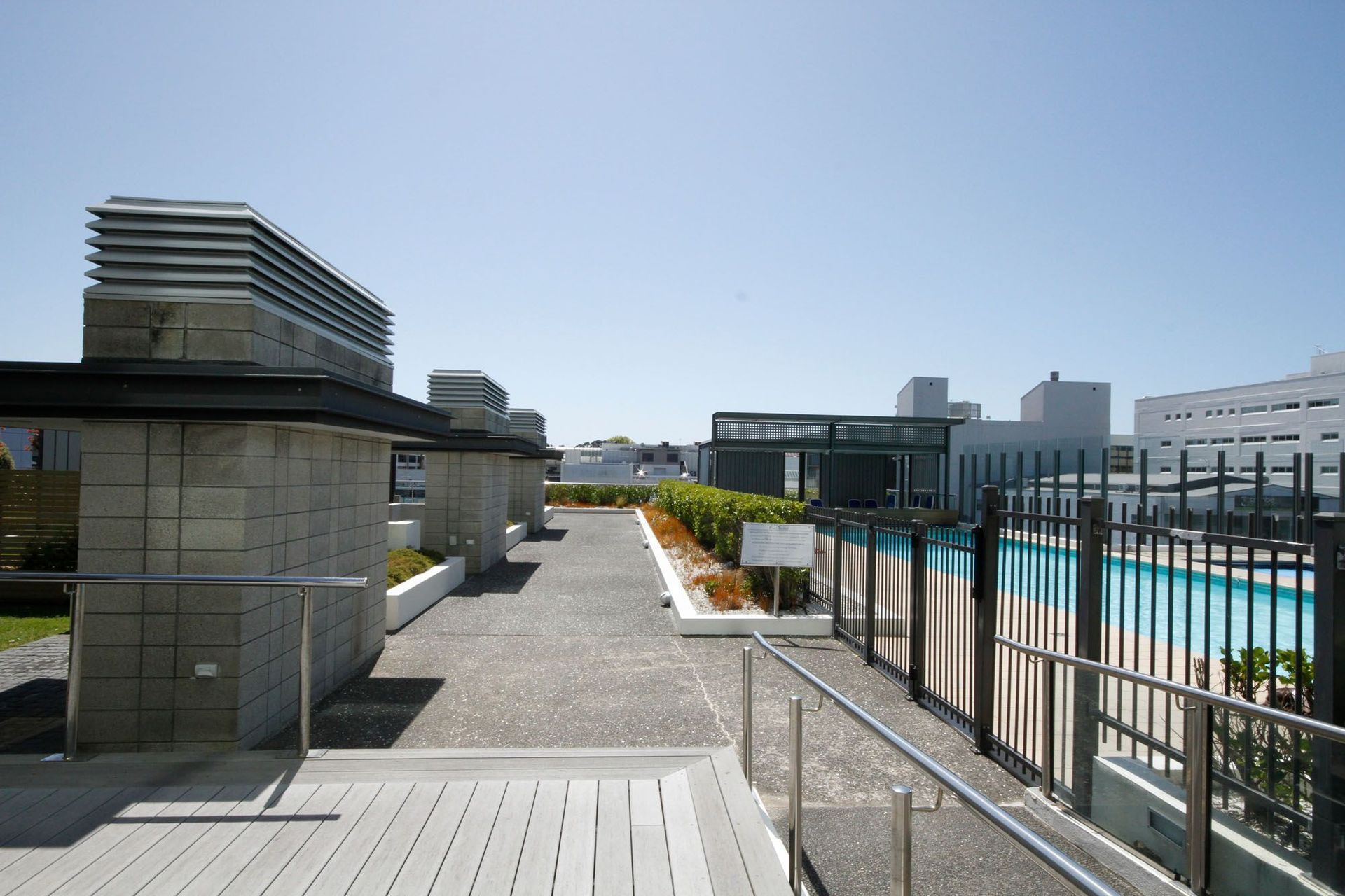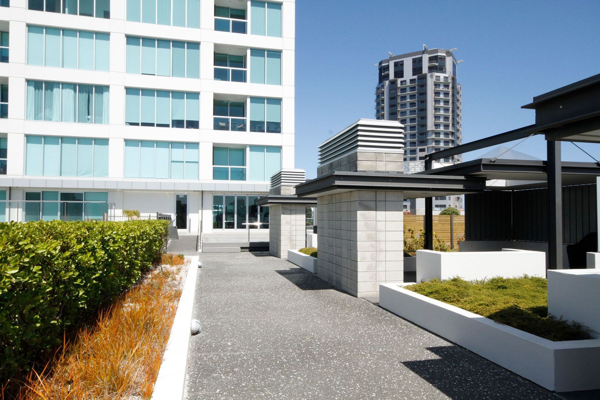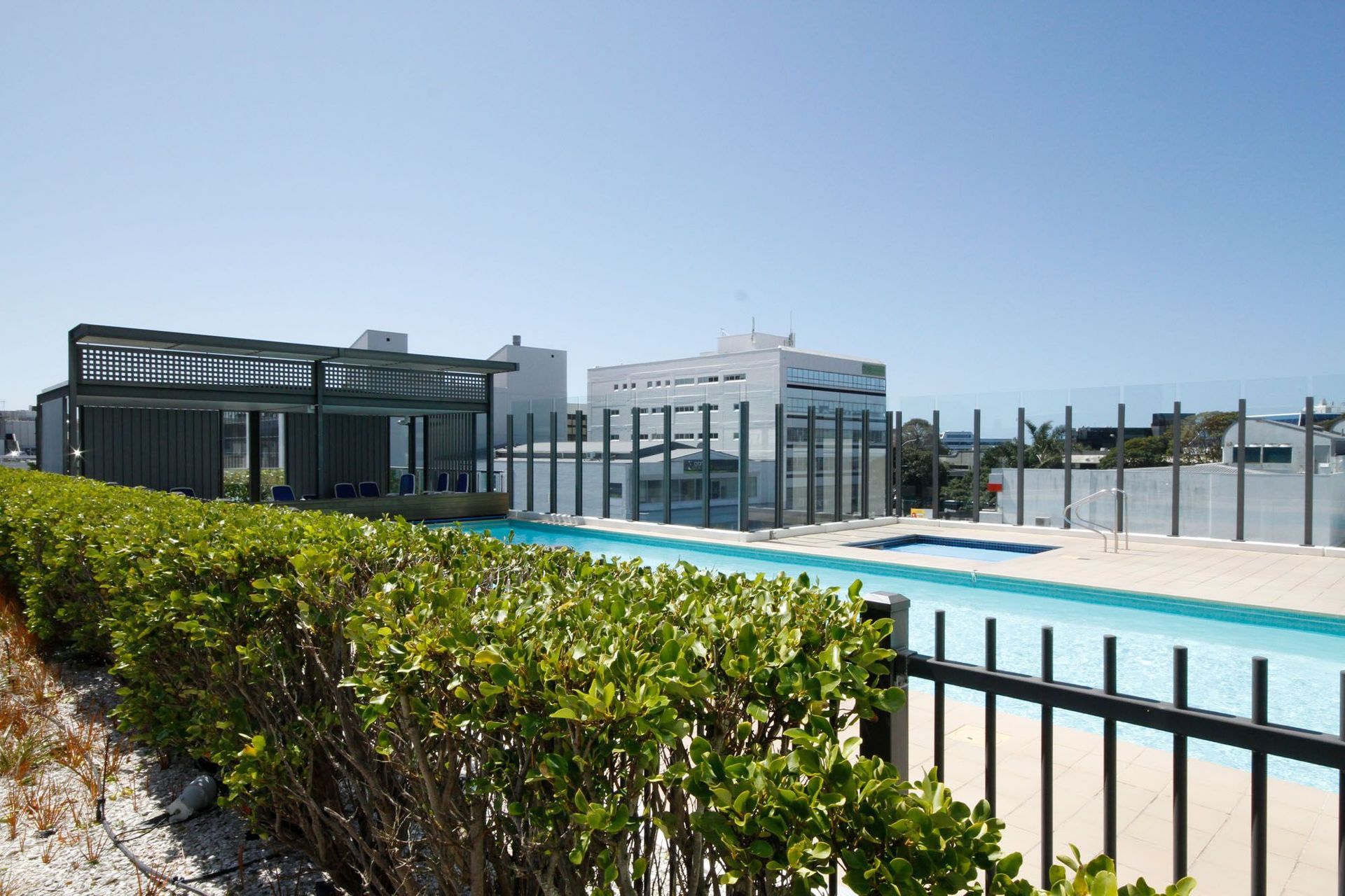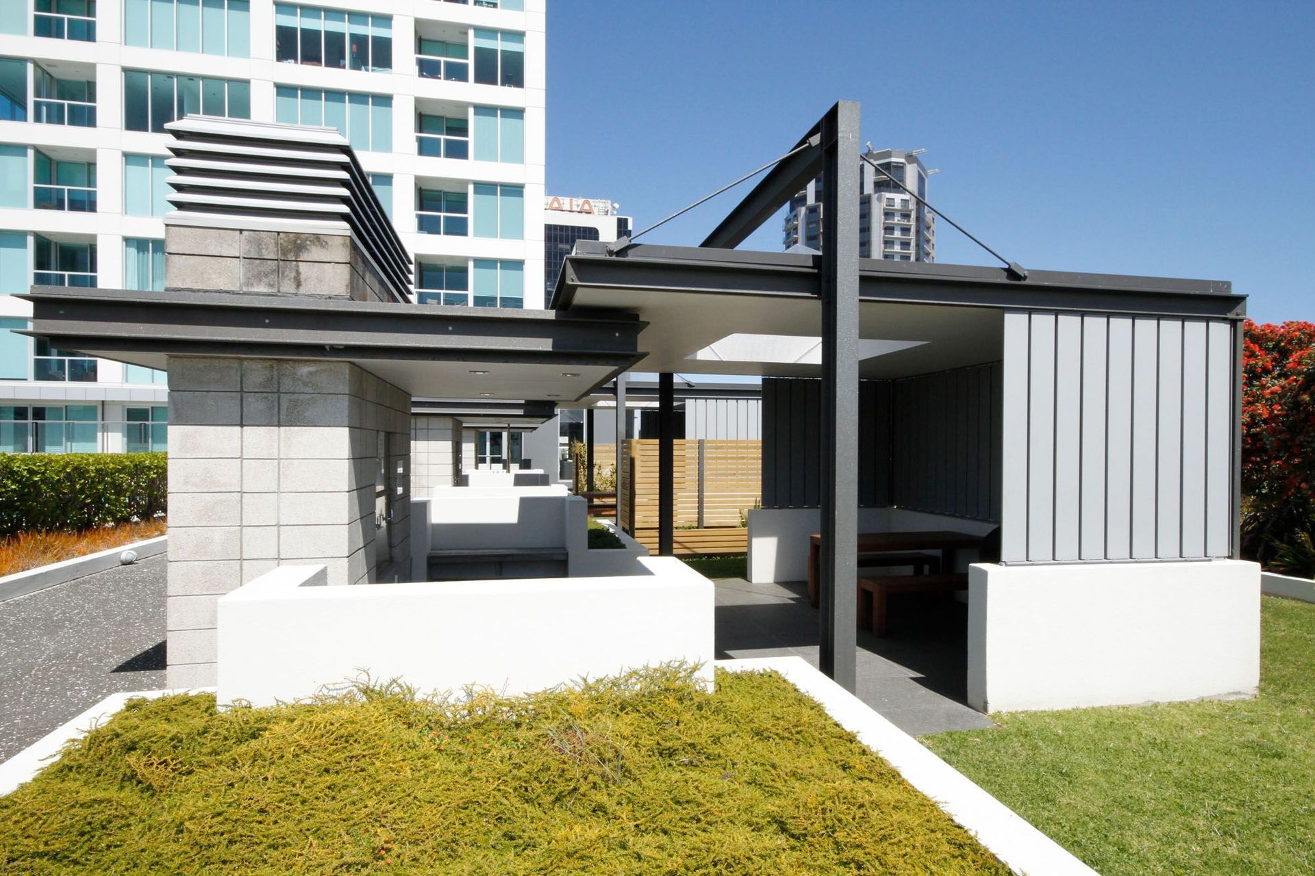 ArchiPro Project Summary - The Sentinel Tower: A luxury residential skyscraper on Auckland's North Shore, featuring upgraded communal areas with sheltered spaces and protective glass wind barriers around the heated swimming pool.