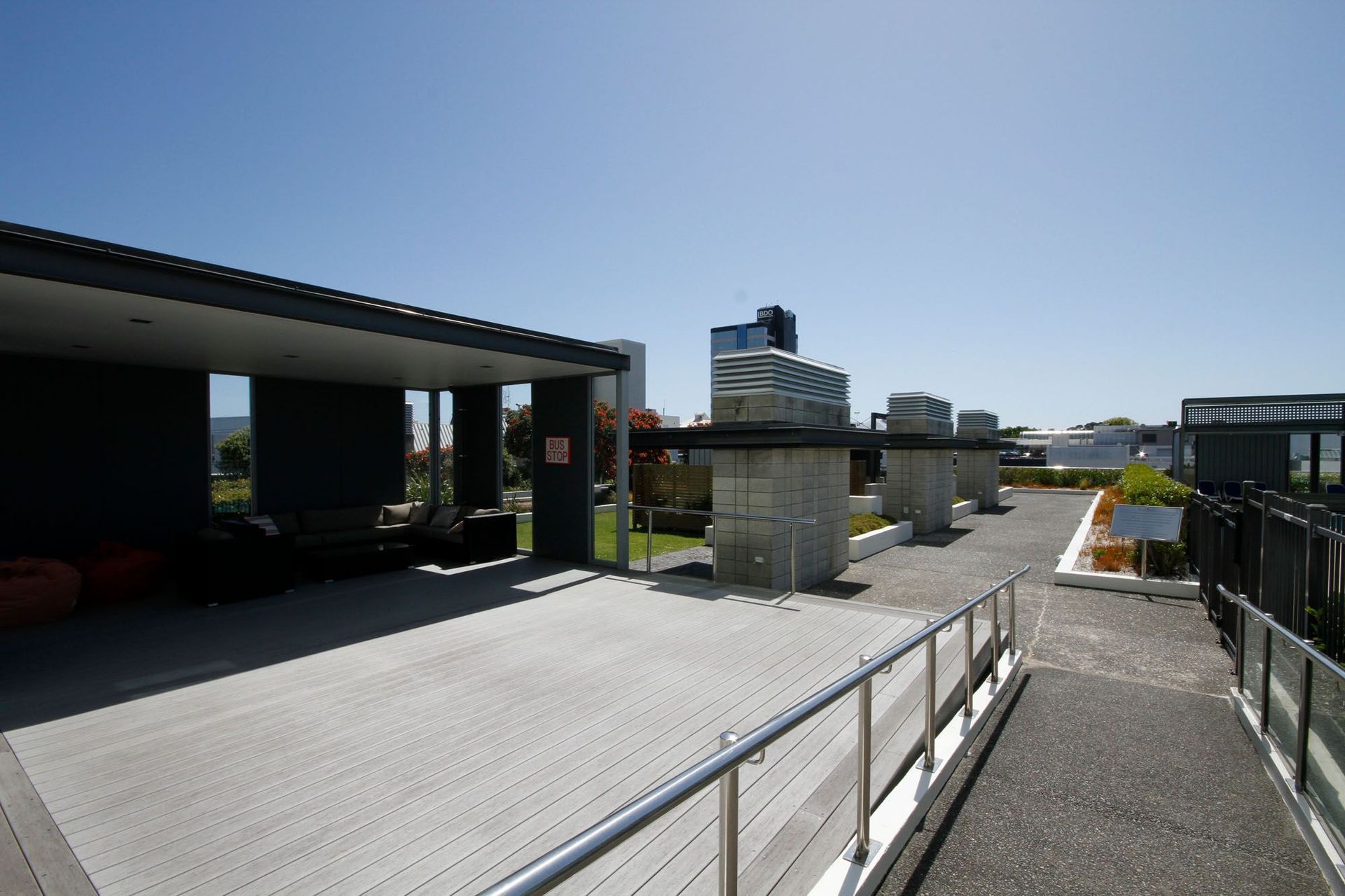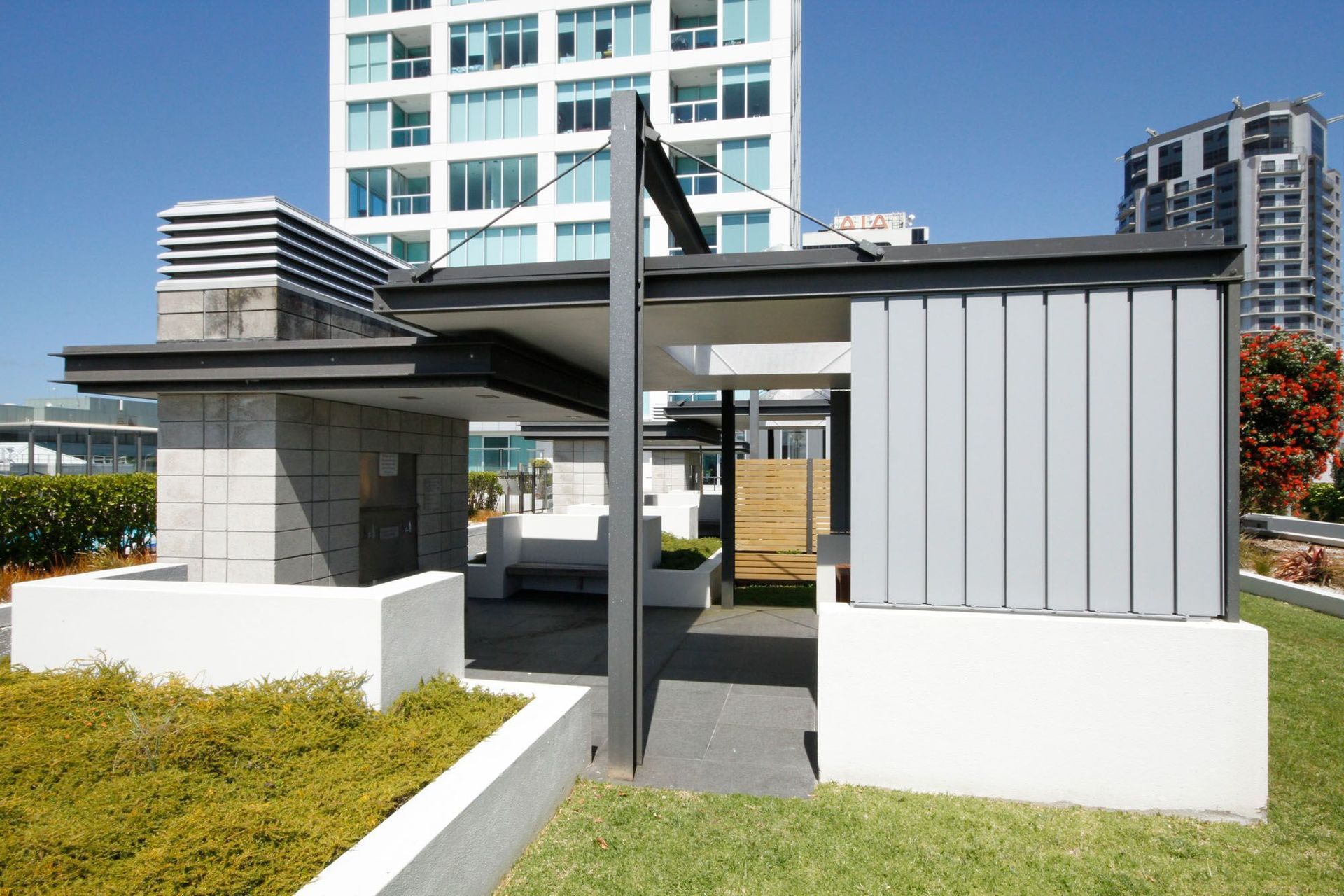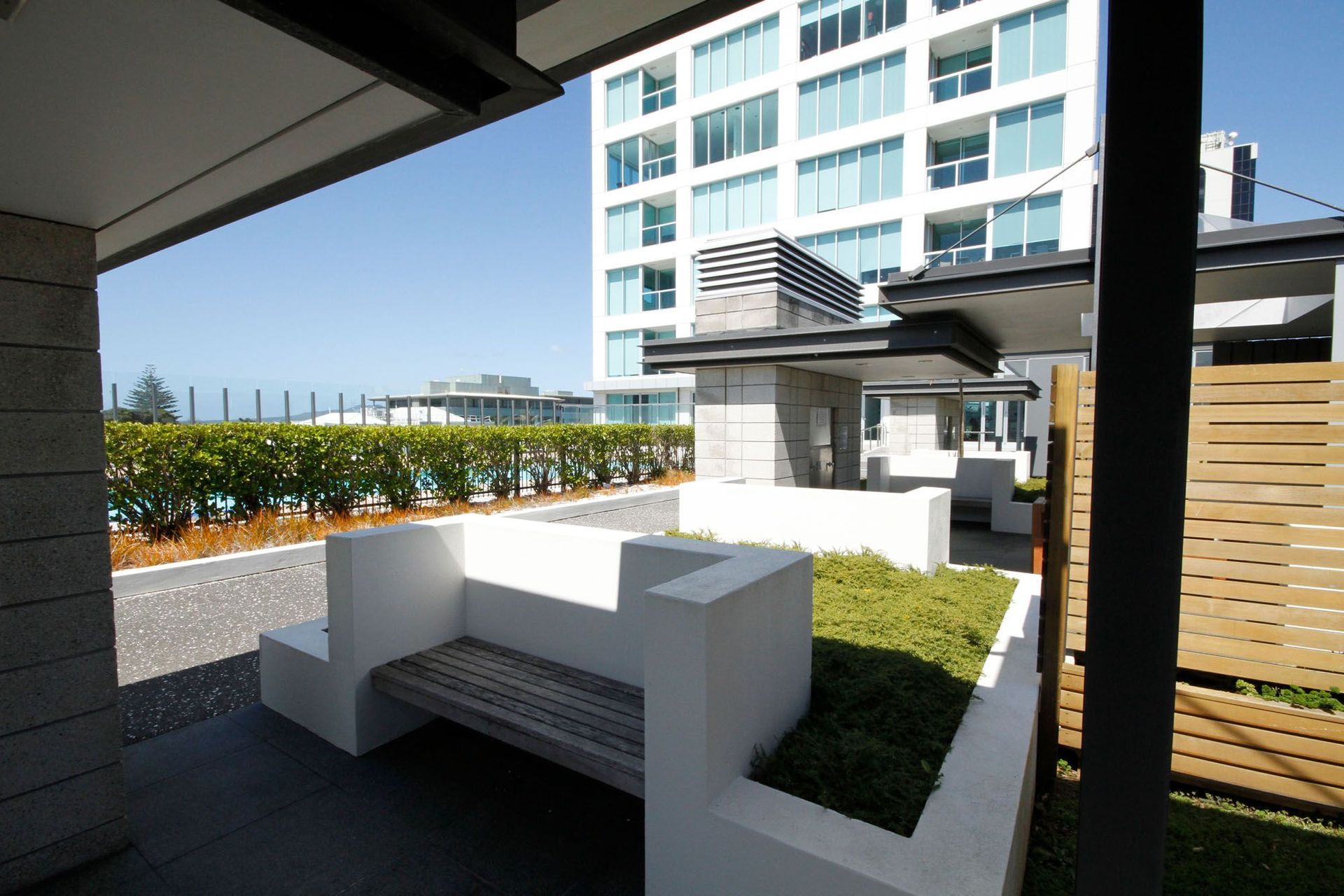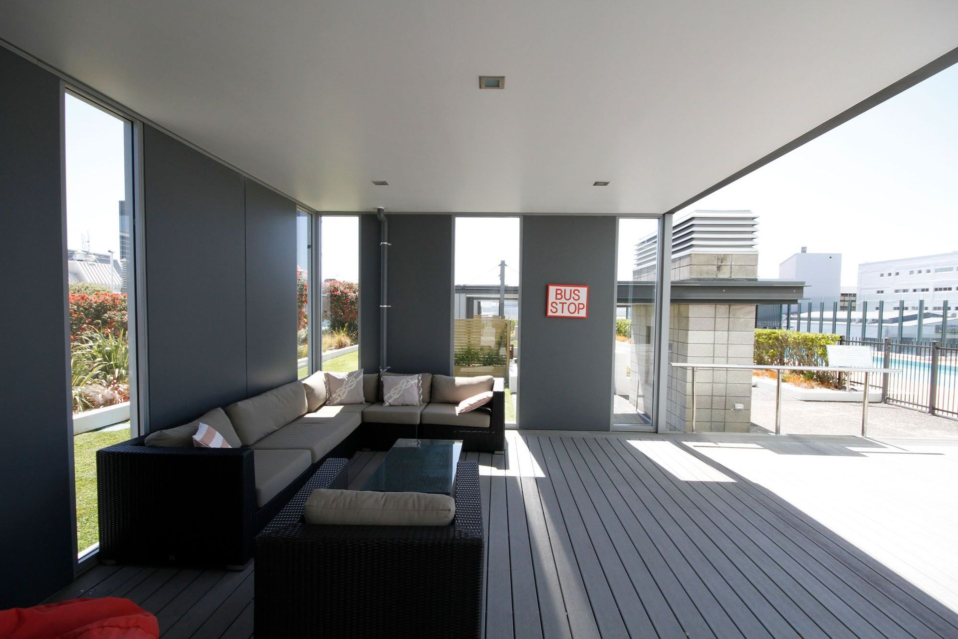 ArchiPro Project Summary - The Sentinel Tower: A luxury residential skyscraper on Auckland's North Shore, featuring upgraded communal areas with sheltered spaces and protective glass wind barriers around the heated swimming pool.