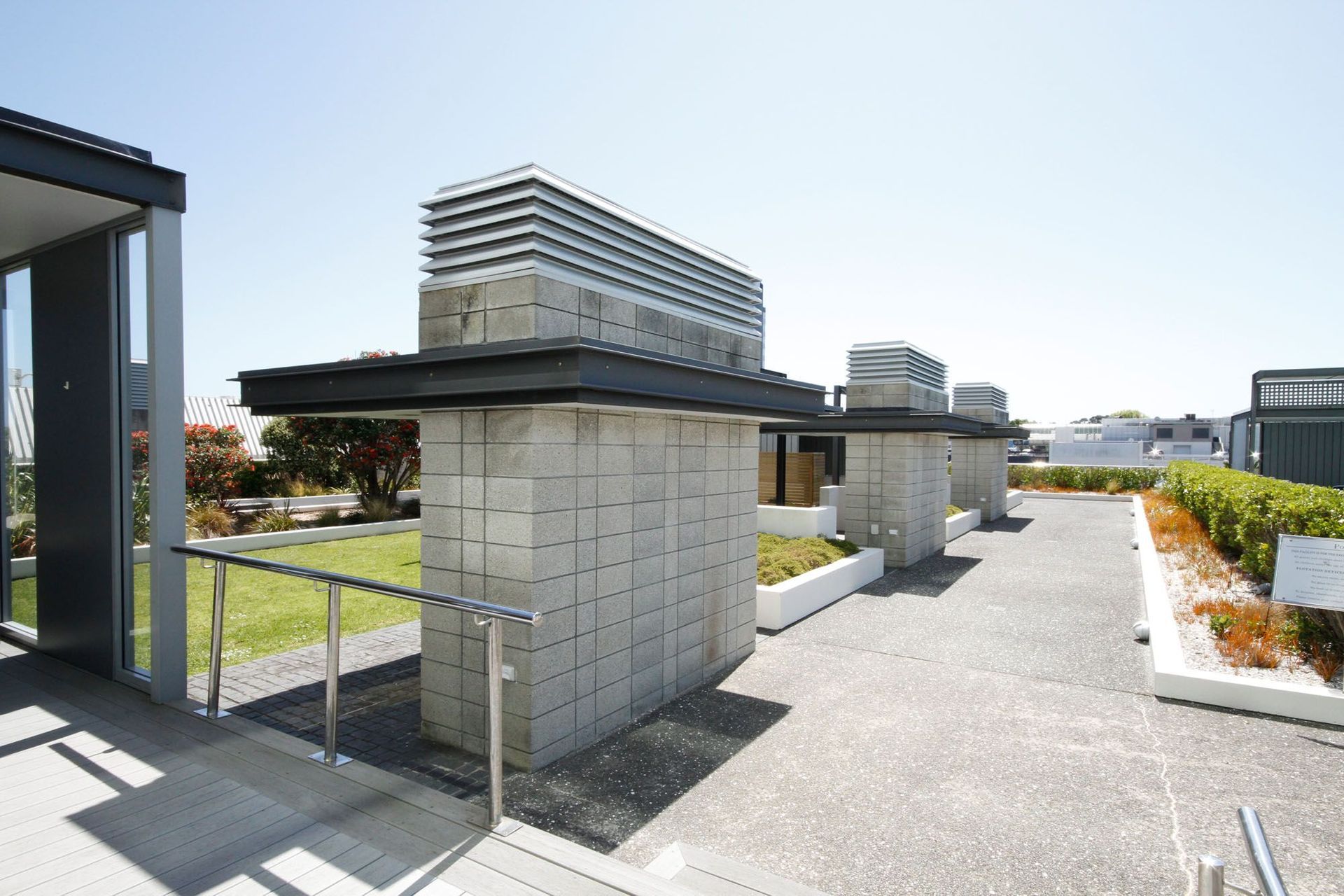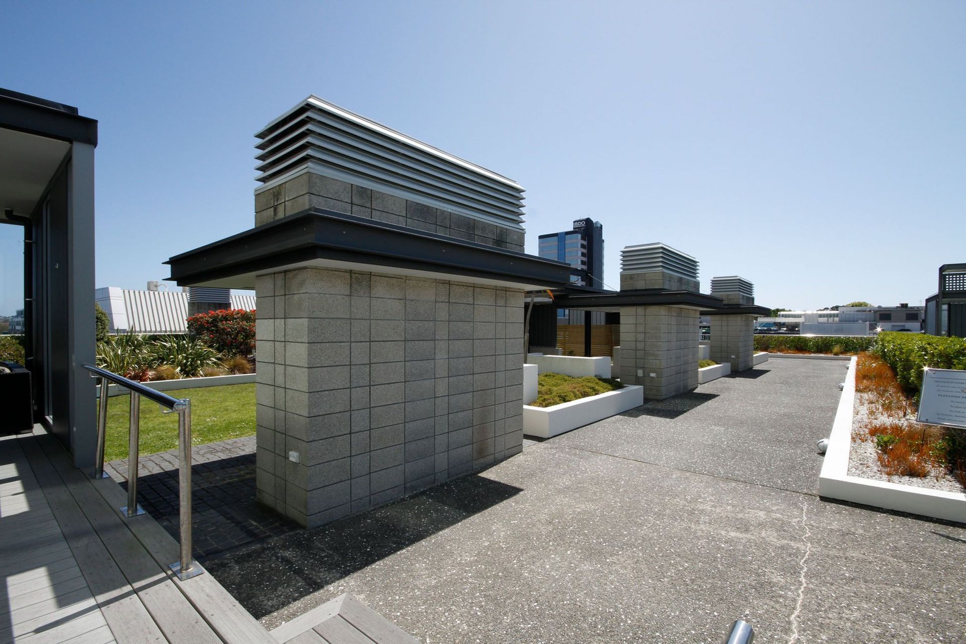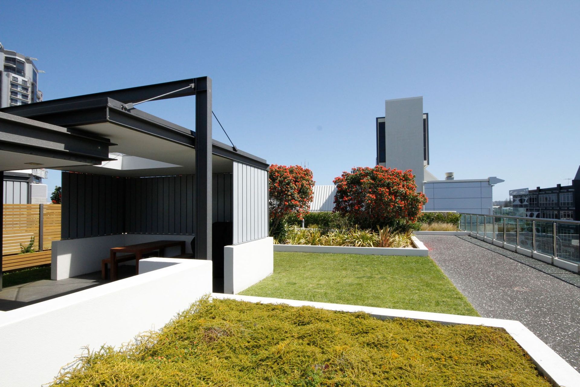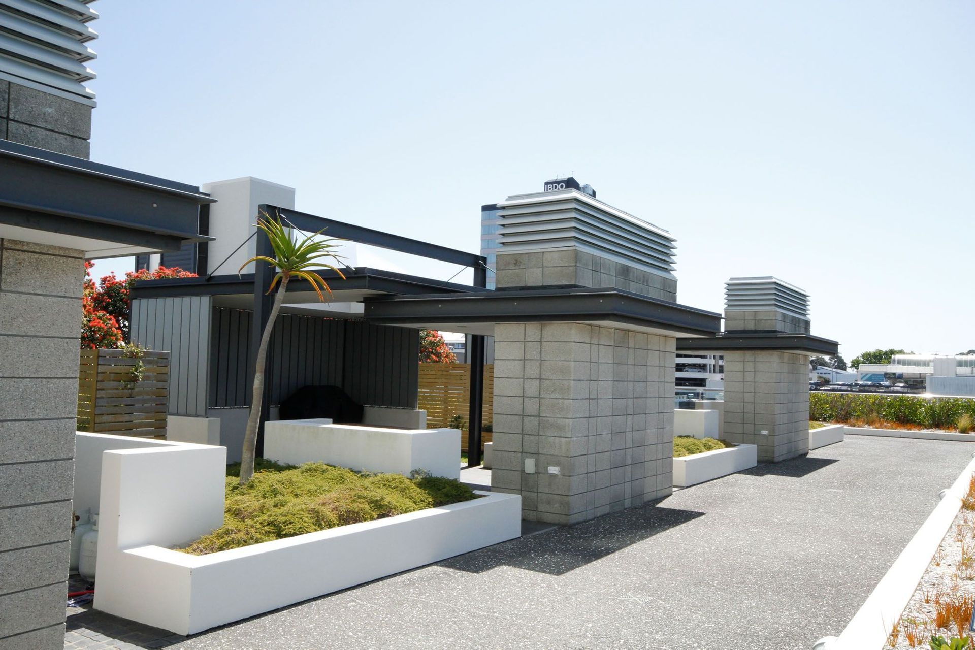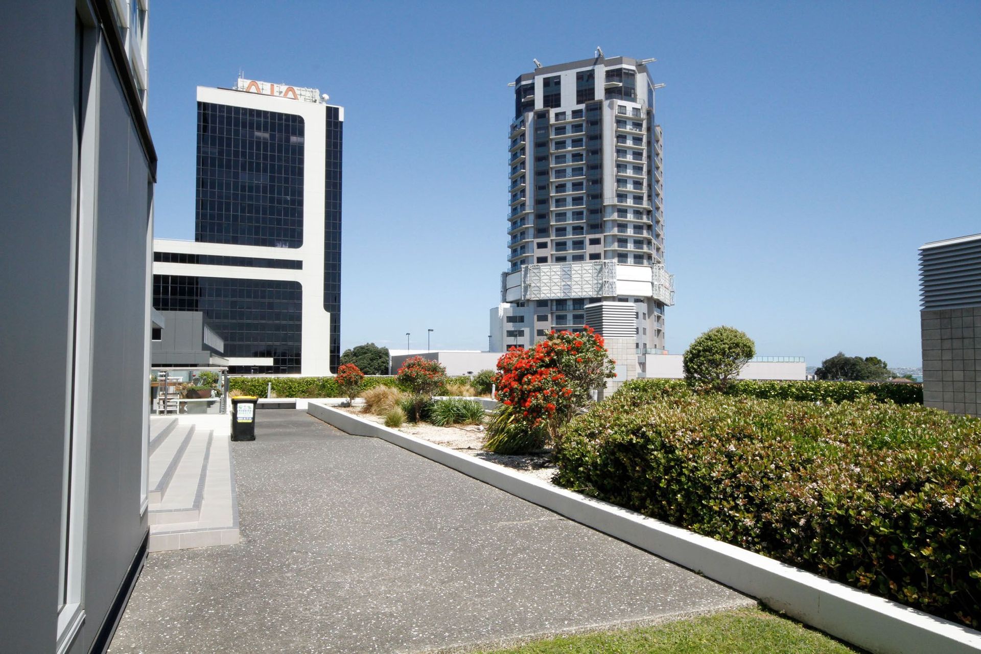 ArchiPro Project Summary - The Sentinel Tower: A luxury residential skyscraper on Auckland's North Shore, featuring upgraded communal areas with sheltered spaces and protective glass wind barriers around the heated swimming pool.