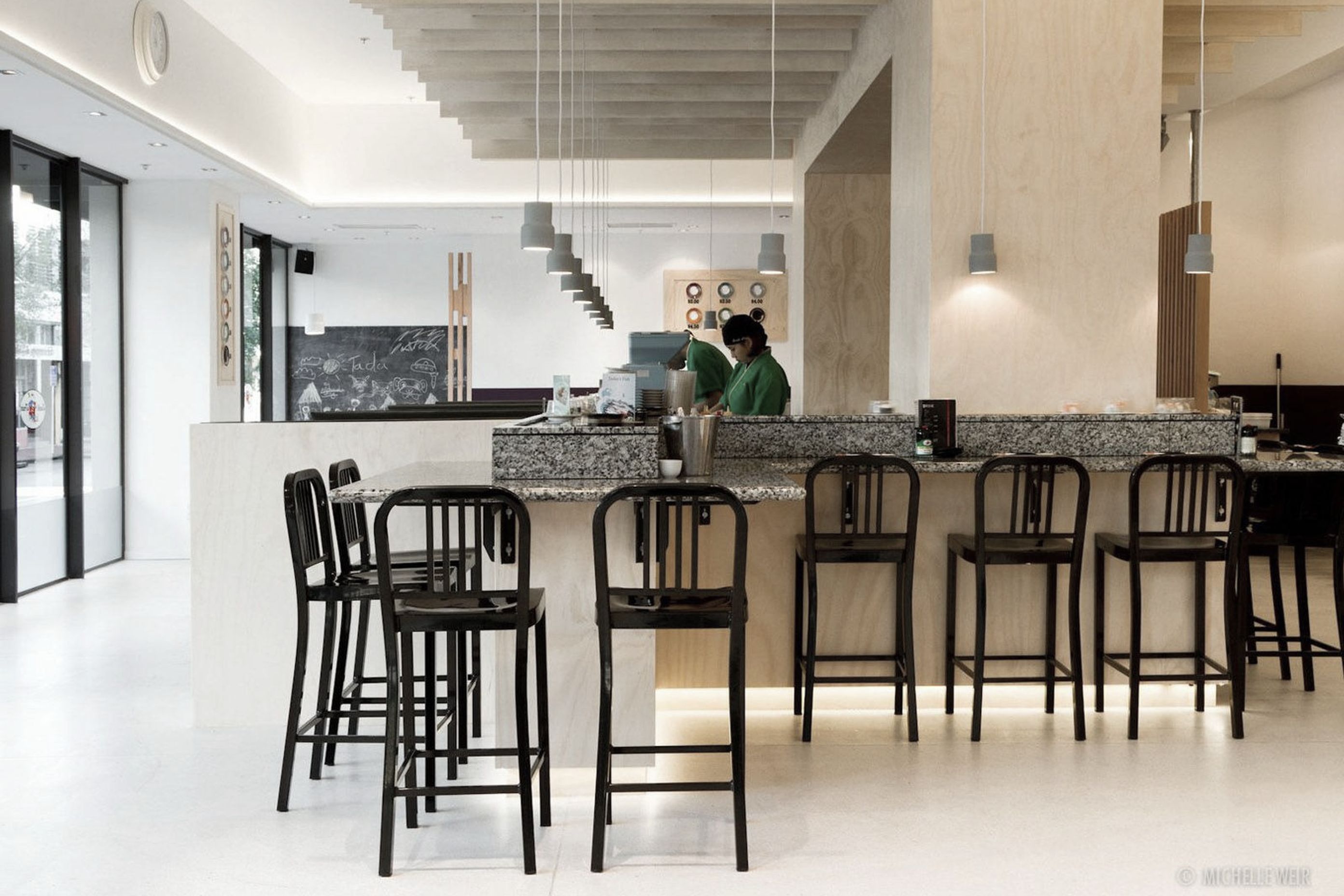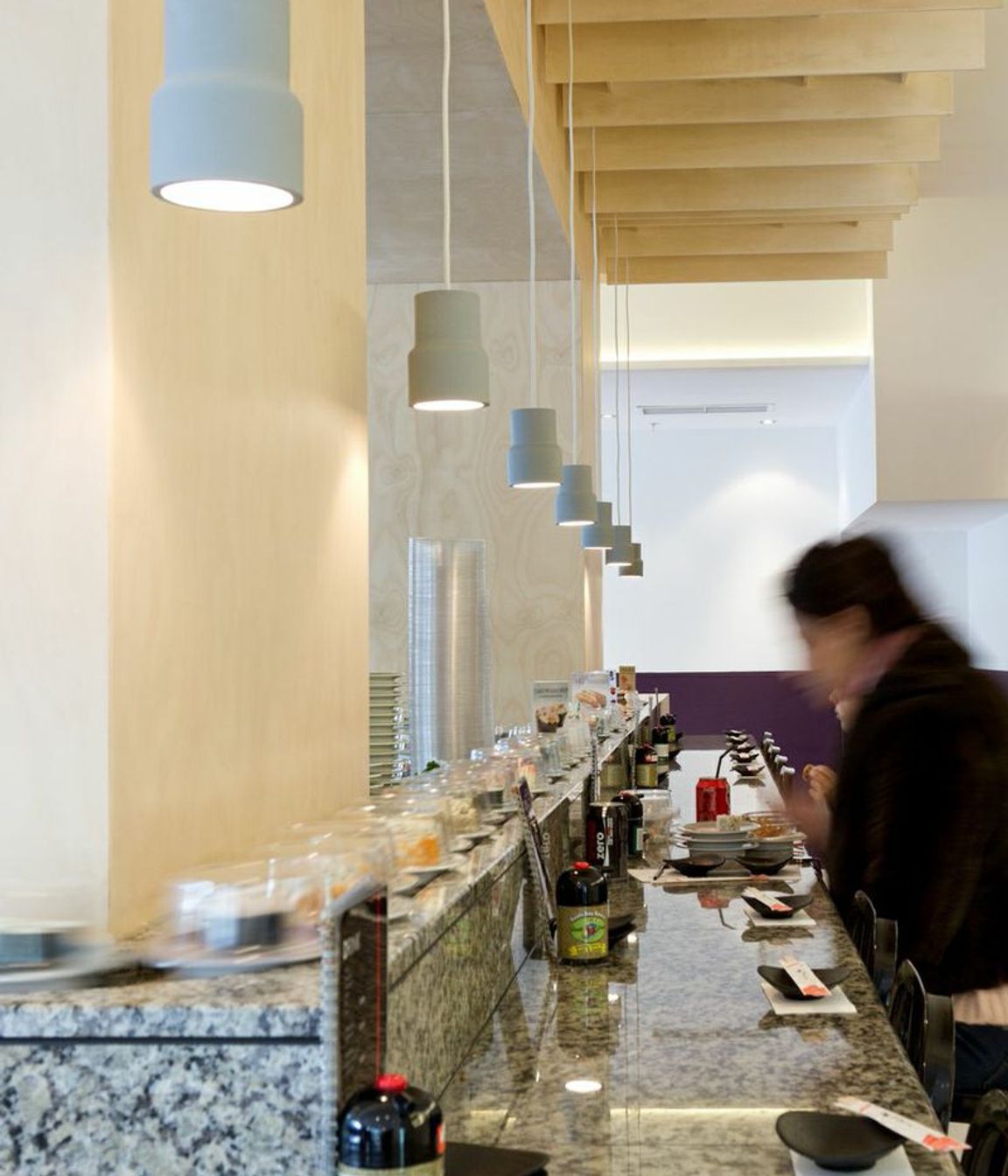ArchiPro Project Summary - Revitalization of The Sushi Train in Auckland Central, enhancing seating capacity with warm plywood textures and durable granite finishes.