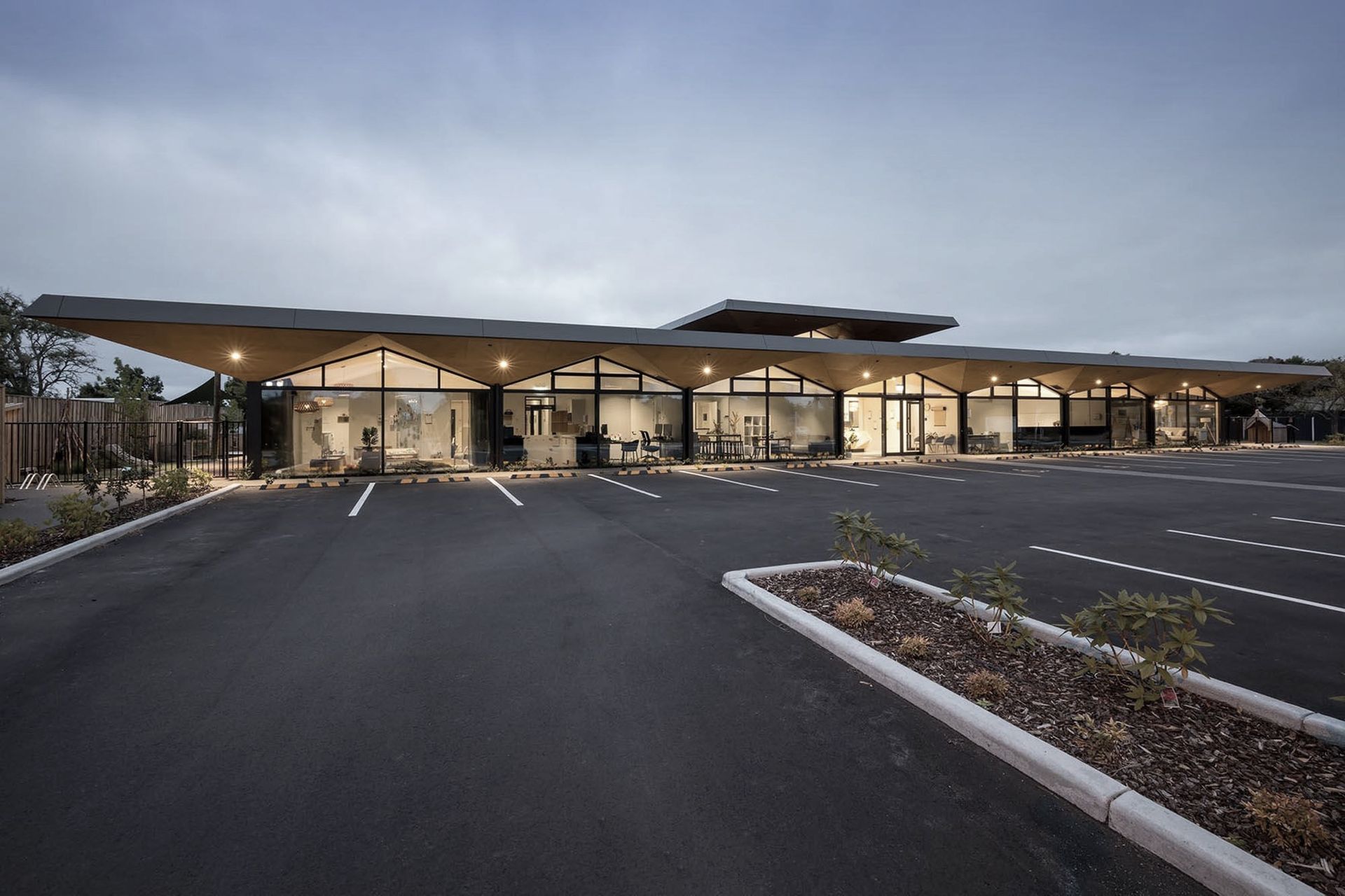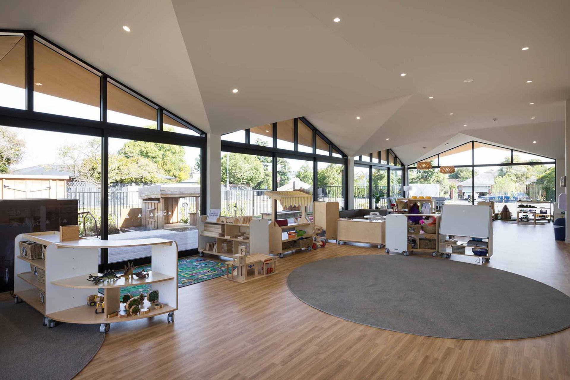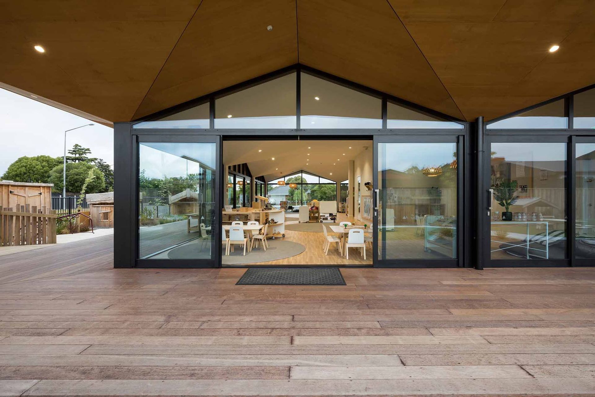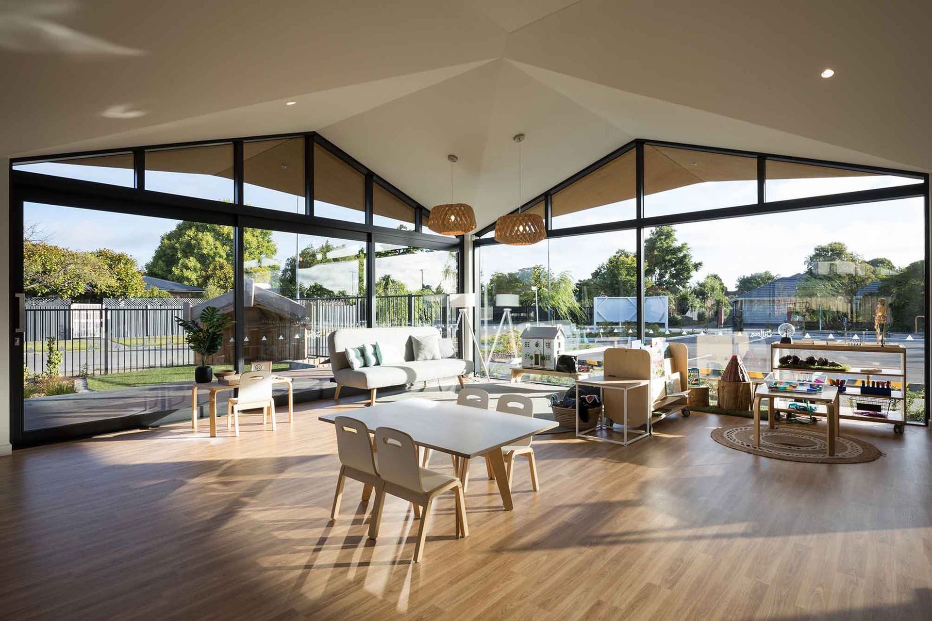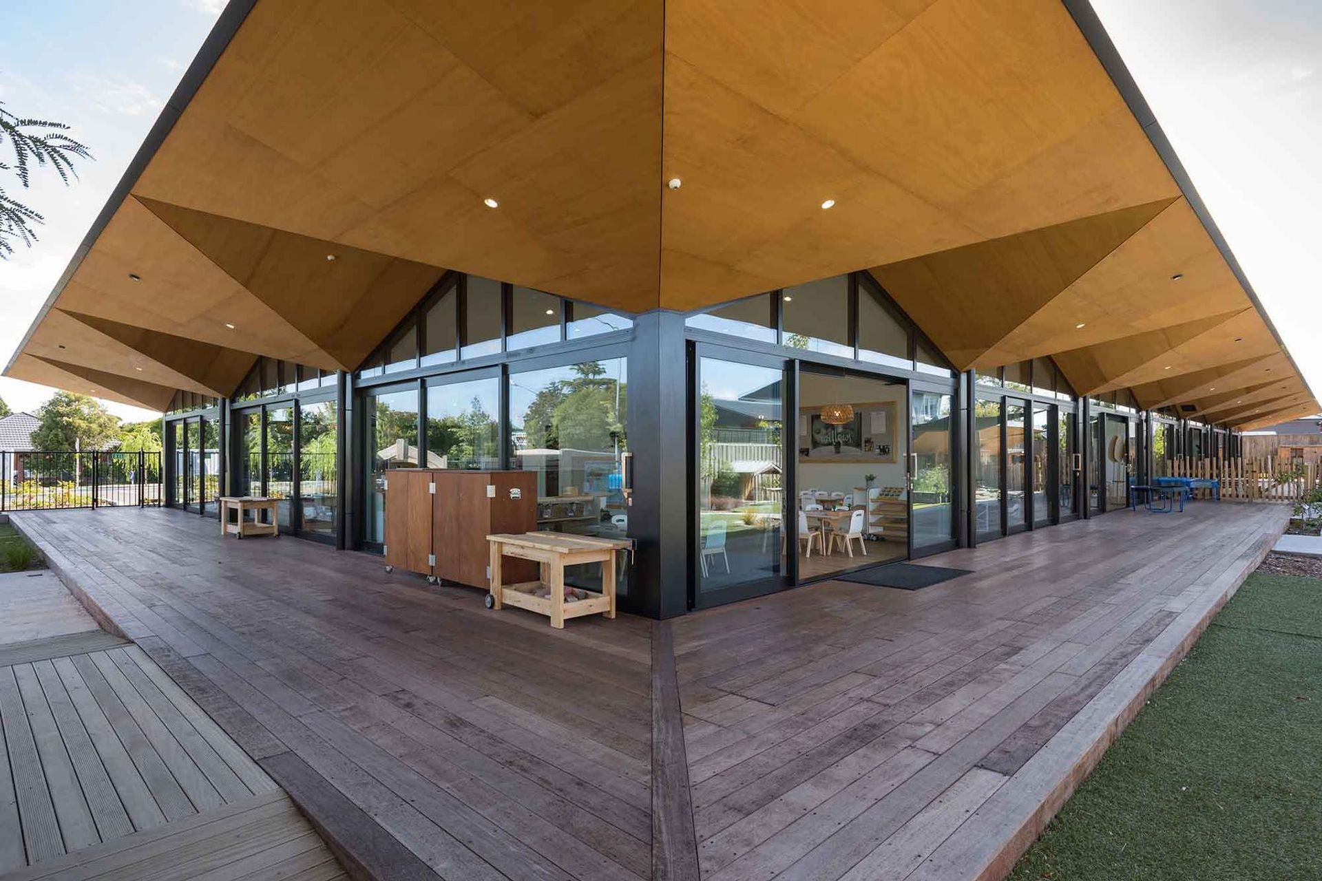 ArchiPro Project Summary - The Willows Early Learning Centre features a geometric roof resembling a tree canopy, with a functional timber frame design that maximizes natural light and integrates seamlessly with its outdoor playground, creating a welcoming environment for children and parents.
