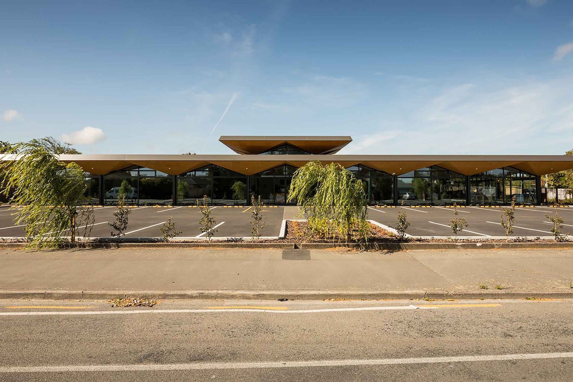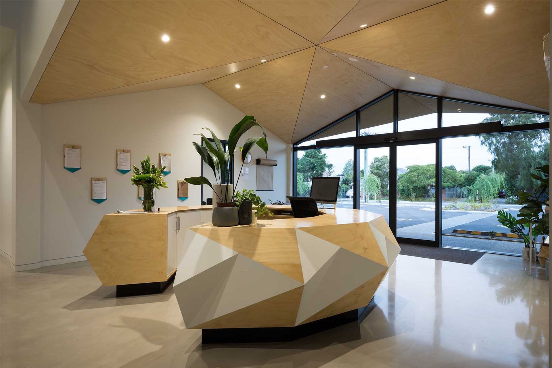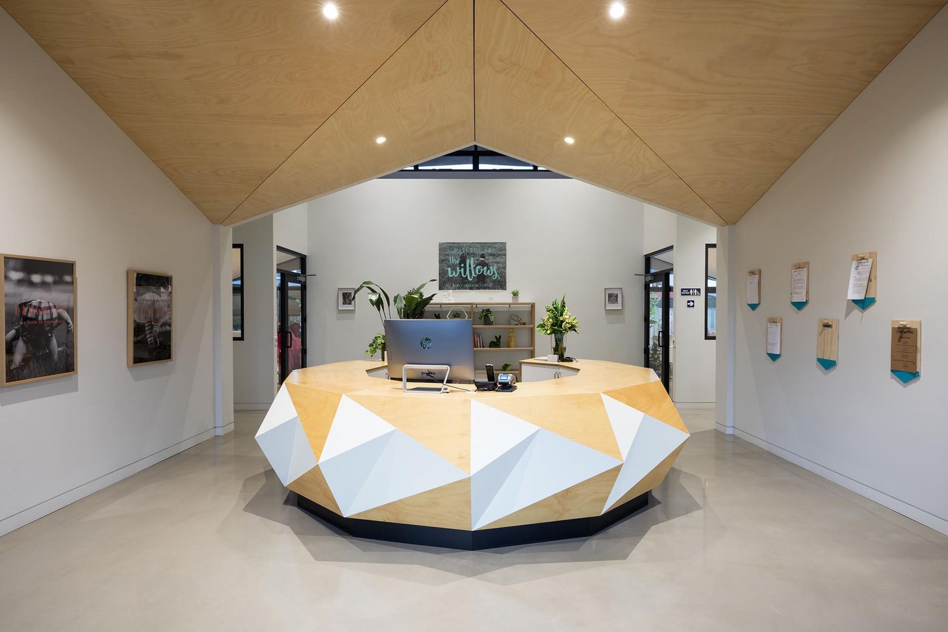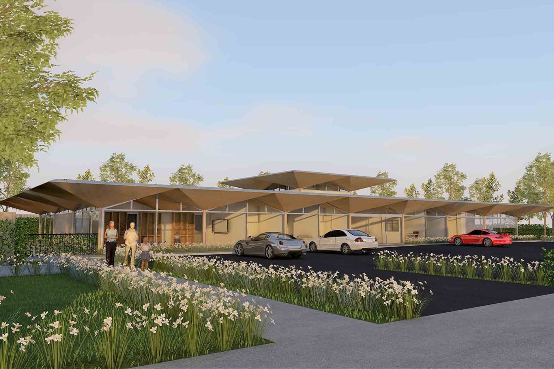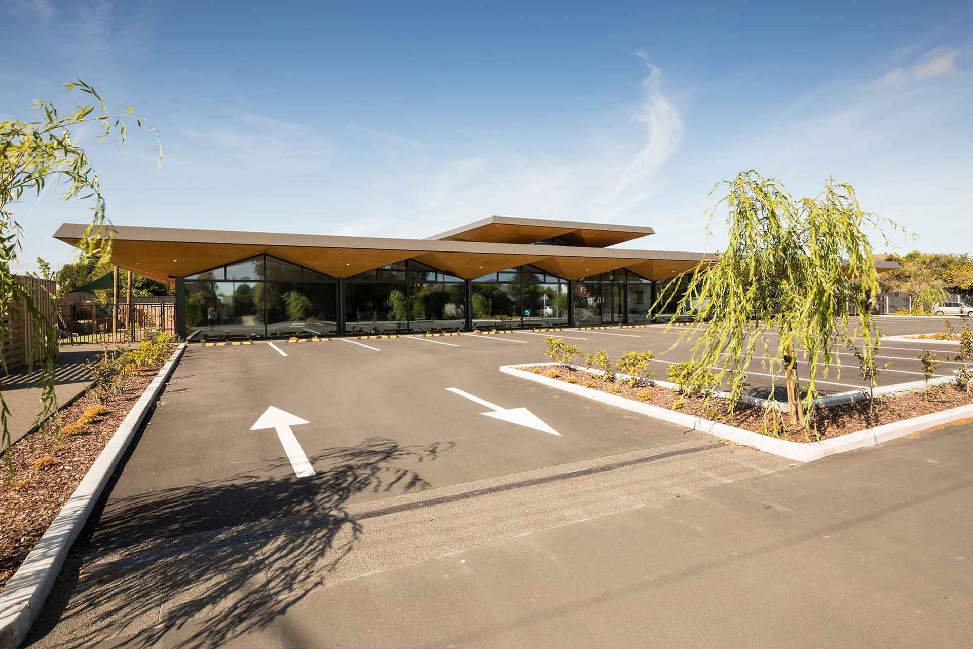 ArchiPro Project Summary - The Willows Early Learning Centre features a geometric roof resembling a tree canopy, with a functional timber frame design that maximizes natural light and integrates seamlessly with its outdoor playground, creating a welcoming environment for children and parents.
