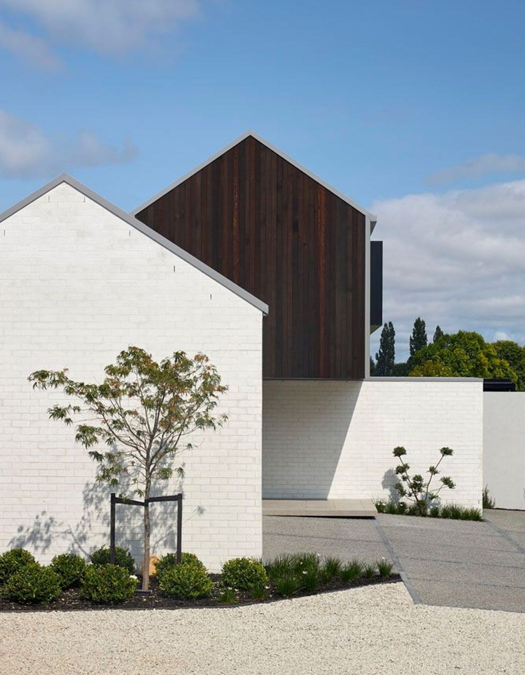 ArchiPro Project Summary - Thoughtfully designed family home featuring interlocking gables, enhanced privacy, and expansive views, seamlessly integrating with its vibrant surroundings near a busy street and park.