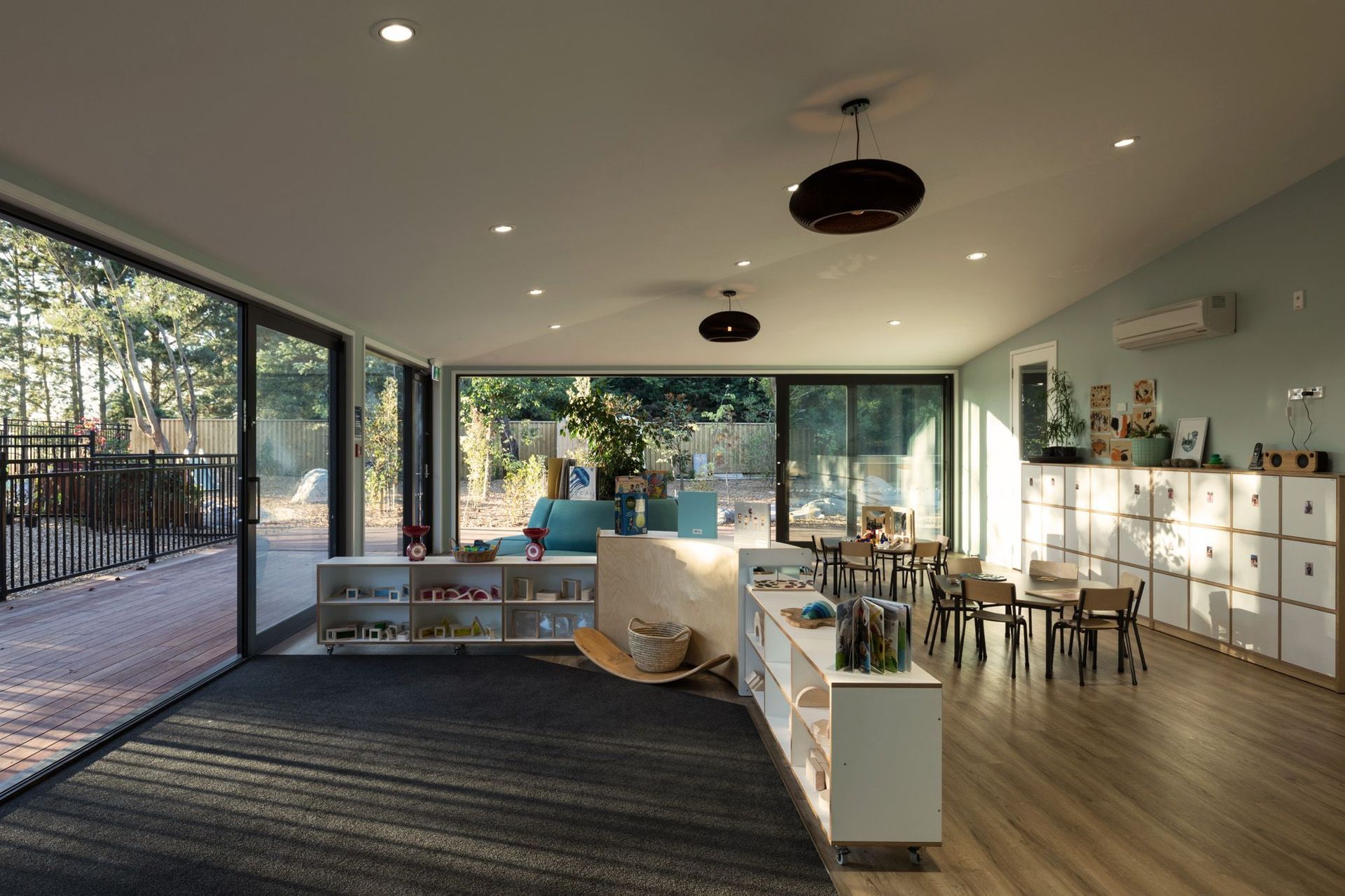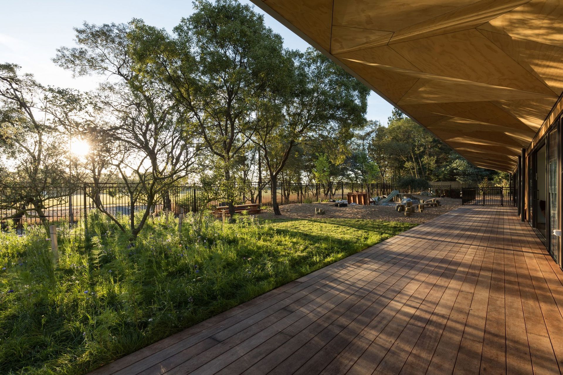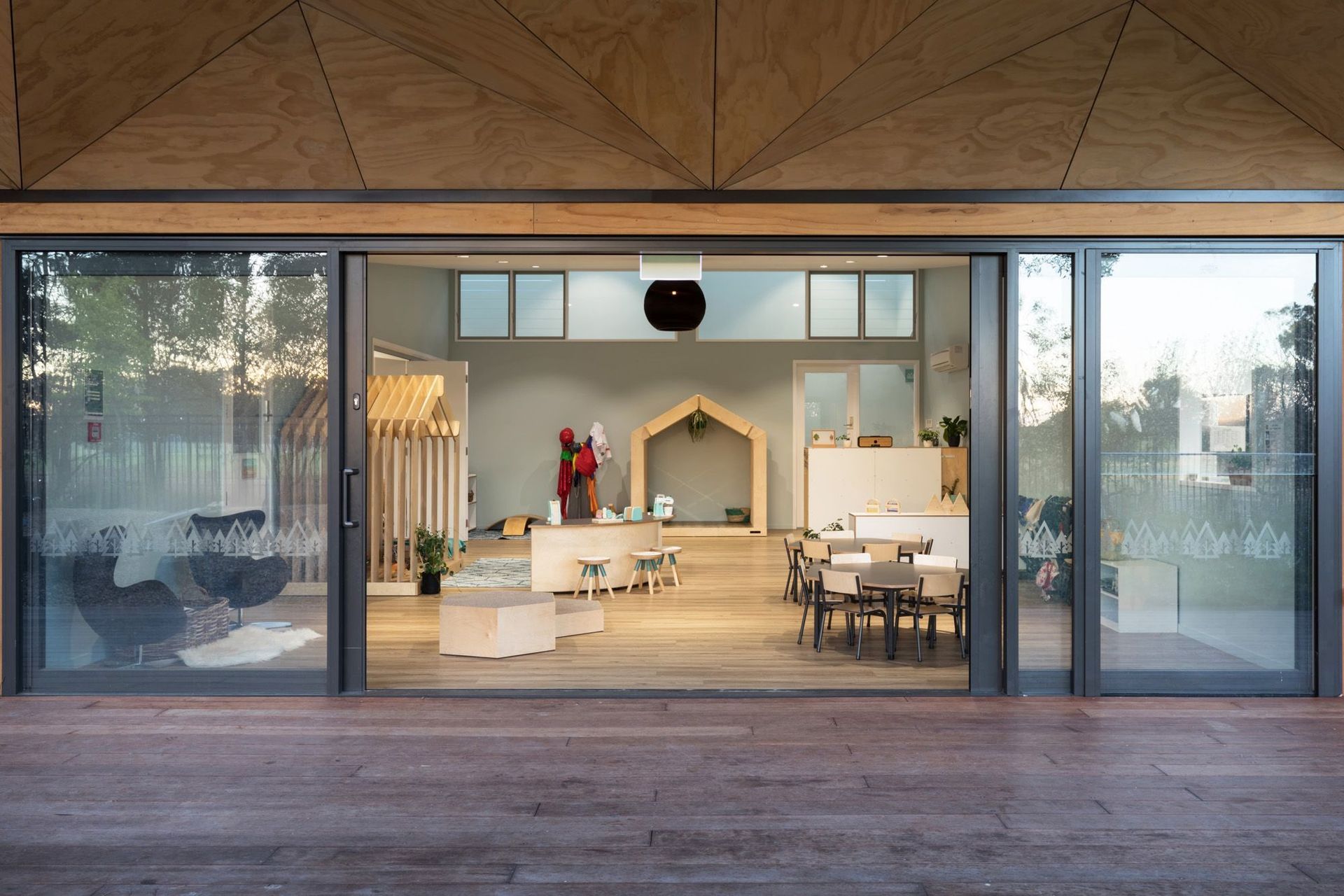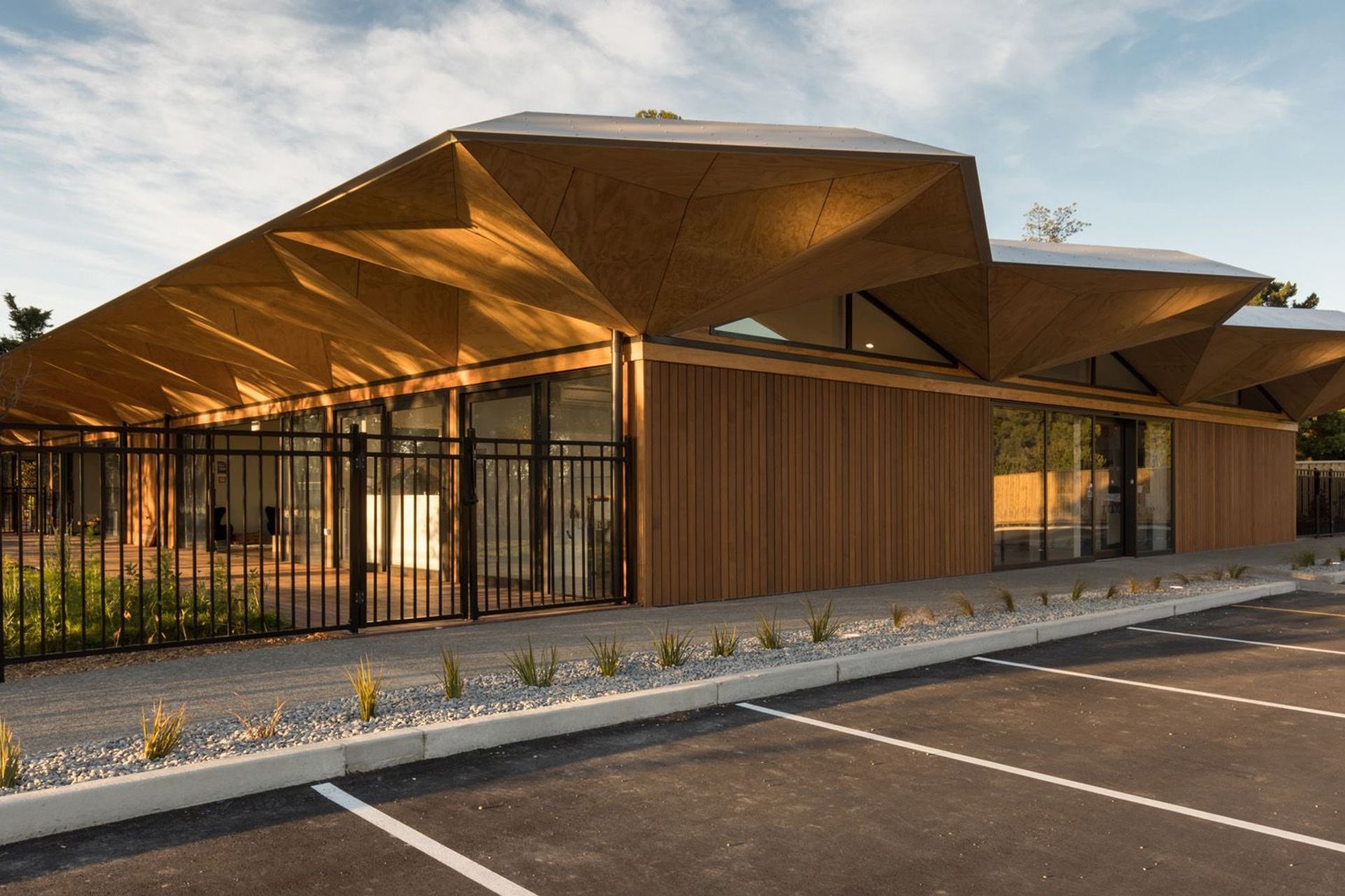 ArchiPro Project Summary - Three Trees Learning Centre in Rolleston, Christchurch, features a sculptural timber roof and a nature-focused design, promoting child-centered learning through play in a harmonious environment, completed in 2019 for CPMC Ltd and Three Trees Learning Centre.