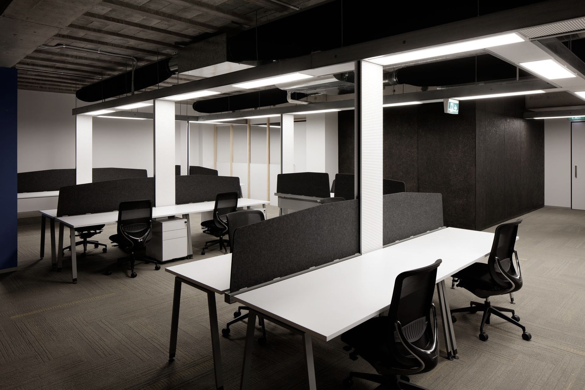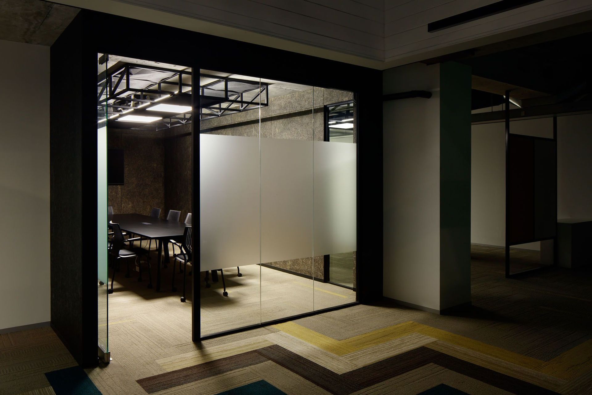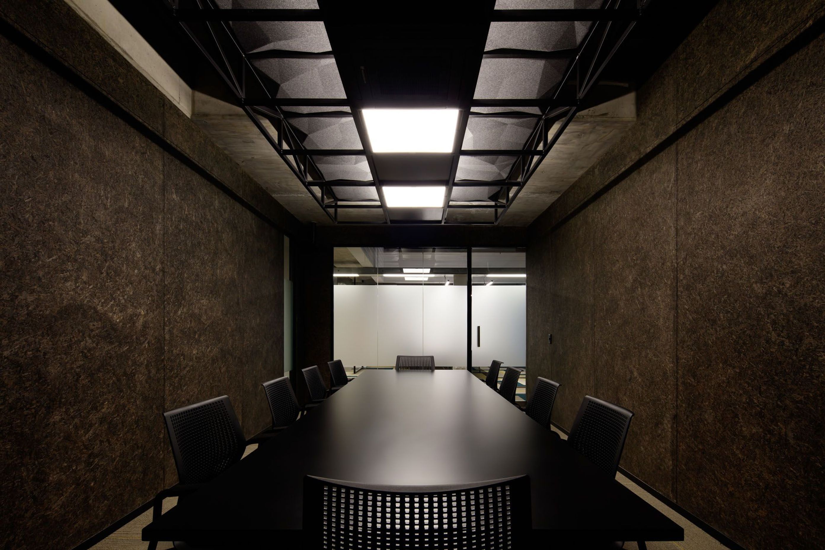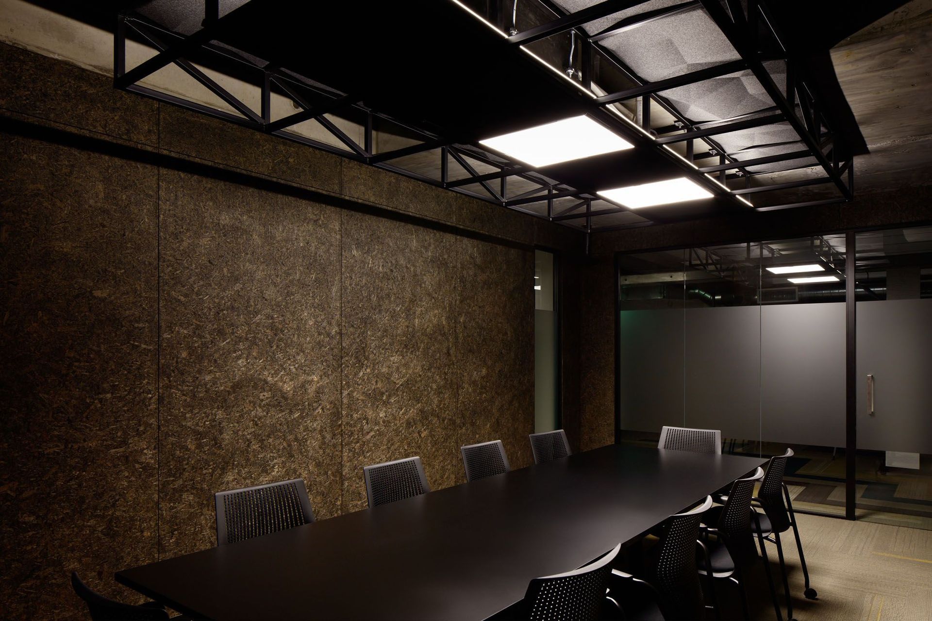 ArchiPro Project Summary - A unique 'Black on Black' space featuring diverse textures and finishes, highlighted by a large metal lighting rig in the meeting room, inspired by concert stage lighting.