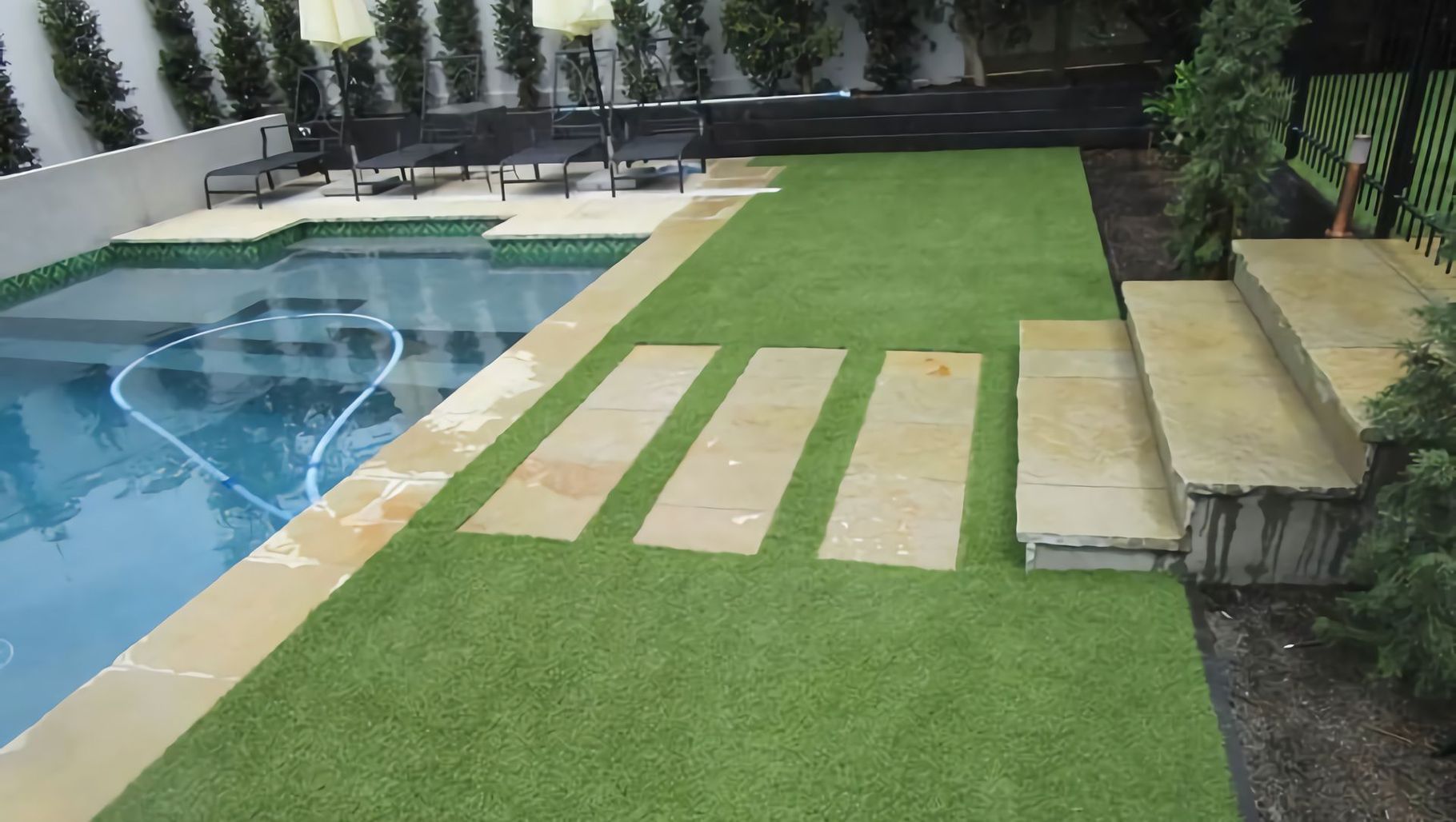 ArchiPro Project Summary - TigerTurf Serenity 30 lawn enhances a stunning garden with lush green terraces leading to a designer pool, completed in February 2020, covering an area of 56m2 with a dynamic base for optimal stability and drainage.