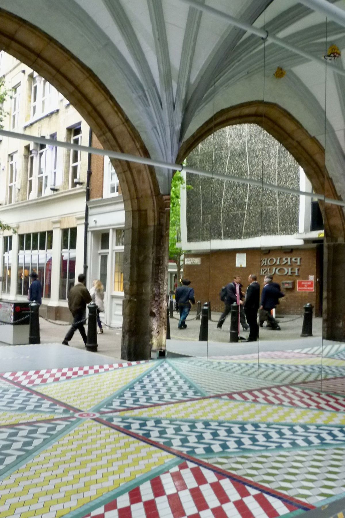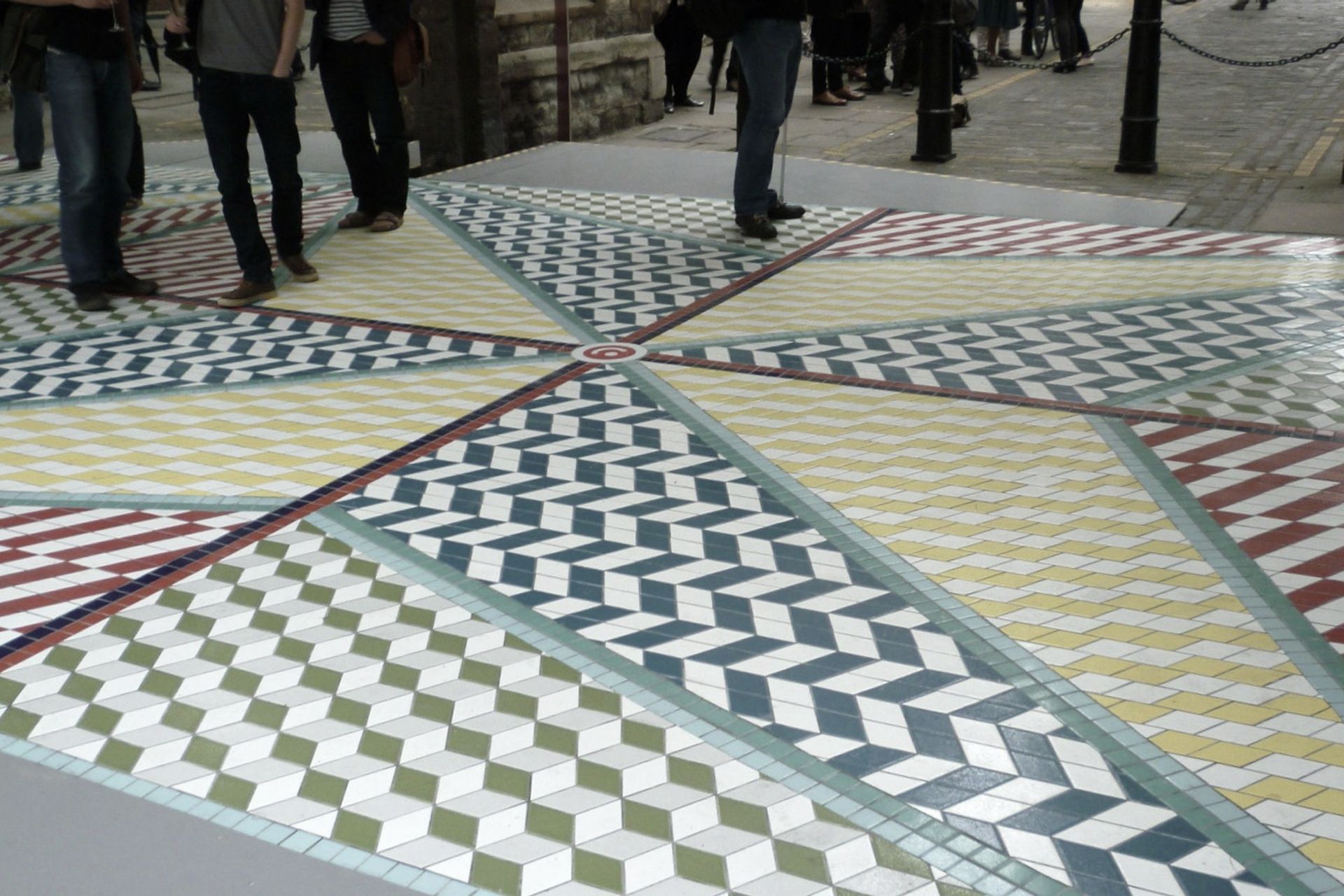 ArchiPro Project Summary - A stunning installation of 7200 Turkish ceramic tiles at St. John's Gate, showcasing innovative design and awarded GOLD at the London Design Awards 2014, created in collaboration with architects Russ+Henshaw for Clerkenwell Design Week.