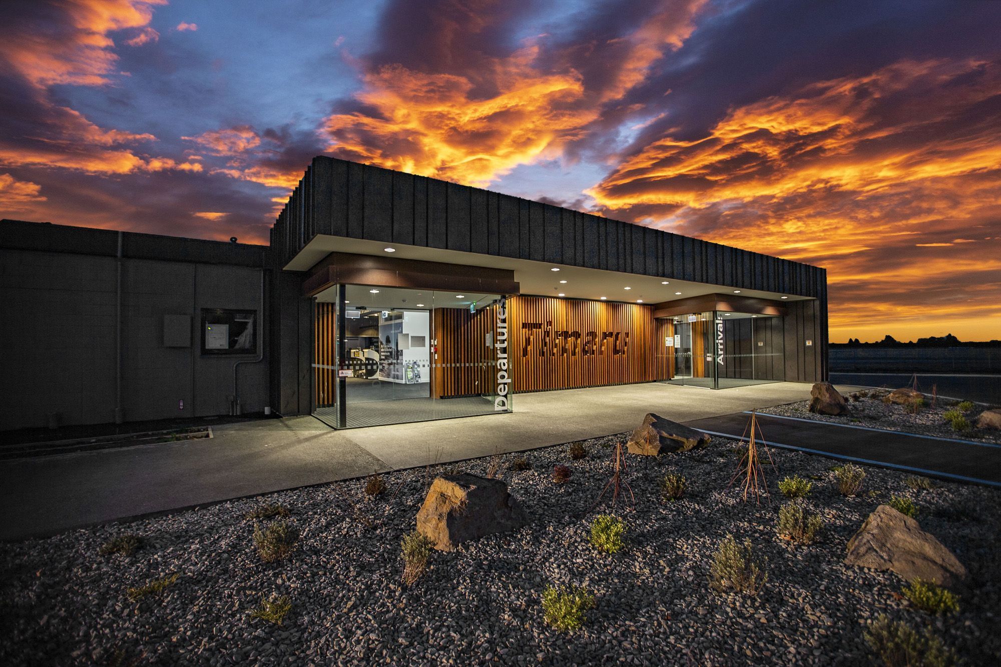 ArchiPro Project Summary - Upgrading Timaru Airport with enhanced terminal facilities and improved logistics for larger aircraft, featuring a redesigned façade and optimized passenger flow through separate entrances and exits.
