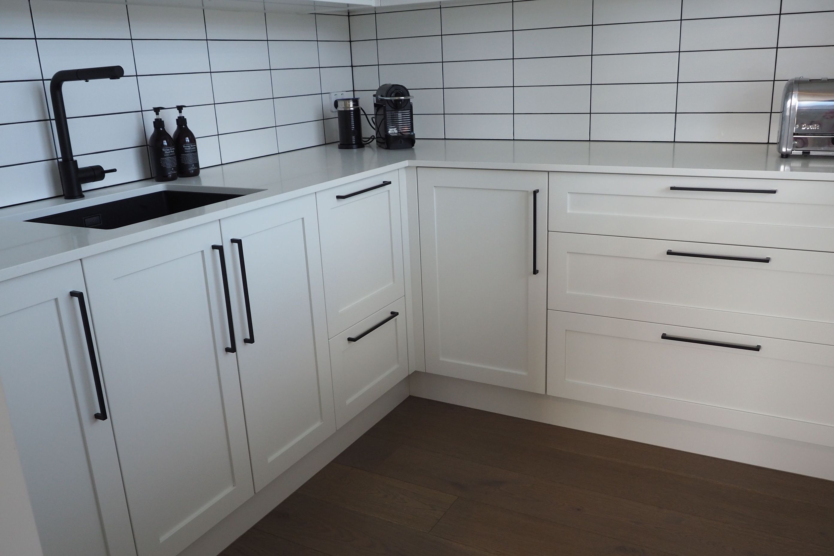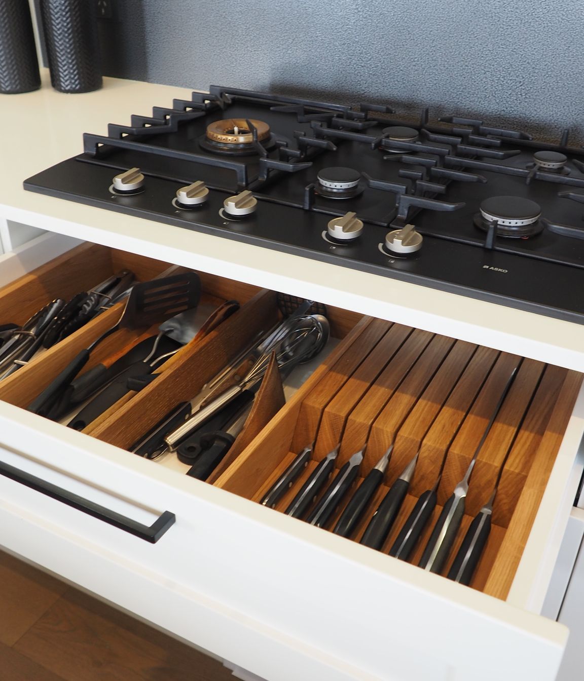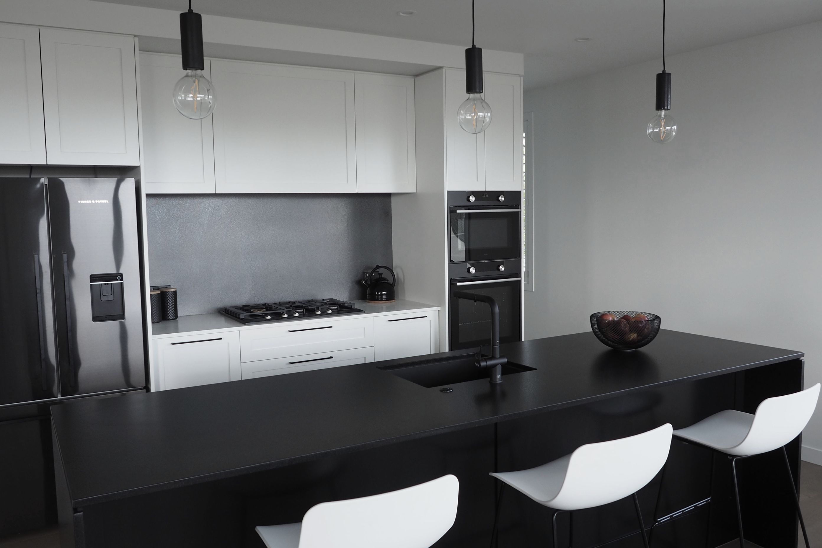 ArchiPro Project Summary - A striking black and white kitchen featuring elegant lacquered finishes, leathered stone countertops, and thoughtfully designed bespoke drawer inserts and veggie bins.