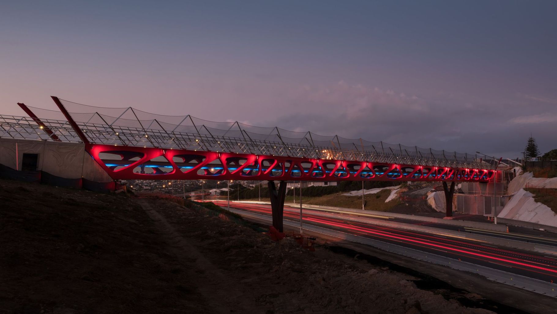 ArchiPro Project Summary - Tirohanga Whānui Bridge features anti-throw and fall protection mesh screens, enhancing safety while connecting Albany Westfield Shopping Centre to a residential area, showcasing a striking design with stainless steel mesh and distinctive red steel.