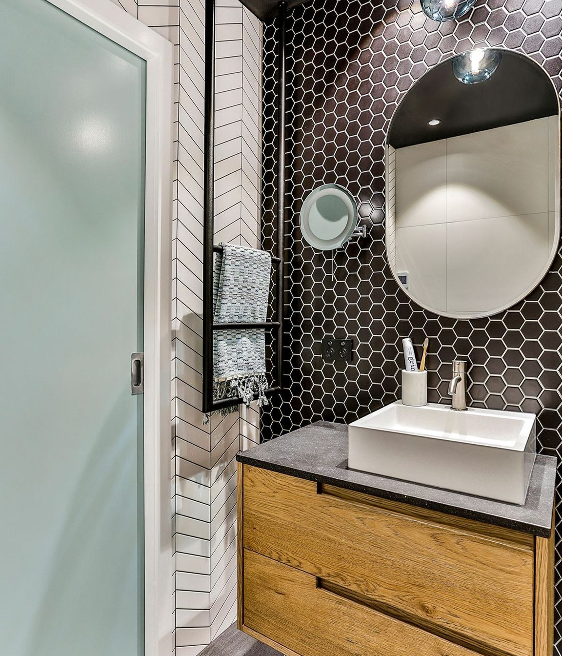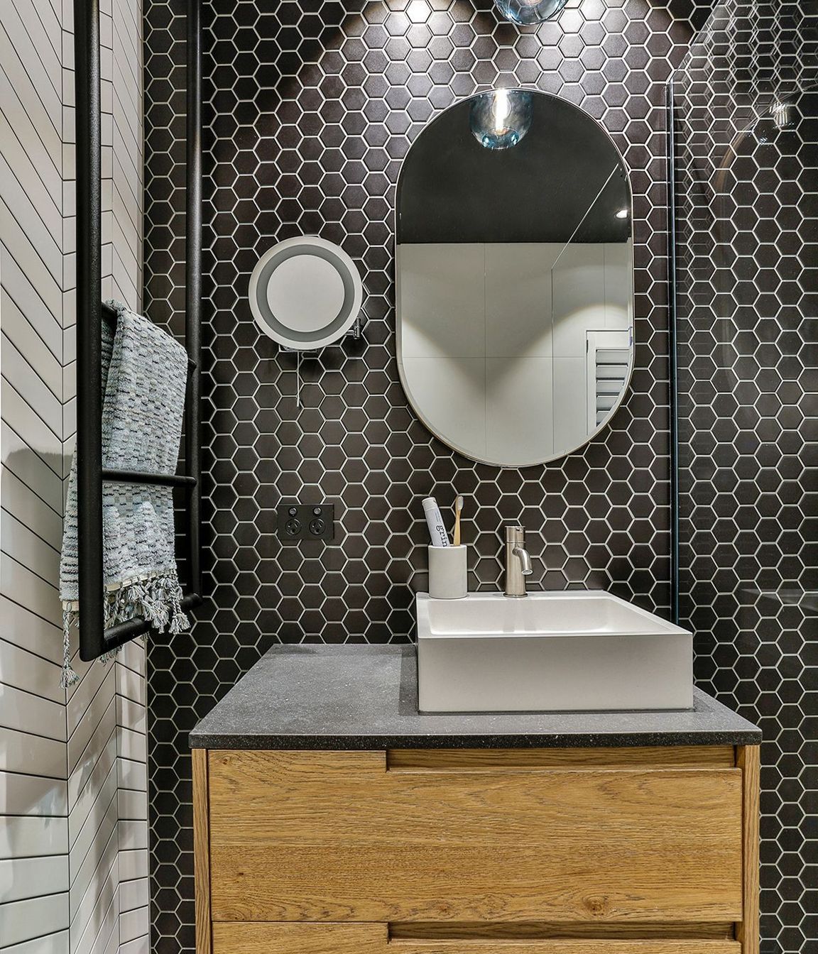 ArchiPro Project Summary - Award-winning ensuite featuring earthy green tones and a stunning crushed marble and resin bathtub, designed by Natalie Du Bois of Du Bois Design, recognized with multiple accolades including the NKBA Colour Excellence Award 2018.
