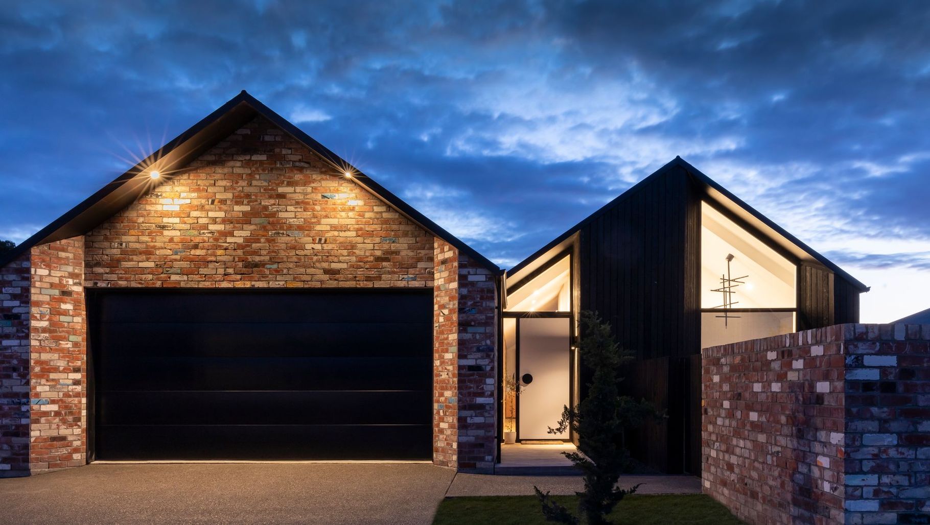 ArchiPro Project Summary - Innovative family home featuring an offset twin gable design, a central spine wall for privacy, and sustainable materials including recycled bricks and charred Larch cladding, all while maximizing natural light and outdoor living spaces.