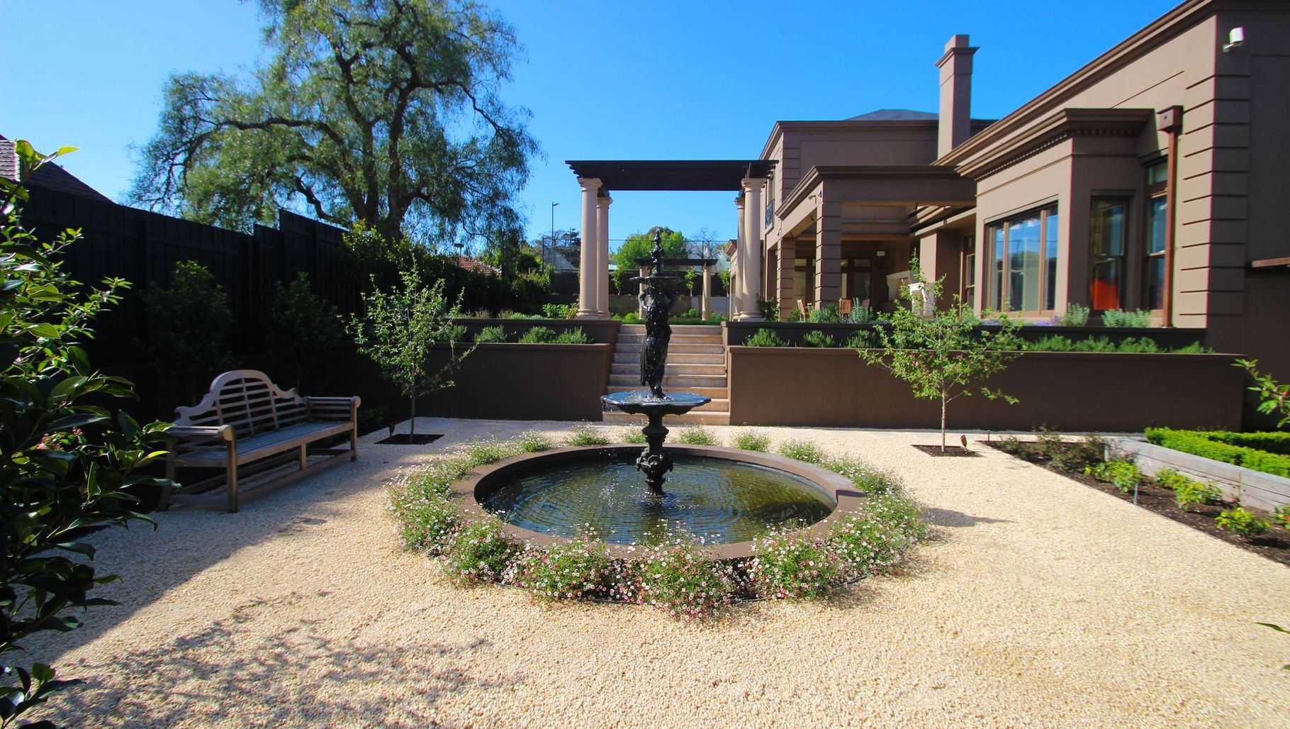 ArchiPro Project Summary - A European-inspired garden featuring formal plantings, vibrant perennials, granite set pavers, and a tranquil bronze water feature, complemented by frameless glass fencing, hardwood raised planters, and a stylish outdoor kitchen.