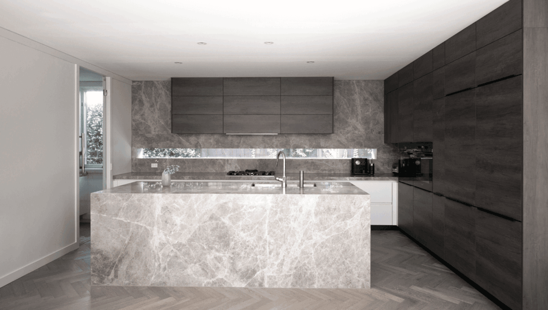 ArchiPro Project Summary - Elegant renovation of a Toorak residence featuring a contemporary kitchen, redesigned bathrooms, and cohesive herringbone flooring, blending modern aesthetics with the charm of a 1950s home.