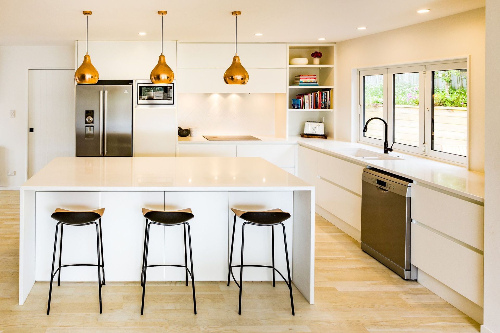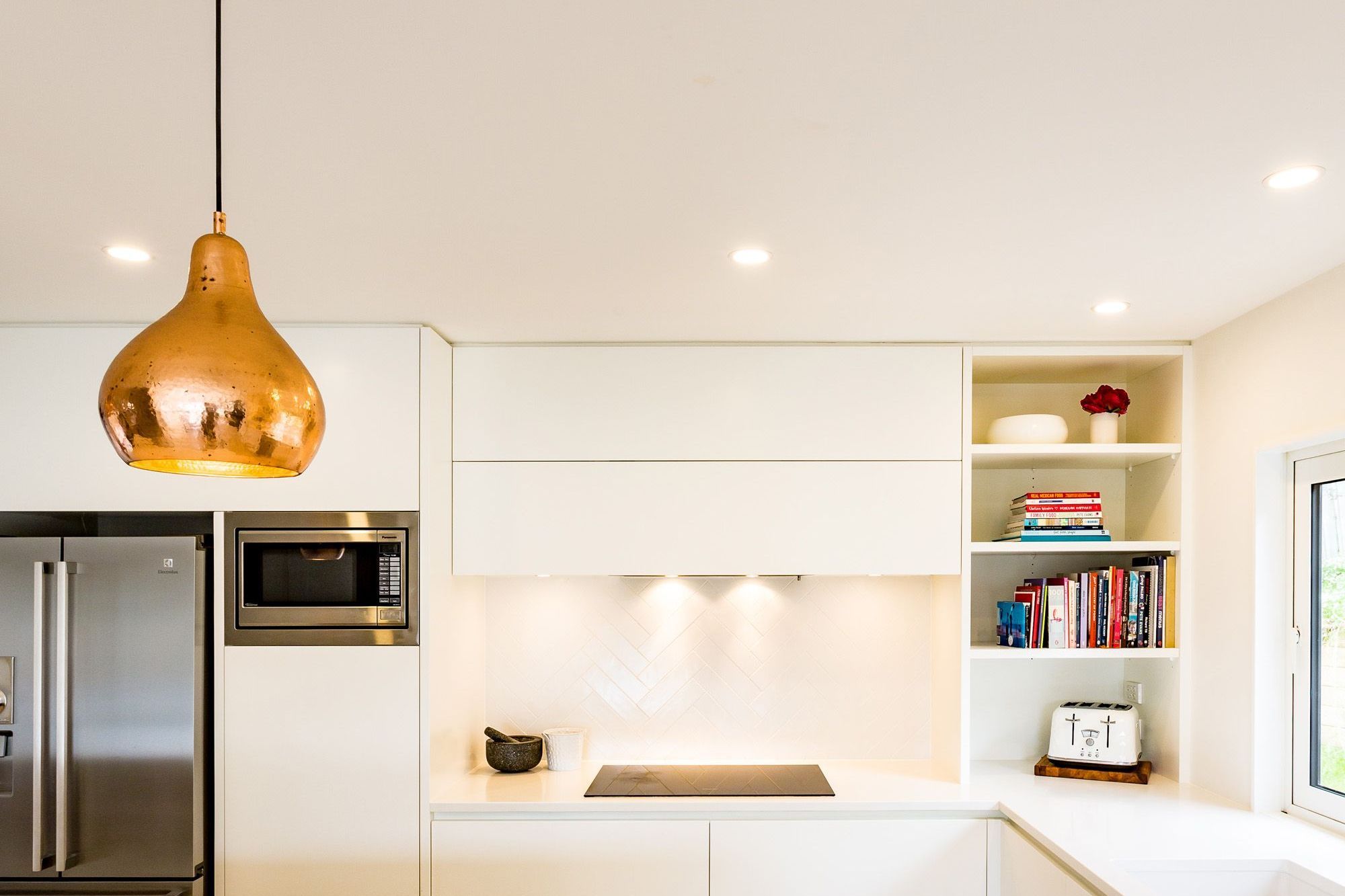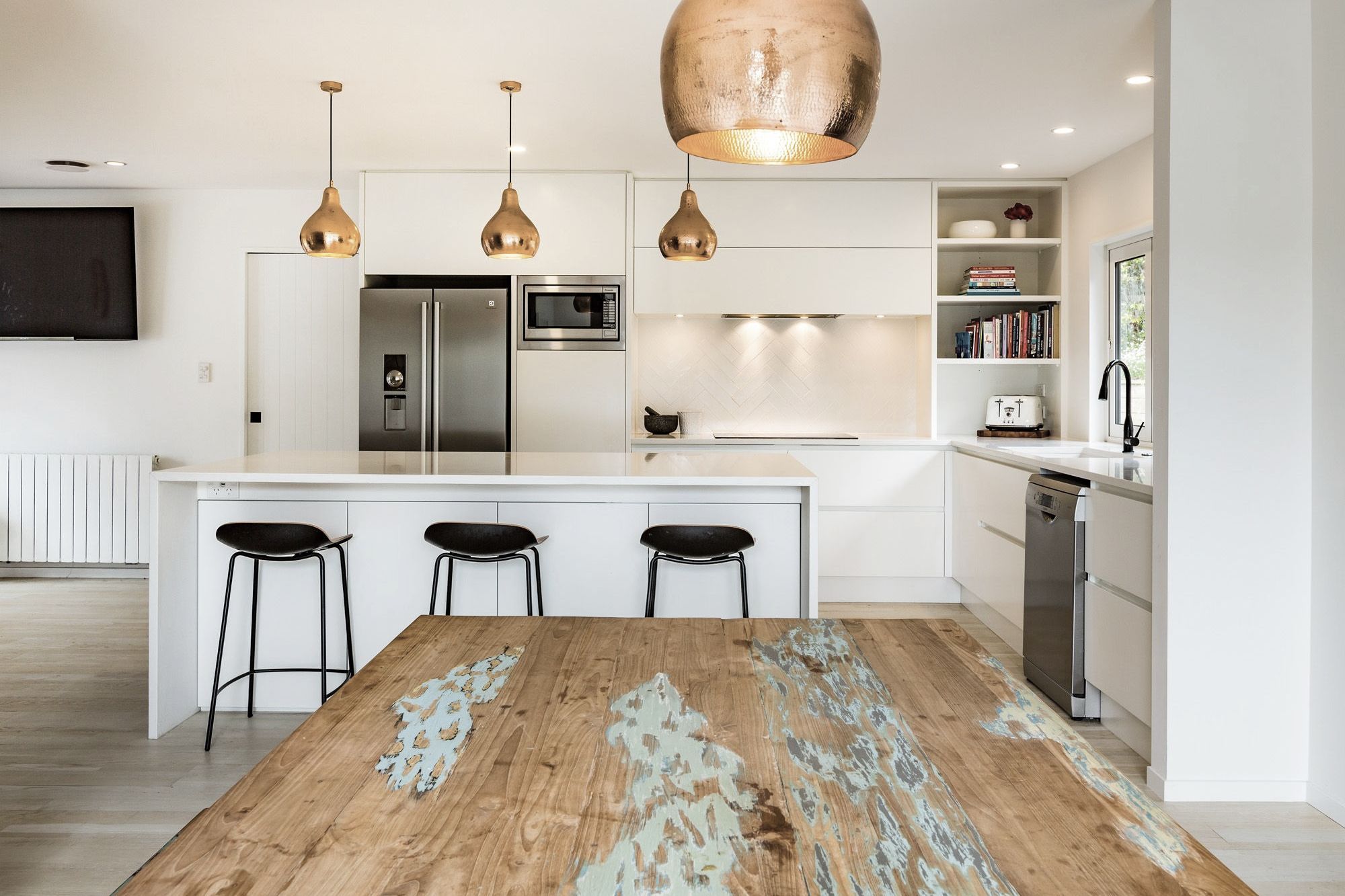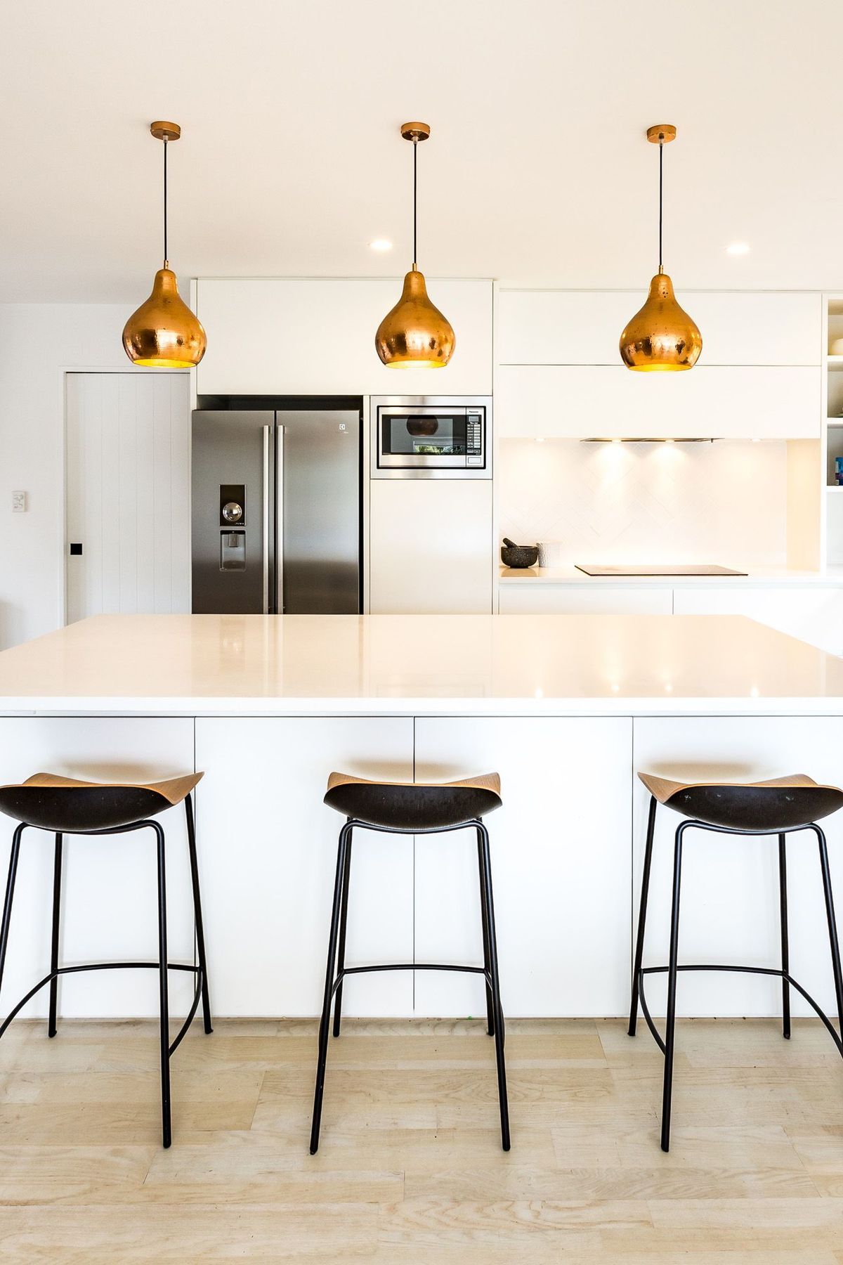 ArchiPro Project Summary - A stylish kitchen design featuring a harmonious blend of white, copper accents, and timber elements, highlighted by a striking black tap for a contemporary touch.