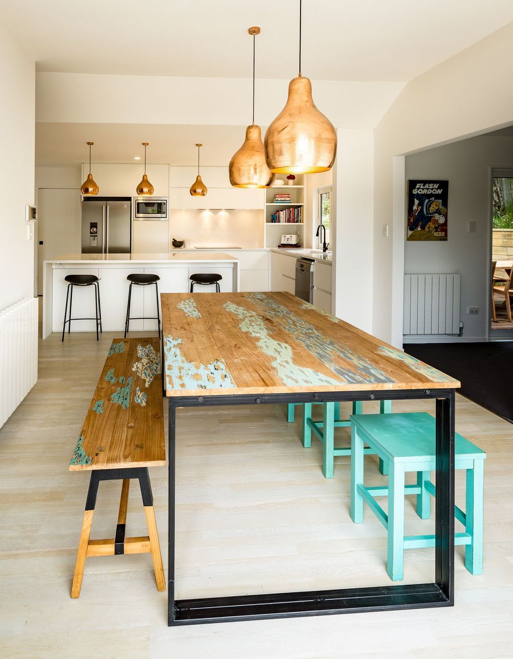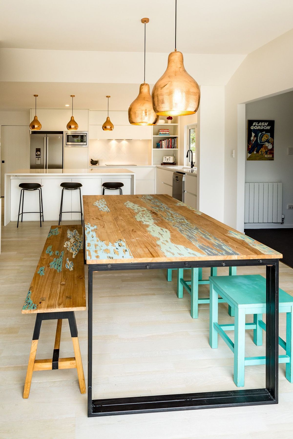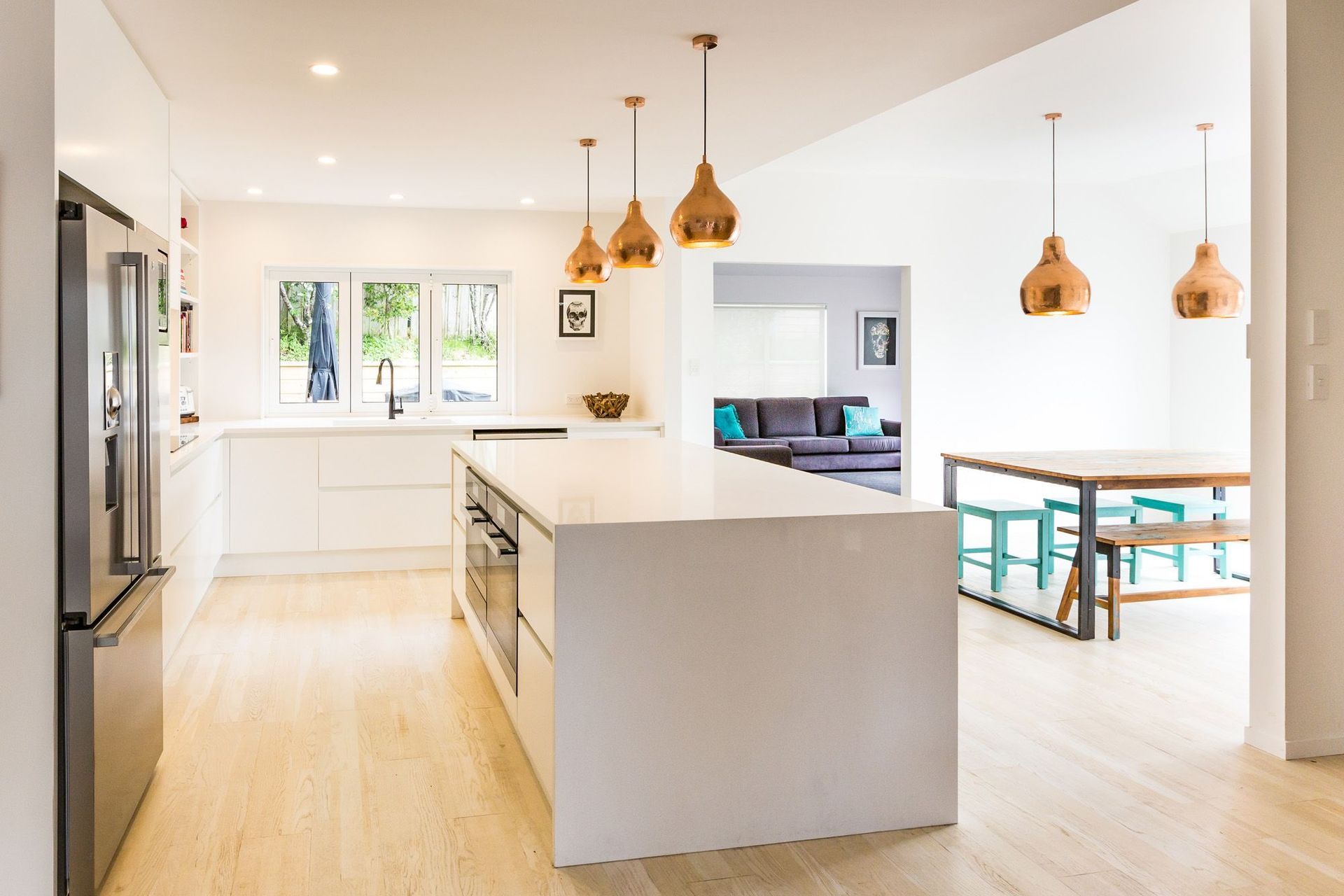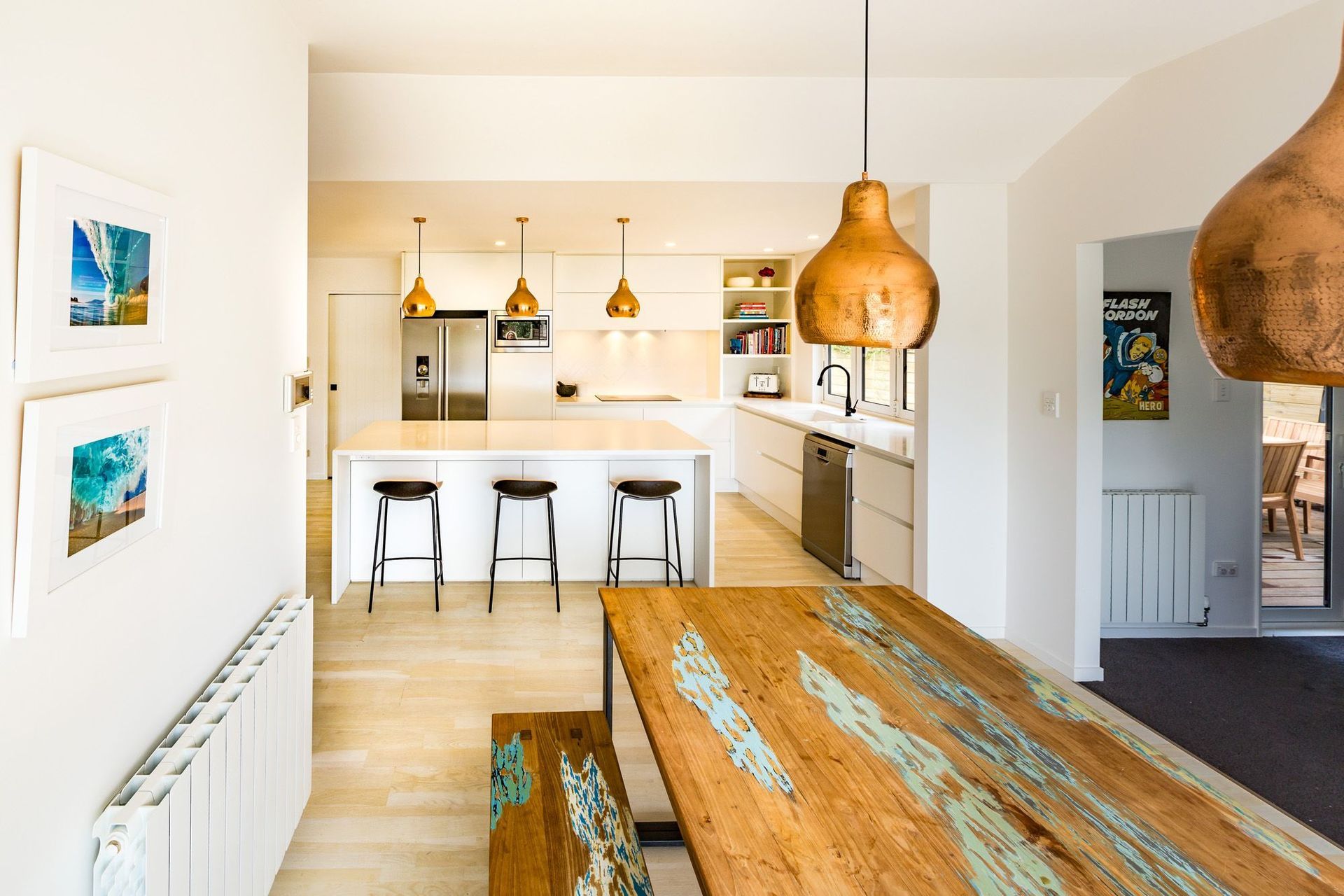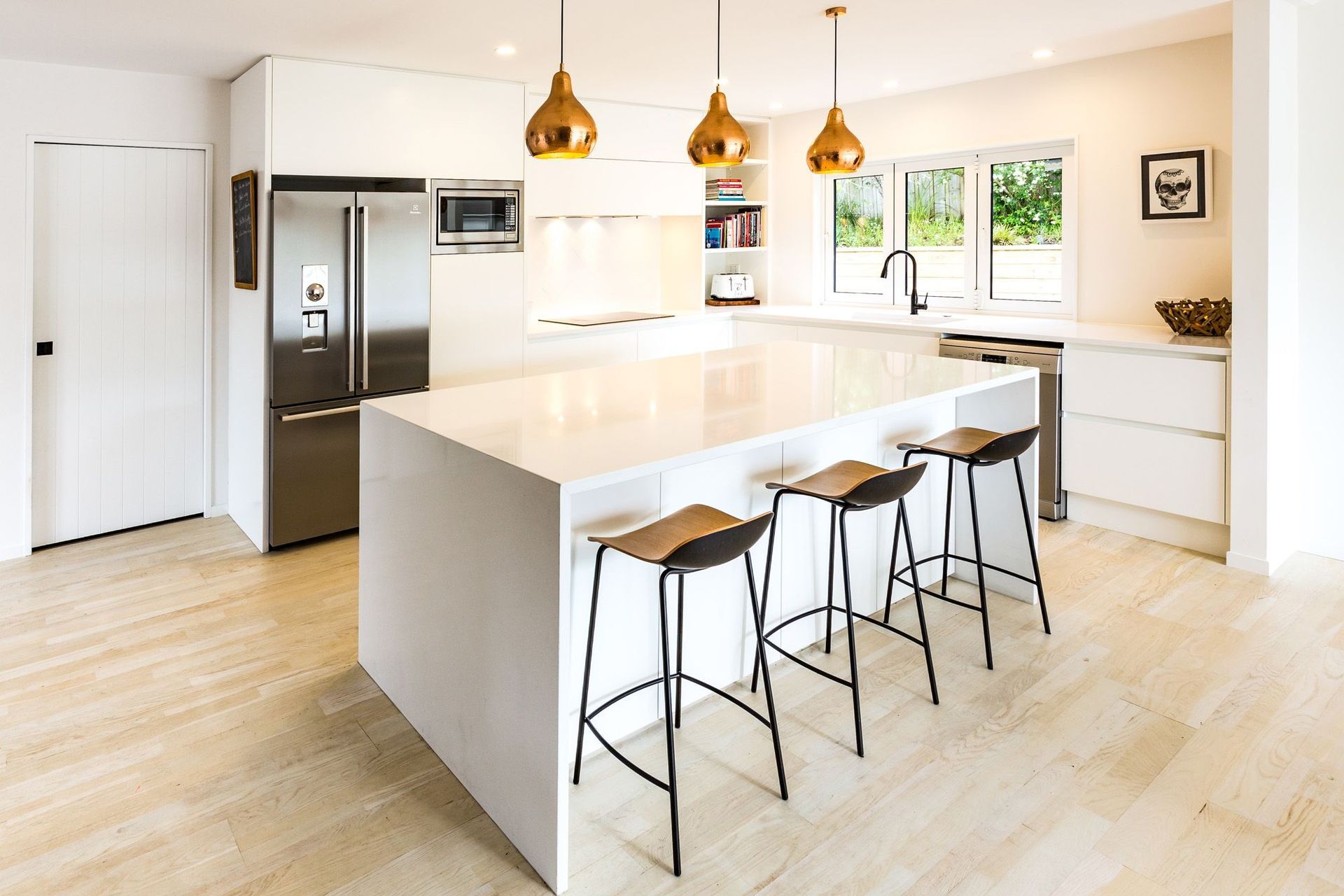 ArchiPro Project Summary - A stylish kitchen design featuring a harmonious blend of white, copper accents, and timber elements, highlighted by a striking black tap for a contemporary touch.