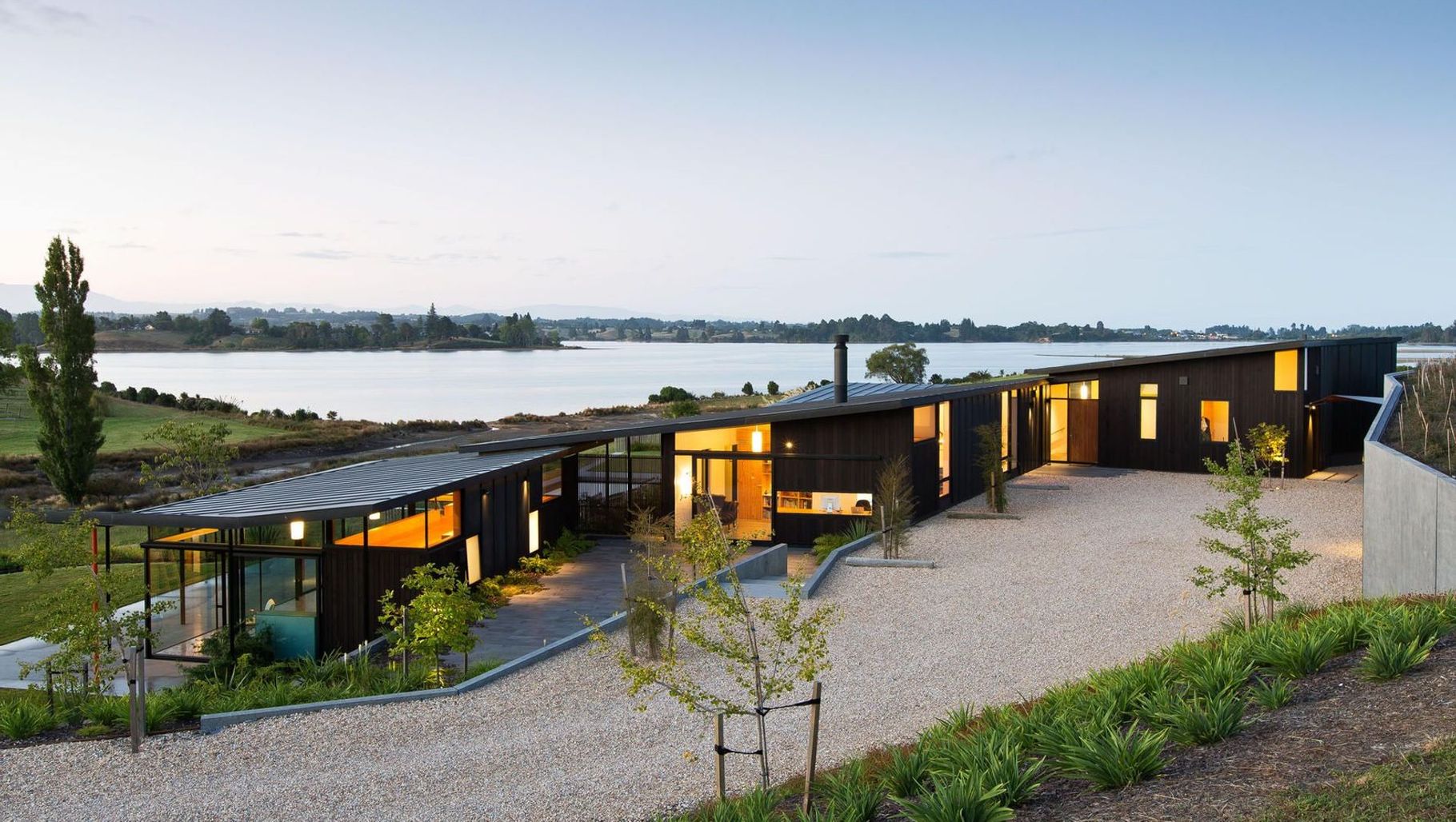ArchiPro Project Summary - A sustainable family home nestled in a restored rural landscape, featuring innovative design inspired by local wildlife and energy-efficient systems, set within a former apple orchard near Waimea Estuary.