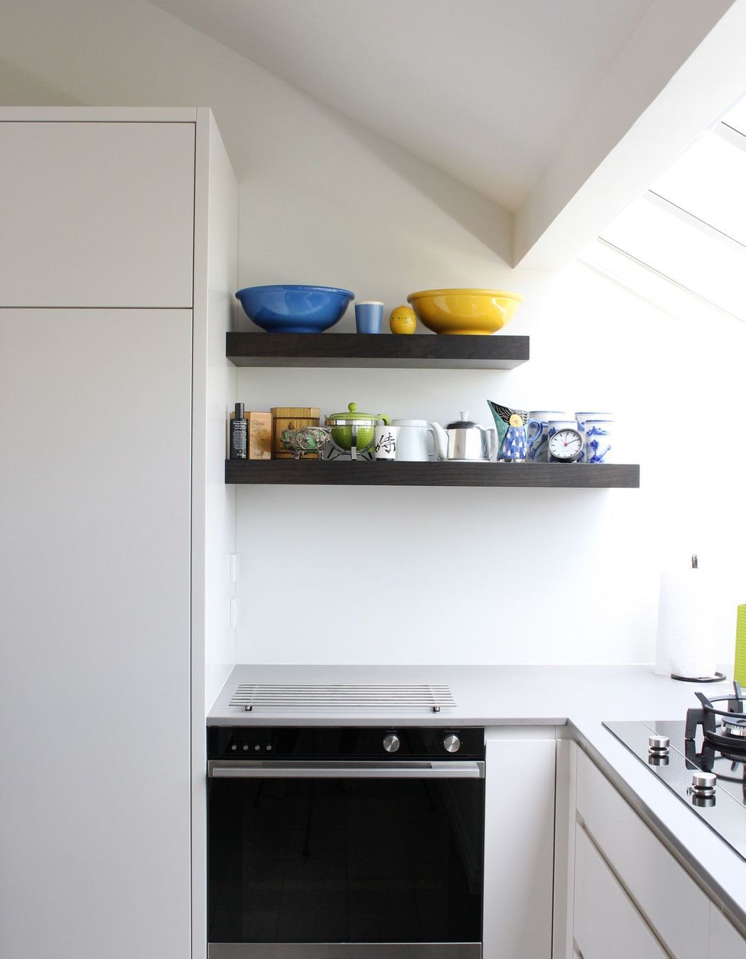 ArchiPro Project Summary - A contemporary townhouse featuring a stylish kitchen with white lacquer cabinetry, a dark oak veneer island, sharks tooth handles, and calm engineered stone, creating a harmonious blend of materials for modern living.