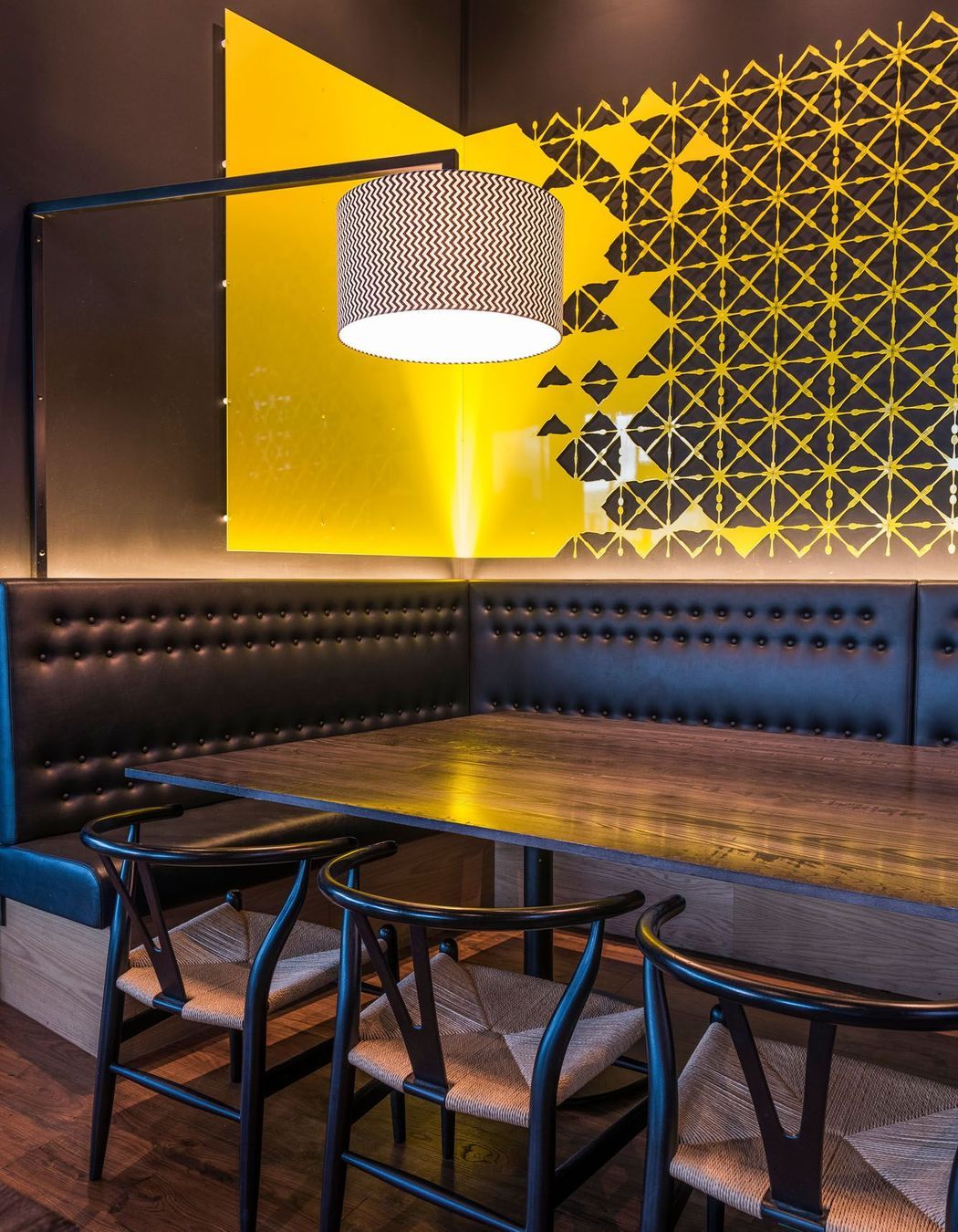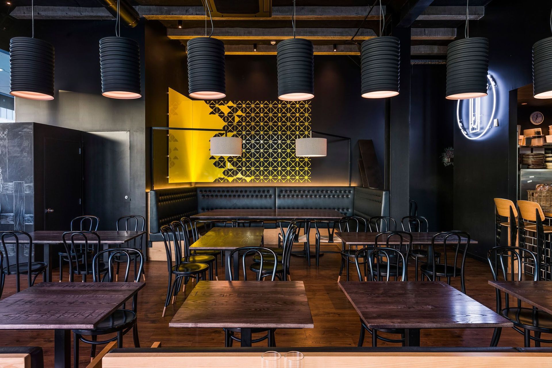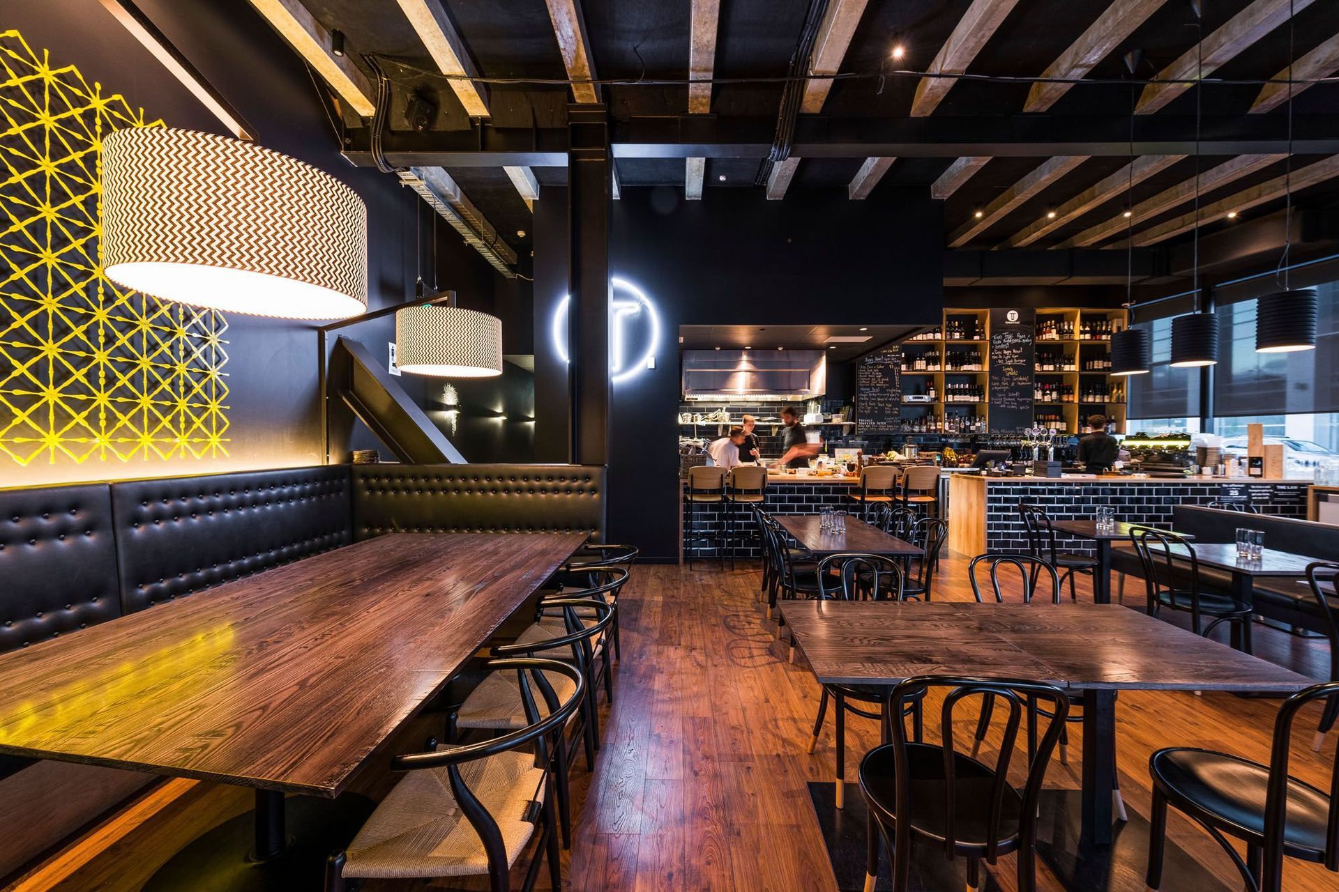 ArchiPro Project Summary - Town Tonic: A dynamic restaurant in Christchurch featuring a striking black interior, commissioned artwork, and custom-designed sofas that enhance the dining experience while addressing the challenges of a high stud height and compact floor area.