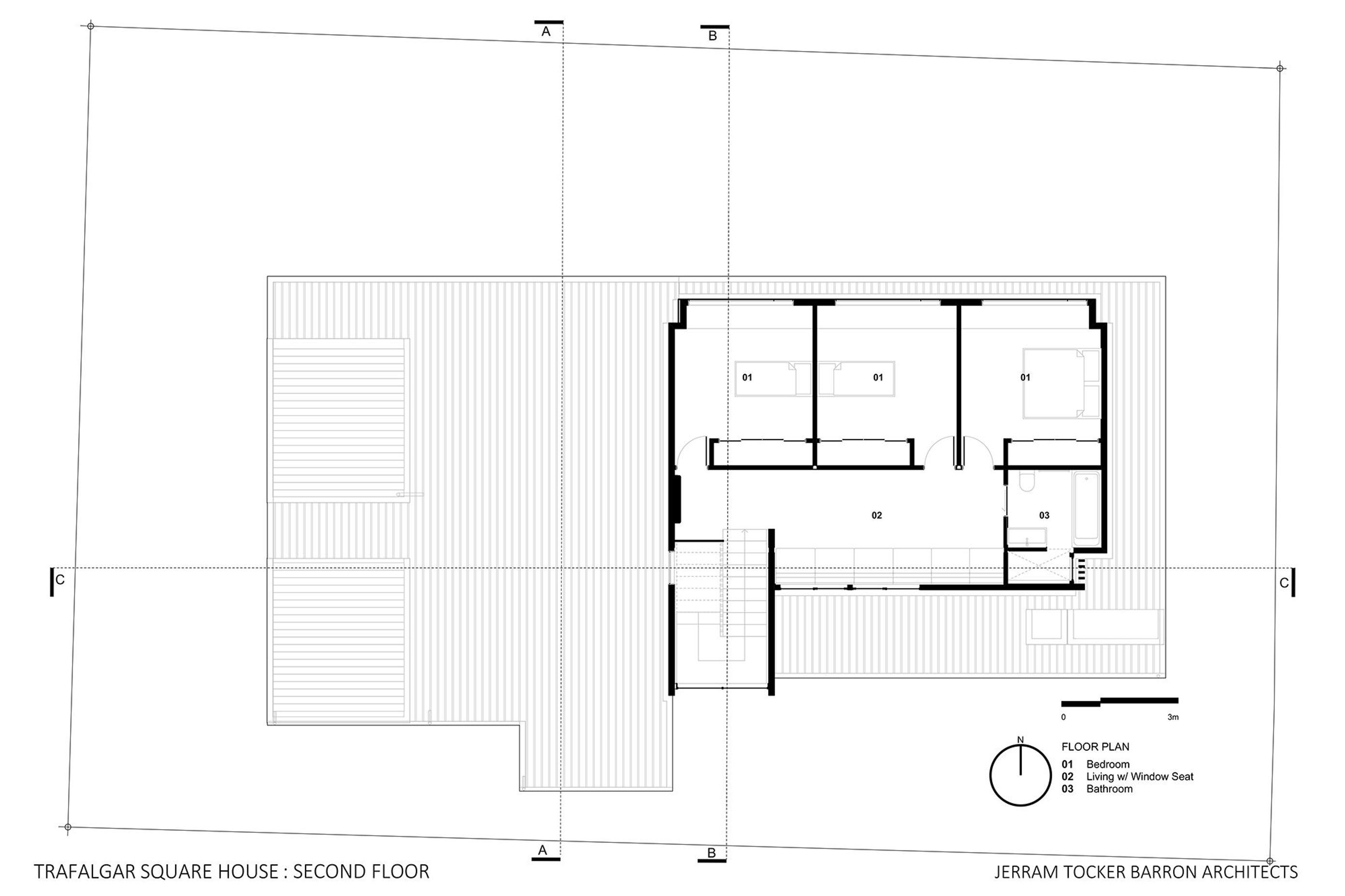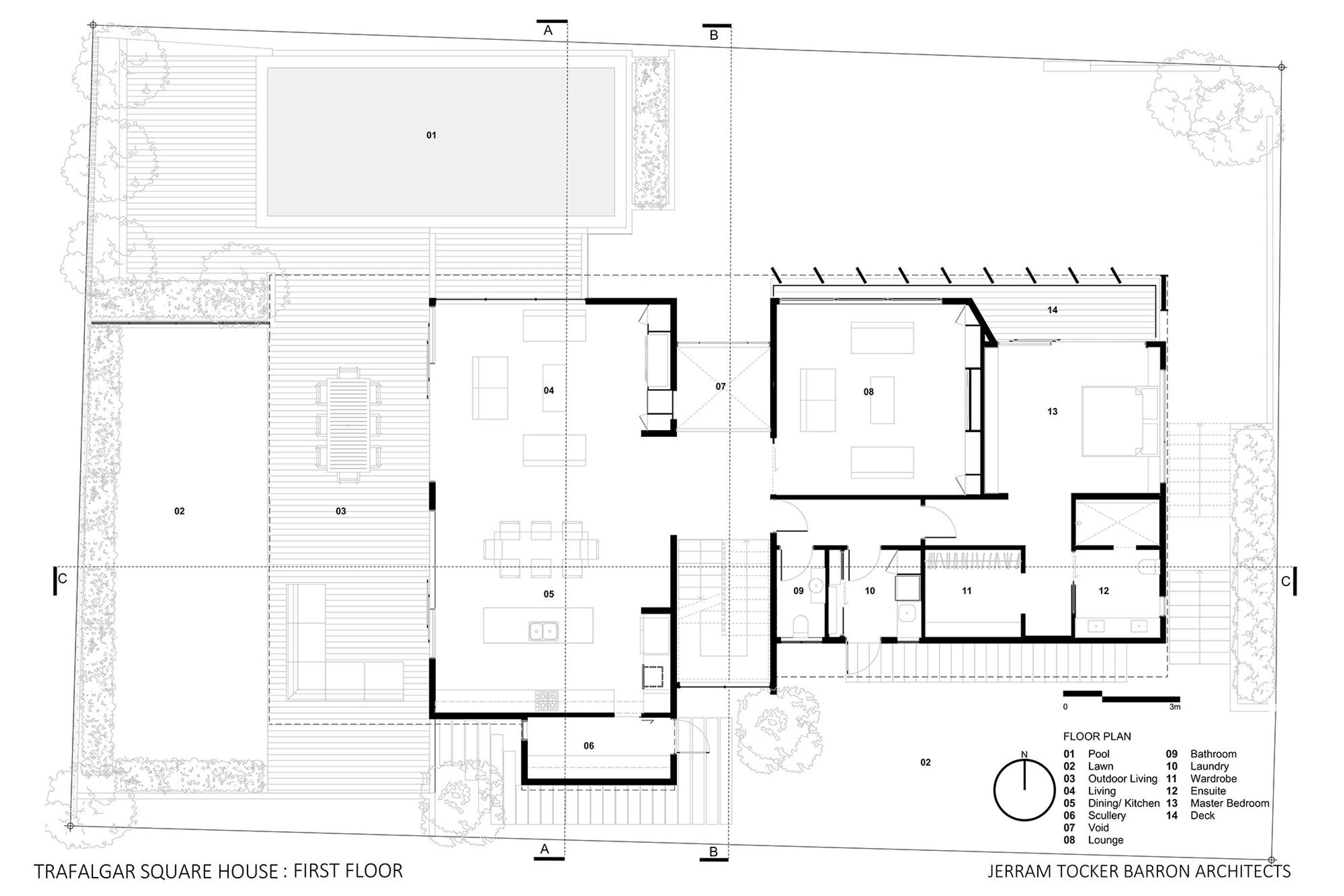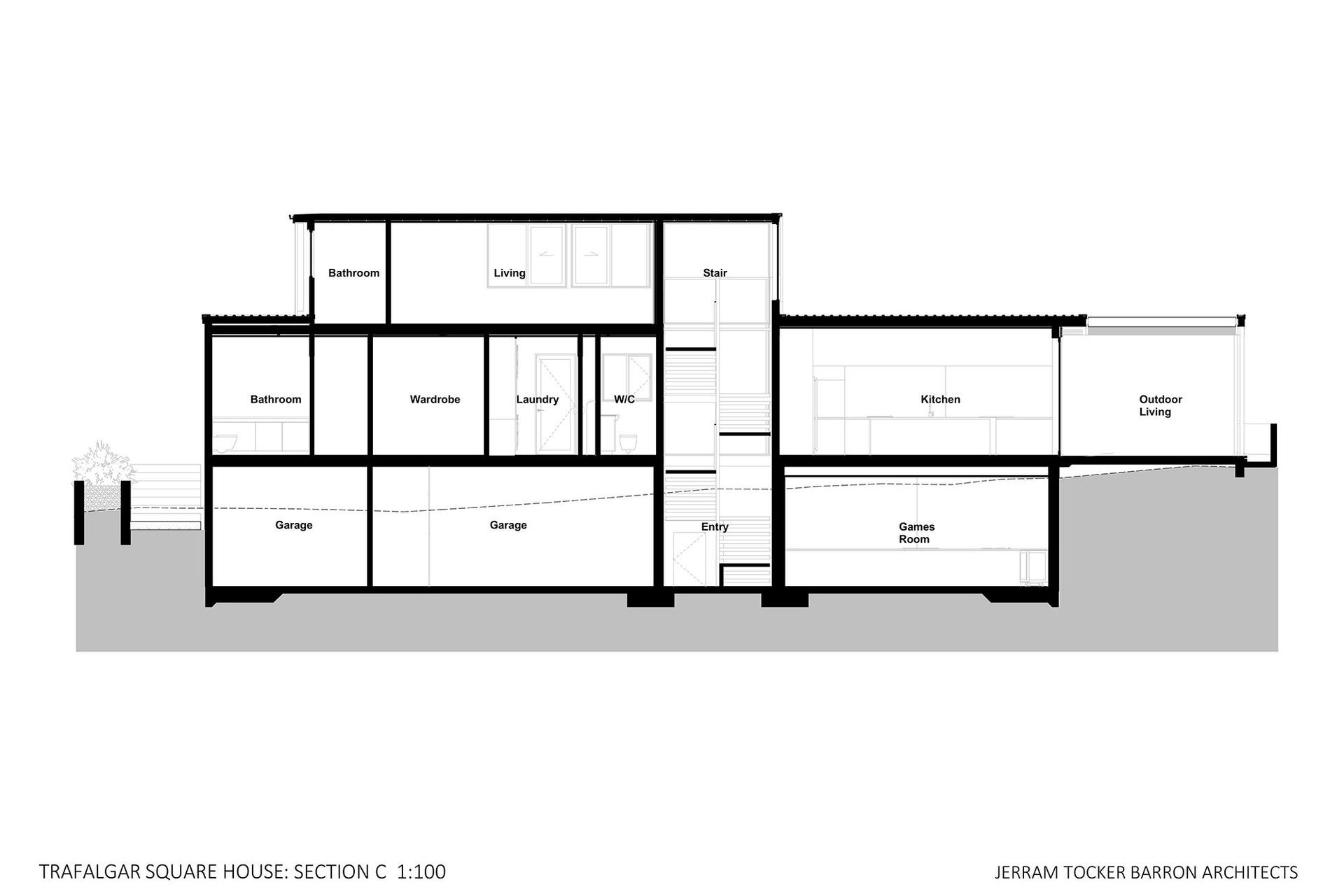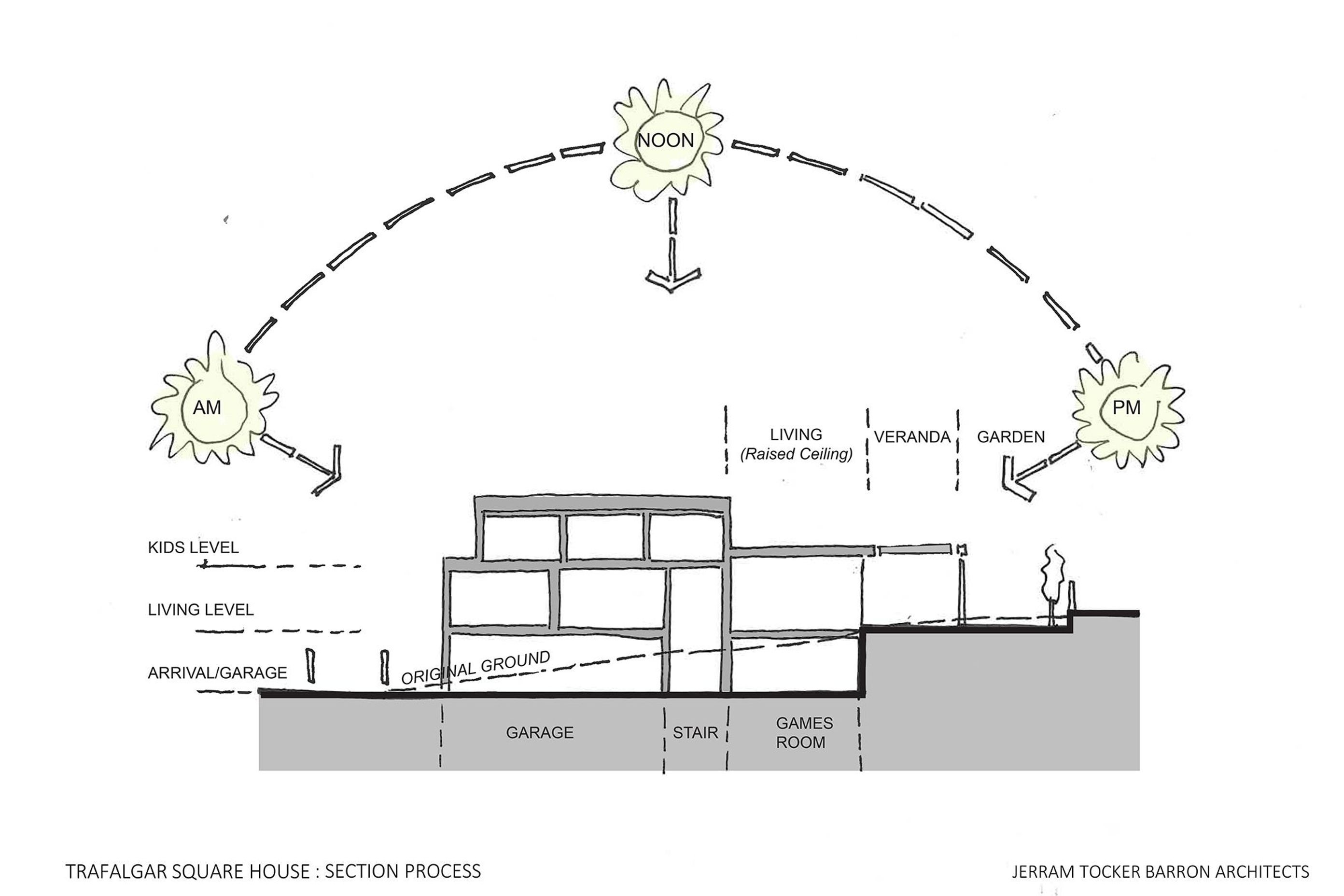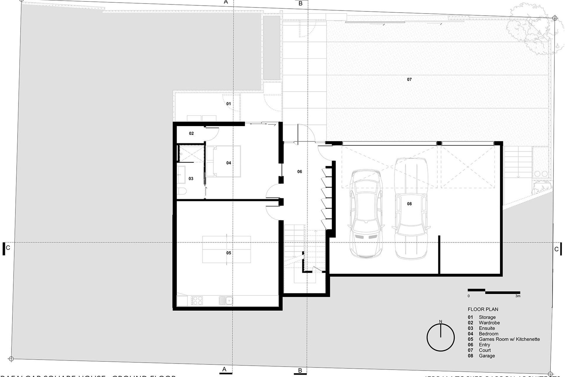 The house operates over three levels. The arrivals space, garage and forecourt are on the entry level; then, you rise up through the staircase to what is essentially a single-bedroomed apartment that opens into a garden to the west of the building.