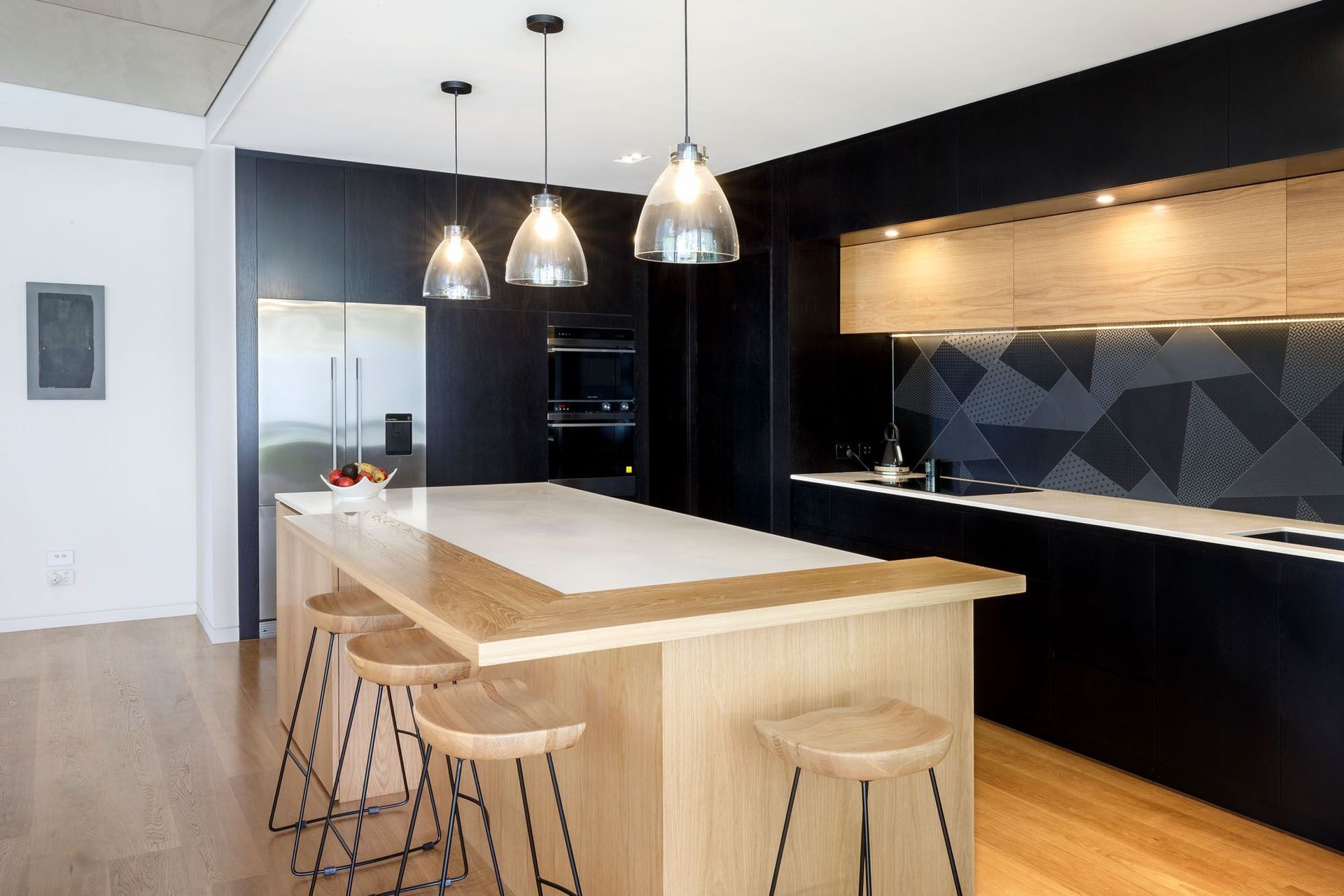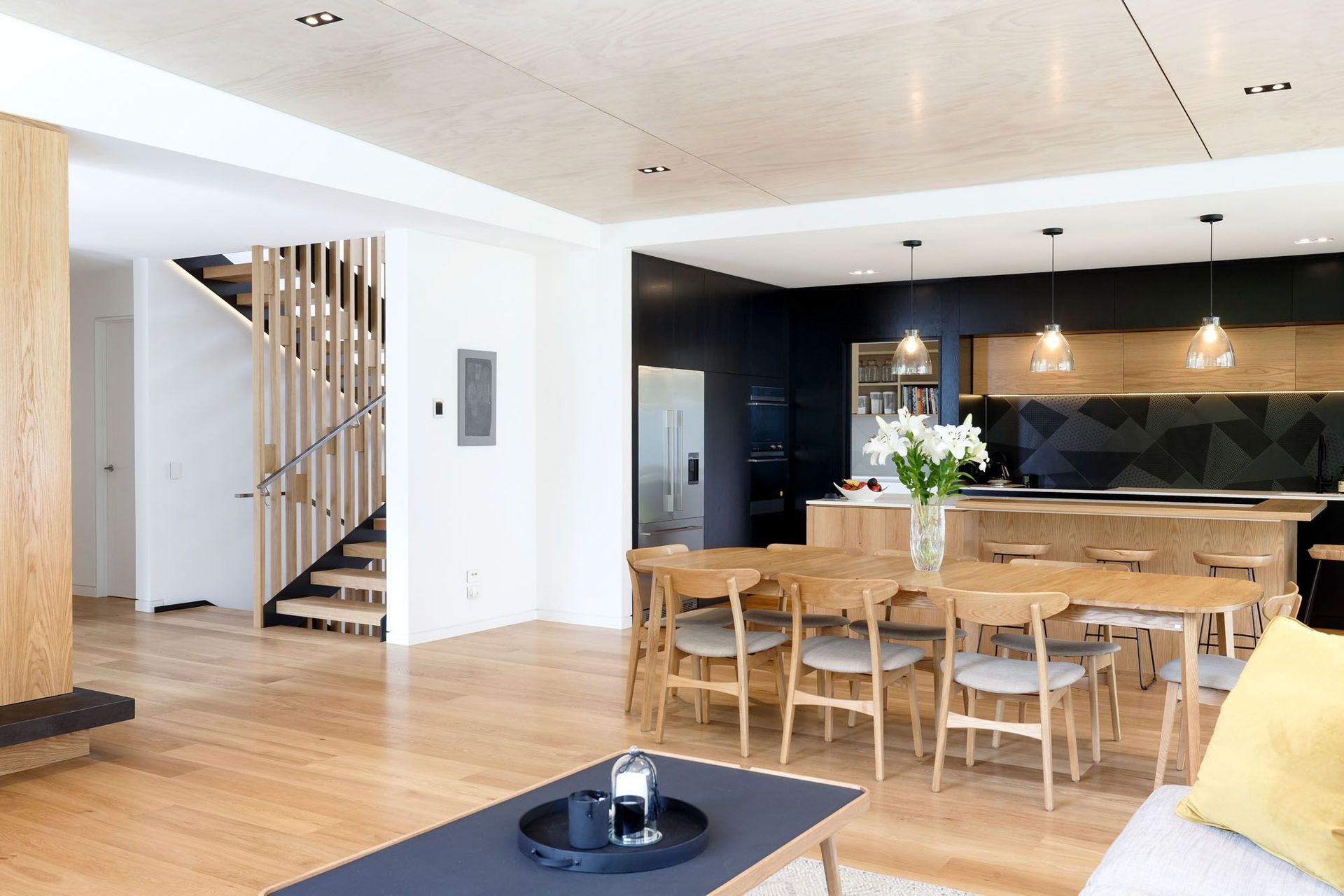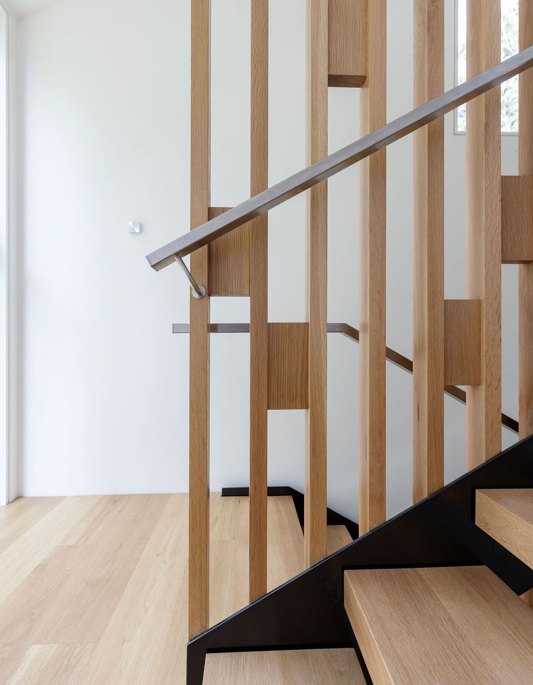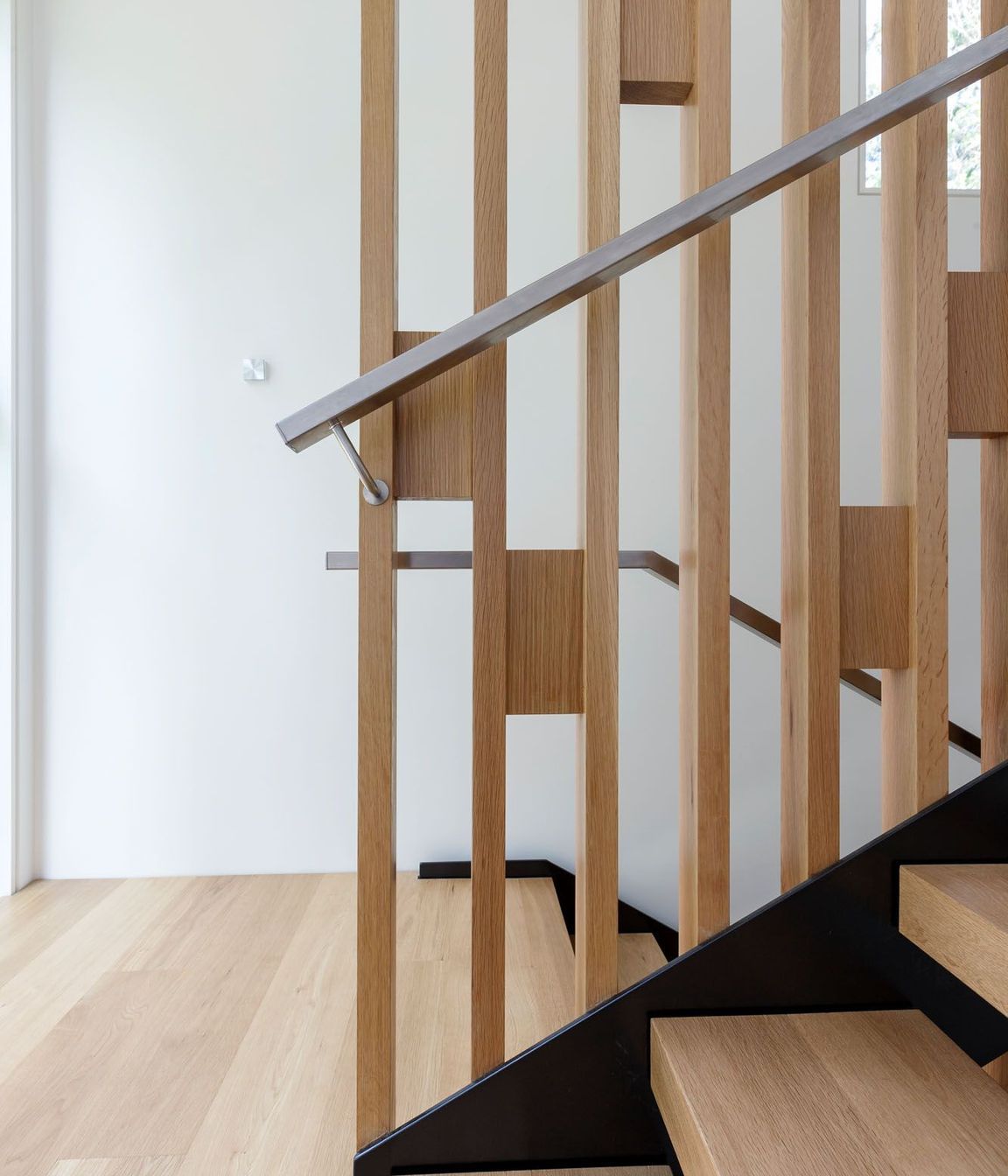 The central staircase from the entry is a main feature of the building, linking the three floors together. “We wanted the staircase to be like a piece of sculpture,” says Marc. “It has timber balustrades with wooden blocks in between that create bracing and provide a decorative patterned element.” The kitchen is also a distinctive design that utilises blonded timber with black and white surfaces to great effect. Both projects within the house were three-way collaborations between the architect, builder and joiner.