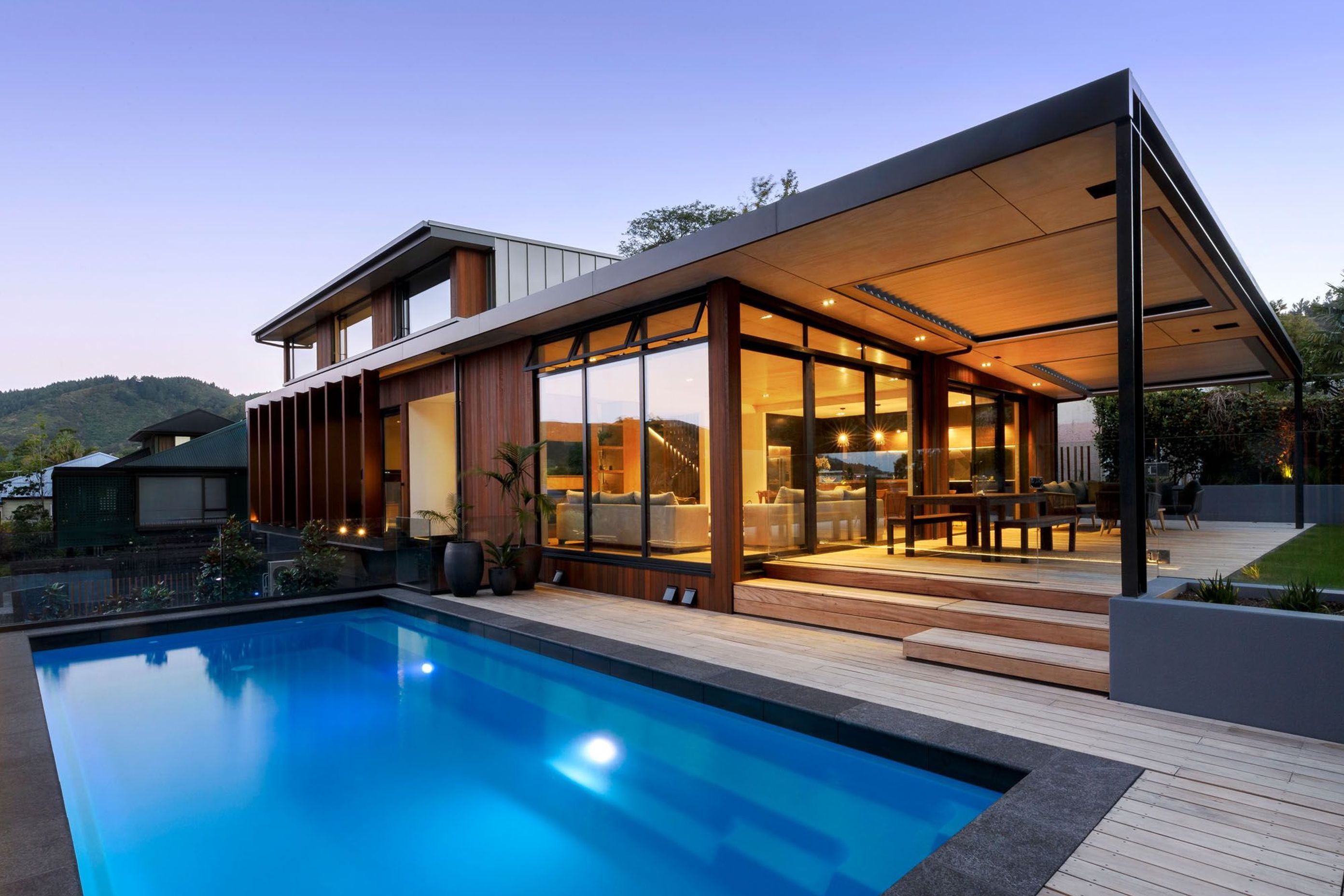 Here, the living areas were designed with indoor-outdoor flow in mind; a covered deck for al fresco dining features operable louvres to control the sunlight, which leads out to a flat grassy lawn beneath established trees that help to provide shelter. To the side, decking steps down to a swimming pool area with planted edges.