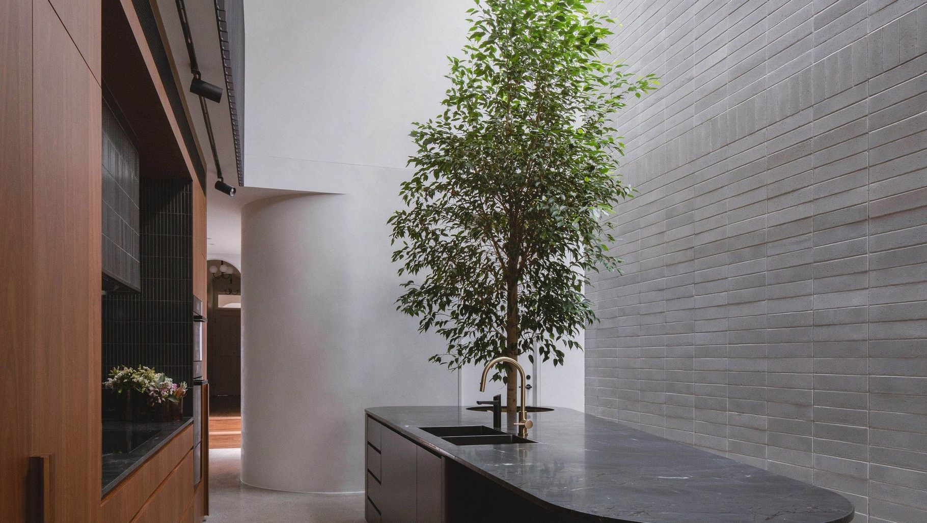 ArchiPro Project Summary - Tree Island: A striking family home that maximizes vertical space and light, featuring a central void with a fig tree, a private roof terrace, and a blend of robust materials, all while respecting its heritage context in Sydney's inner west.