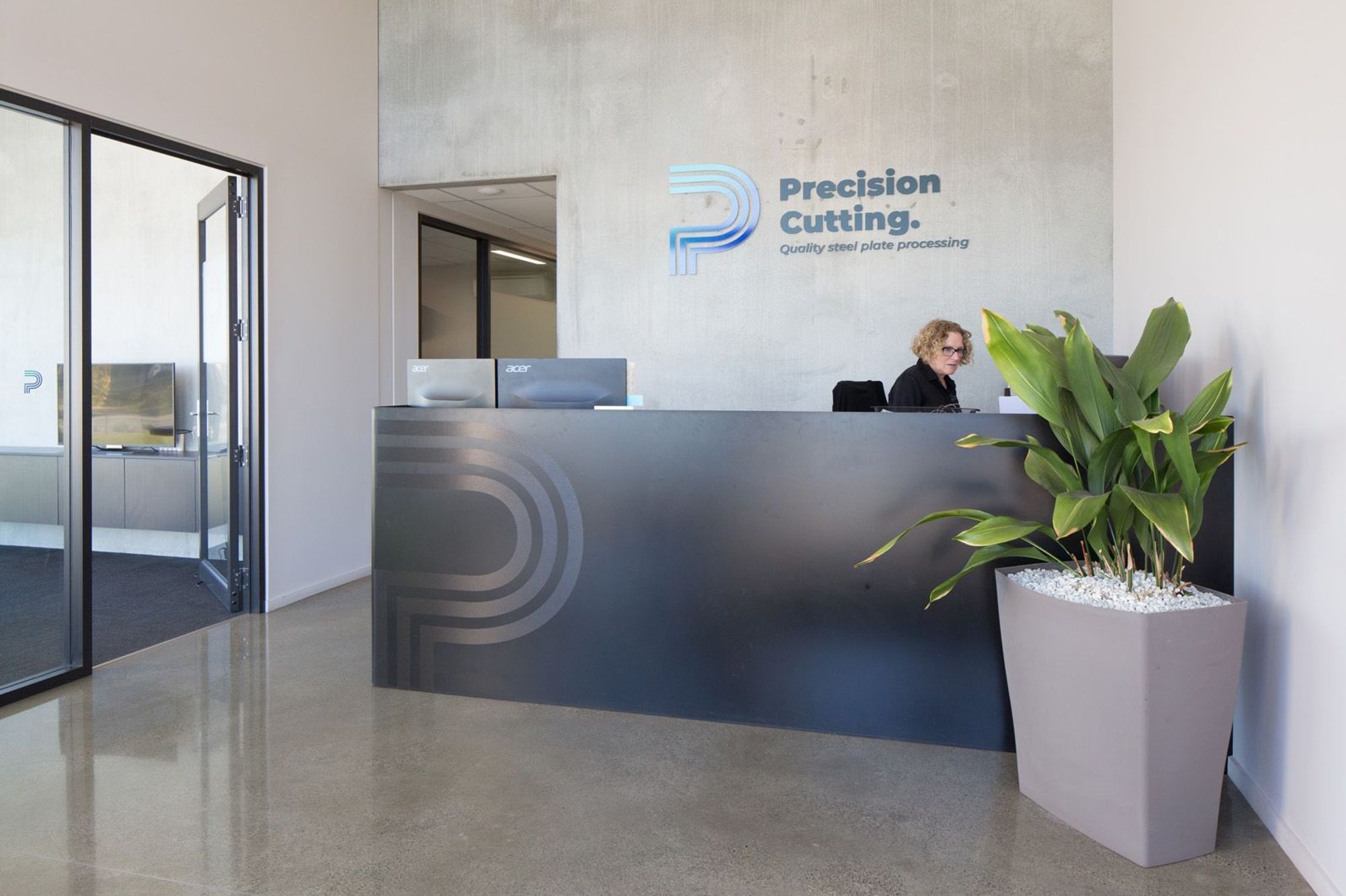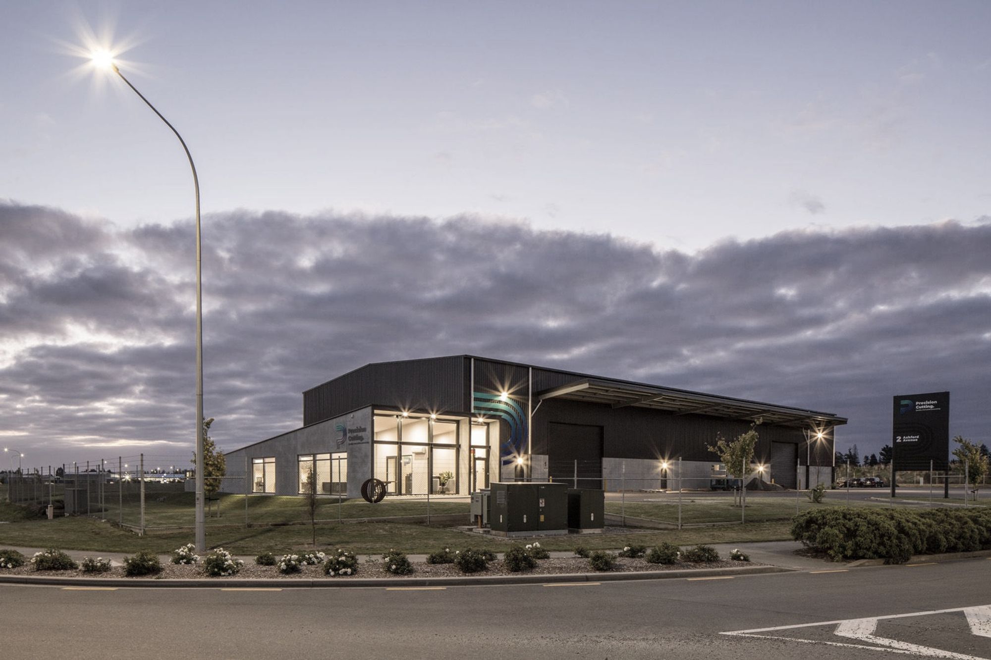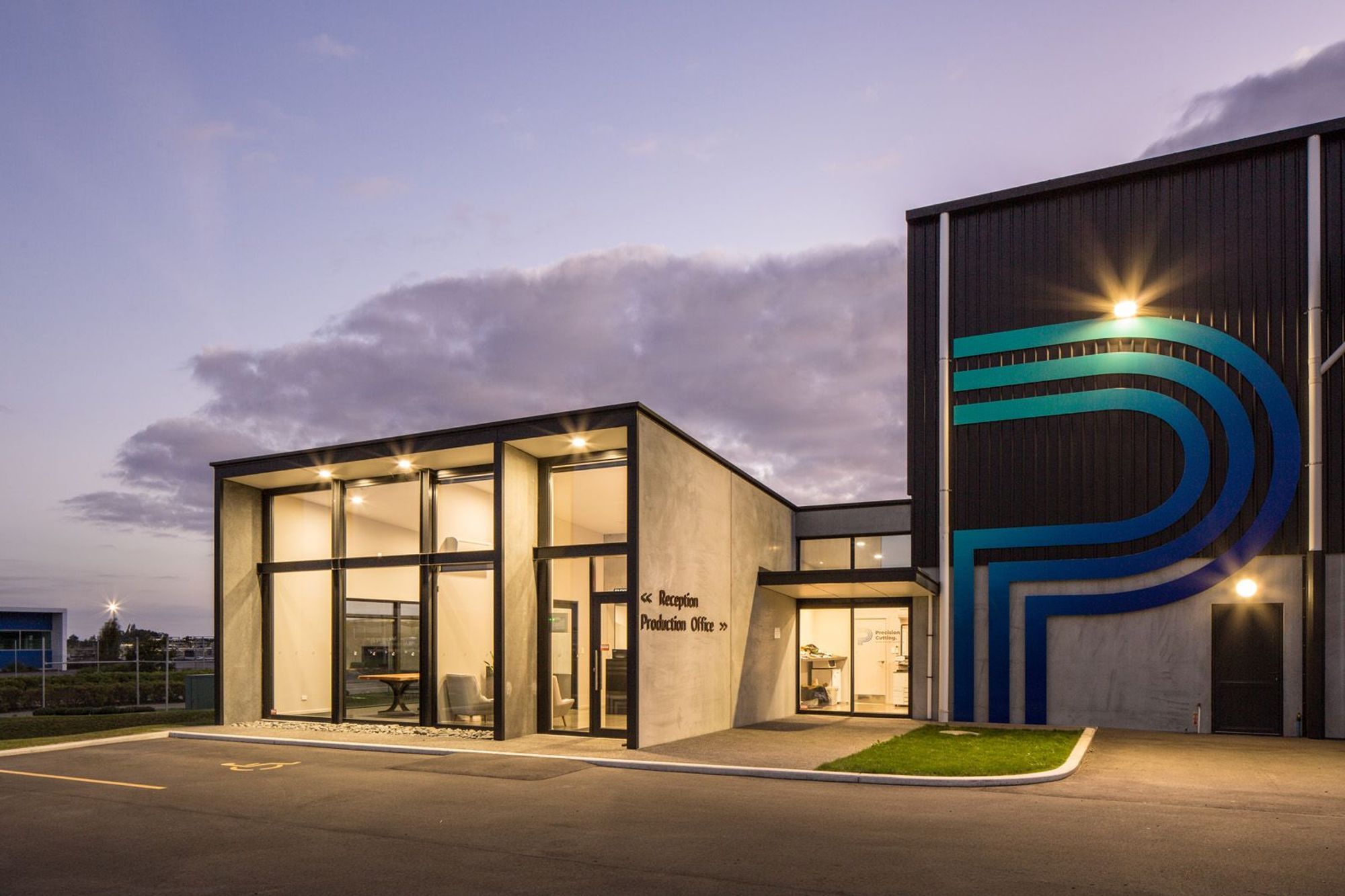 ArchiPro Project Summary - New office and factory in Ashburton Business Park featuring a 1,500m² cutting and processing facility with dual gantry cranes, complemented by a 238m² modern office designed to reflect the character of Precision Cutting.