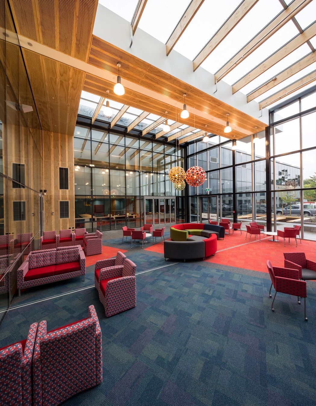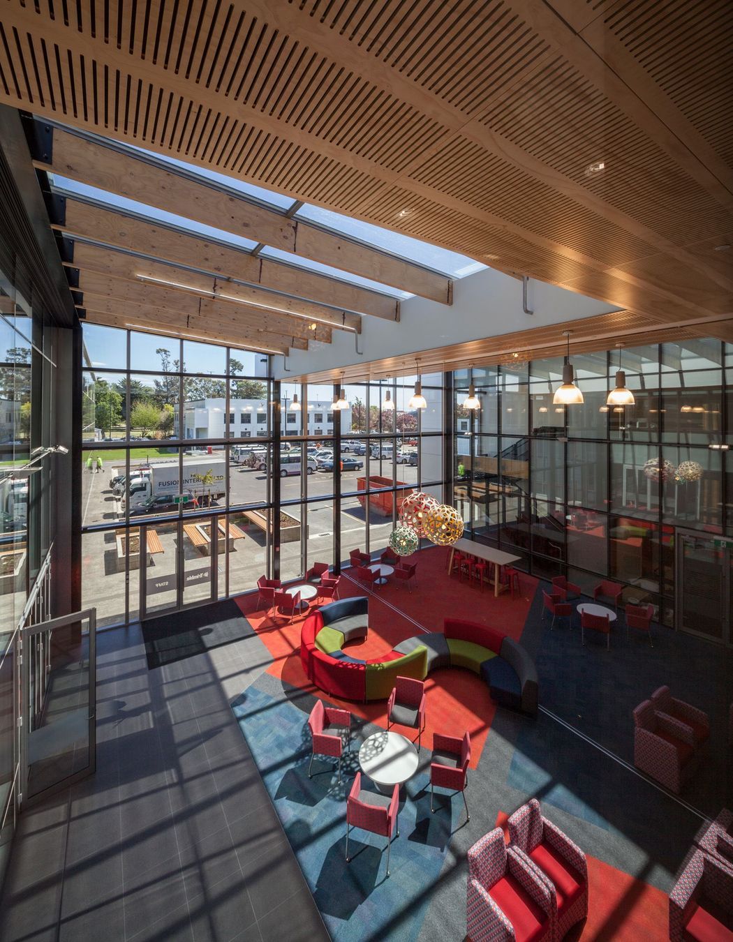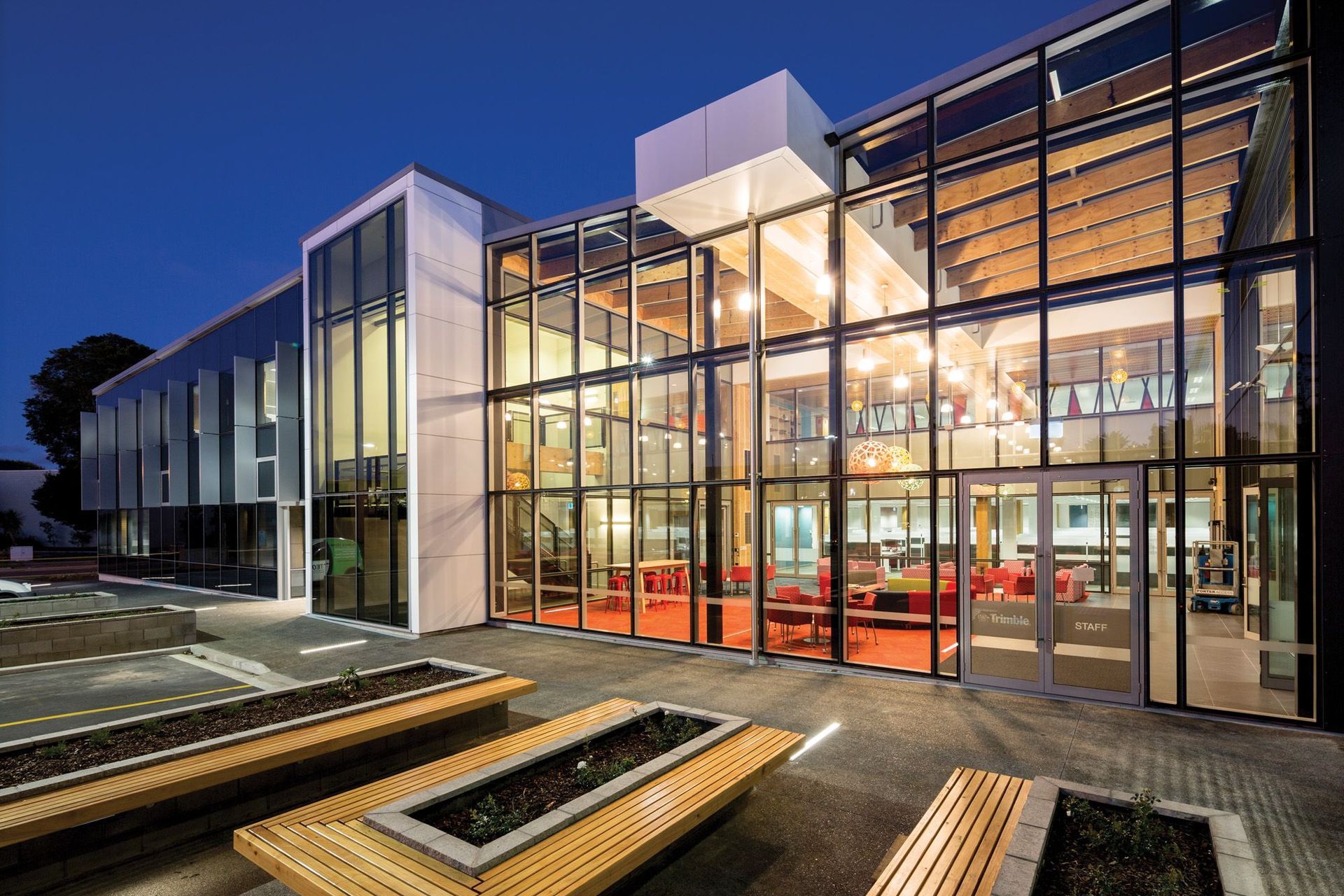 ArchiPro Project Summary - Innovative design for Trimble Navigation's new Christchurch office, incorporating advanced timber engineering and damage-limiting technology to meet current and future needs after the original building was lost to fire.