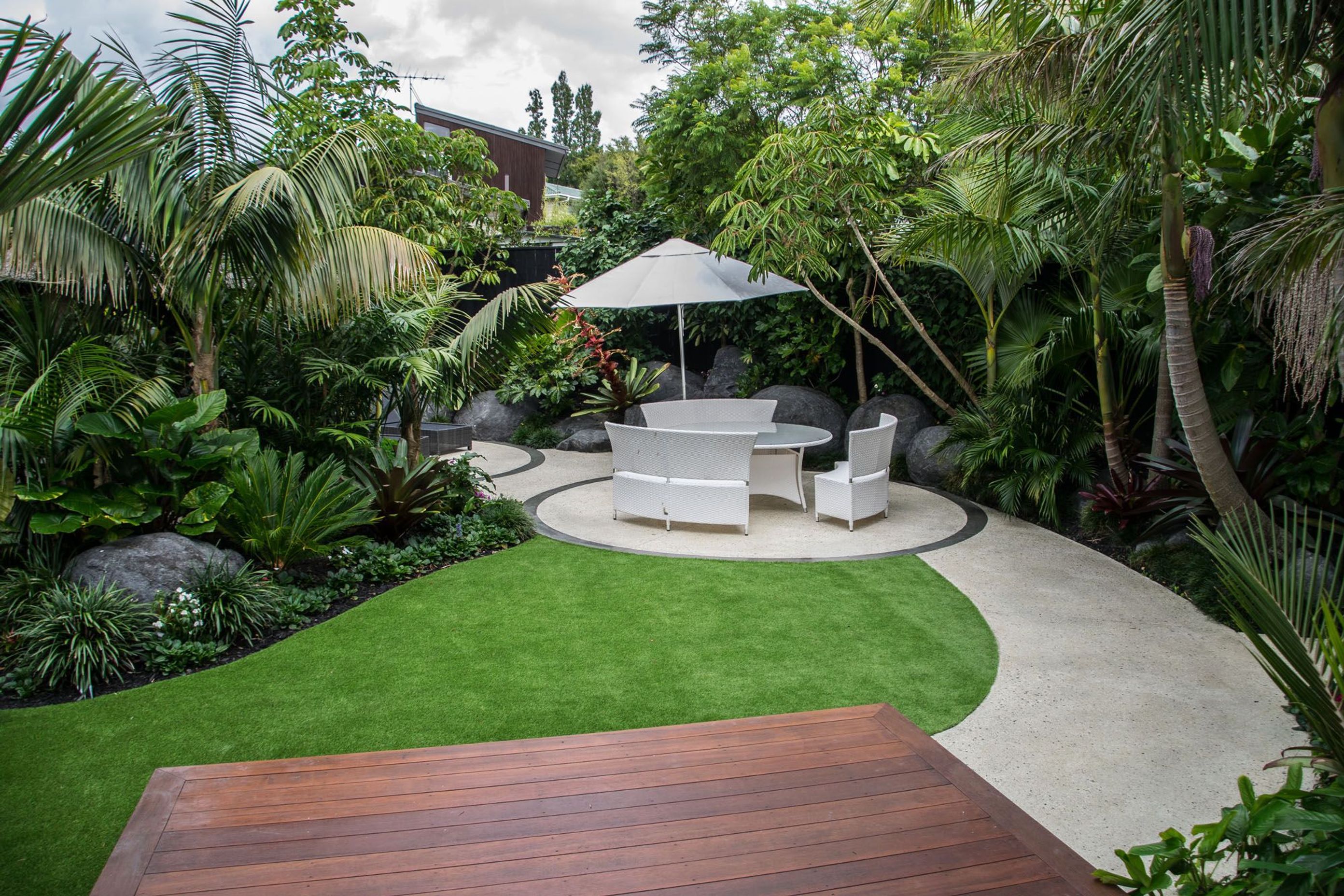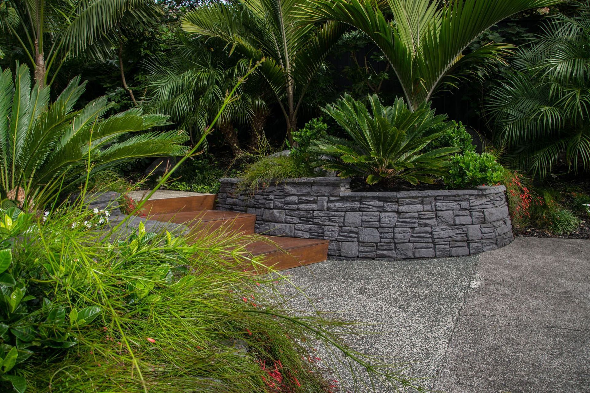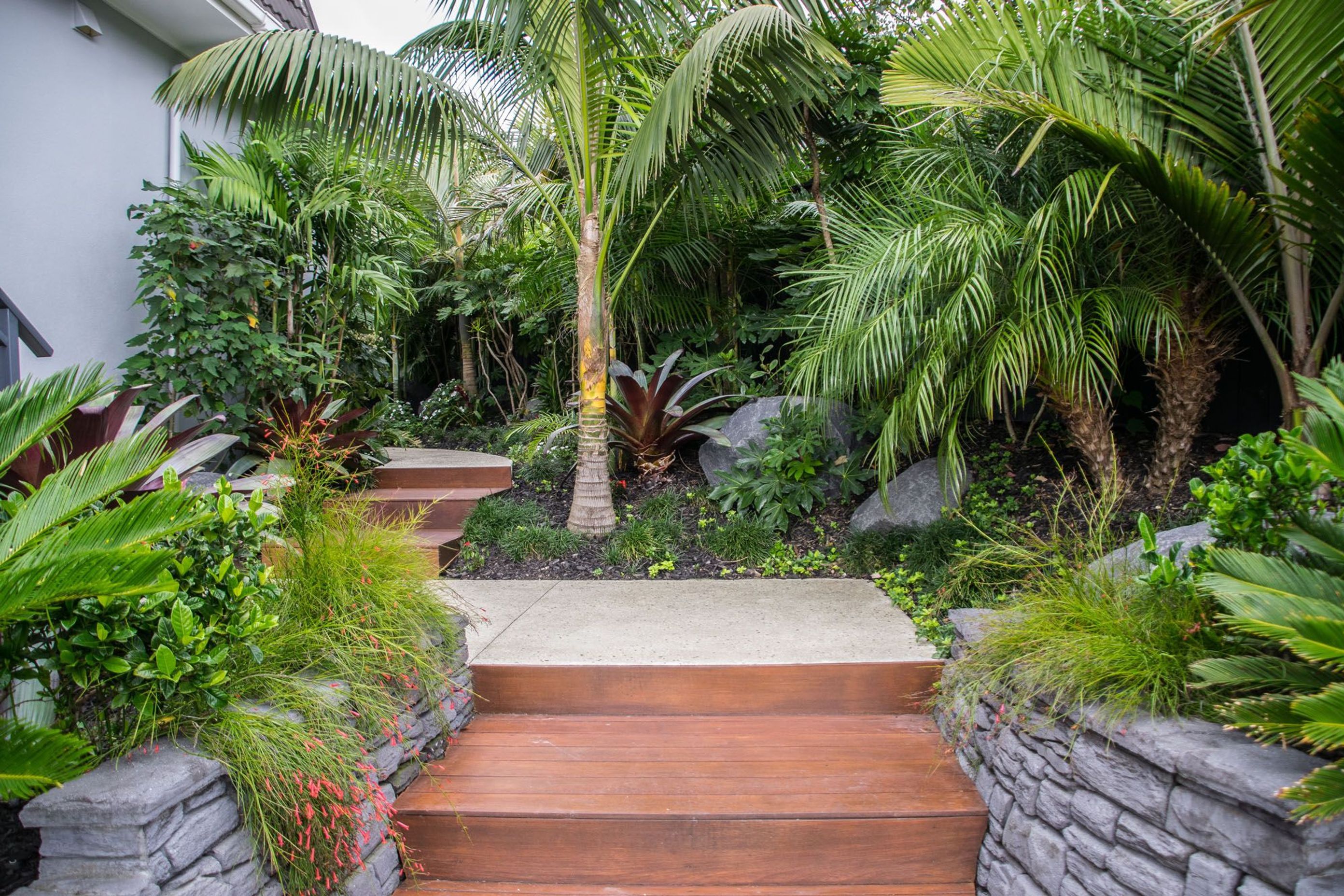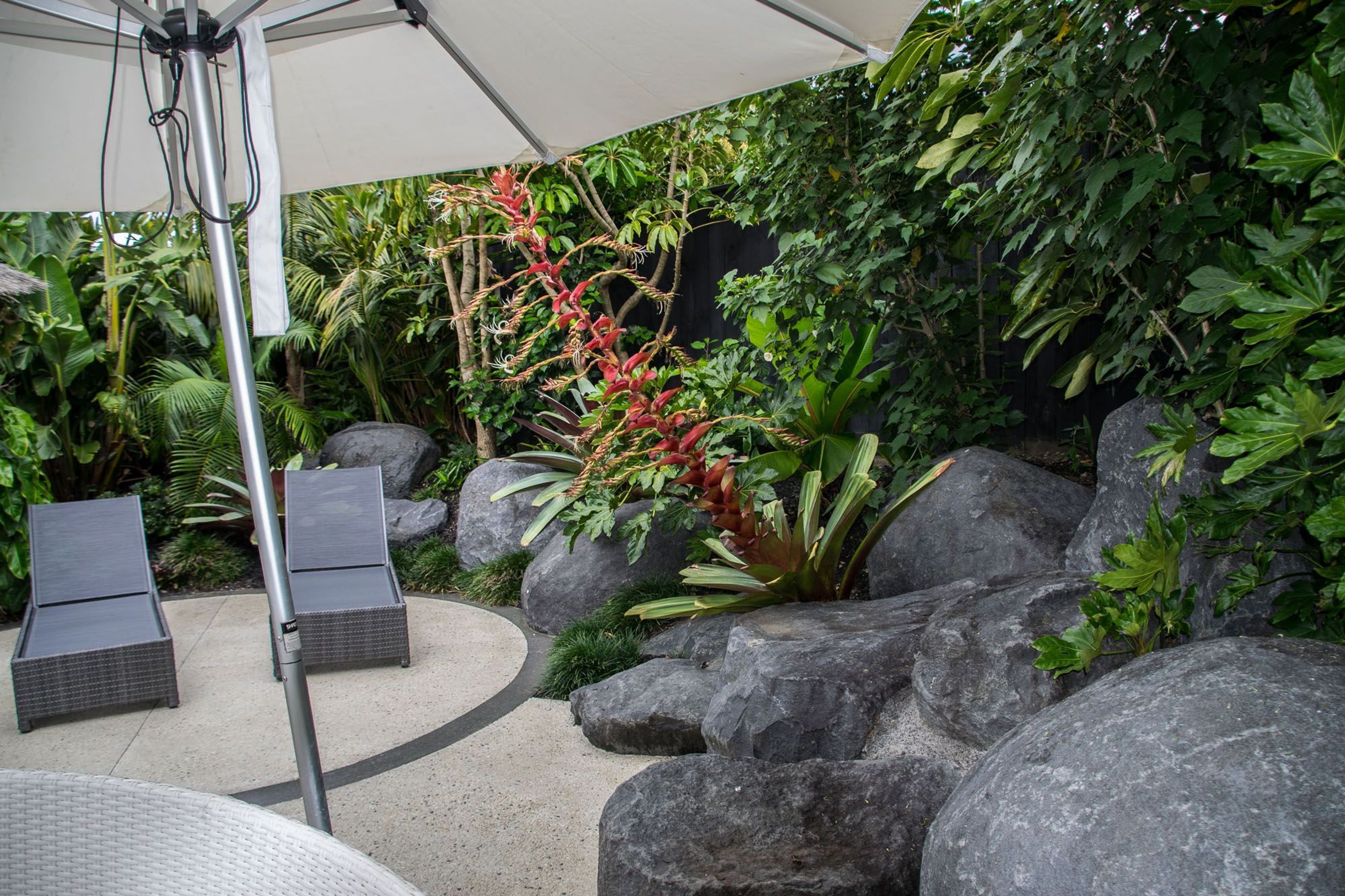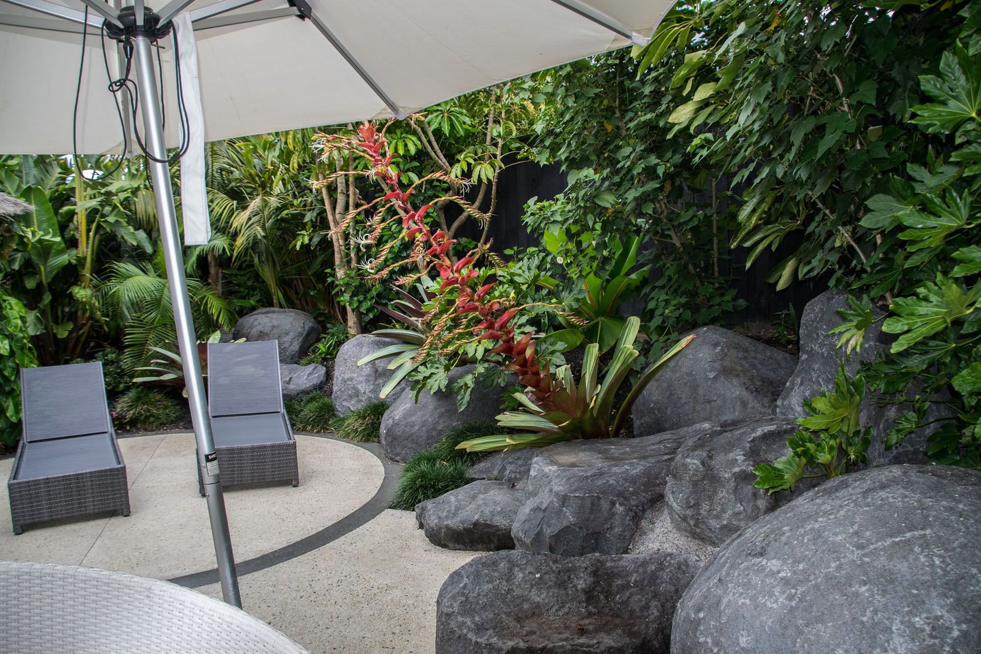 ArchiPro Project Summary - A stunning transformation of a Mairangi Bay backyard into a tropical paradise, featuring expertly placed boulders for retaining walls and elegant insitu concrete, creating a harmonious blend of luxury and practicality for family enjoyment.