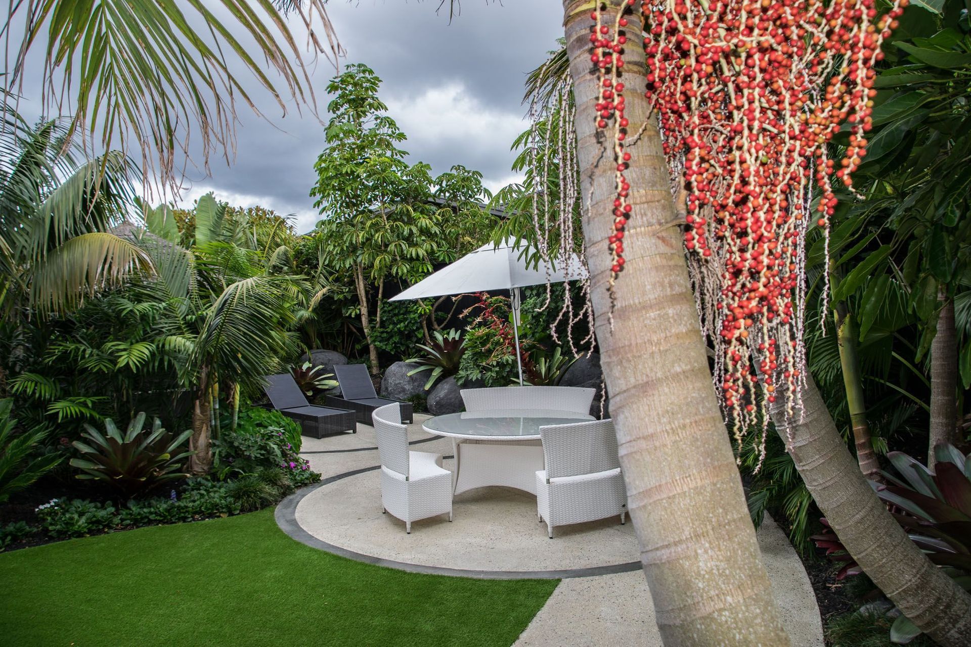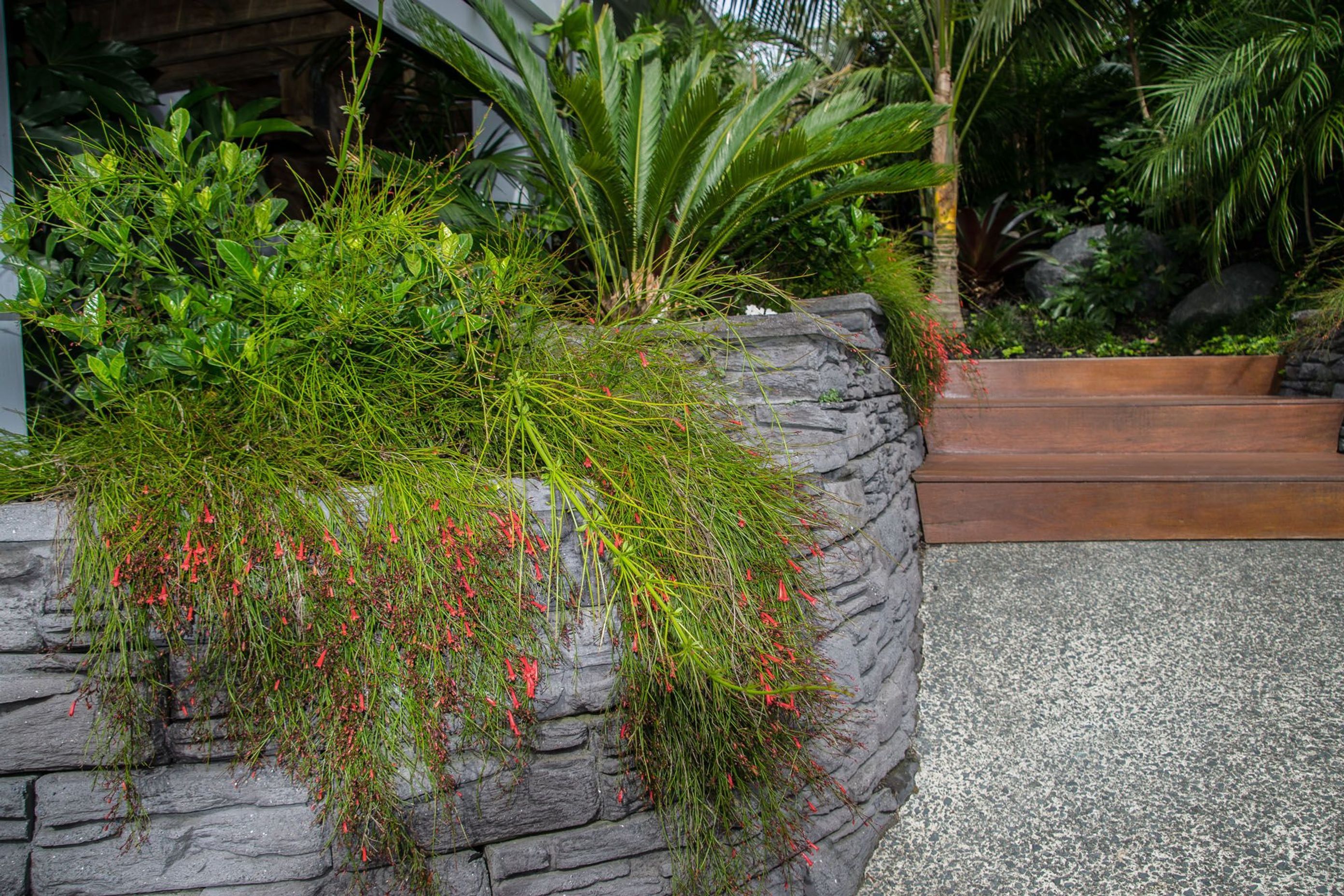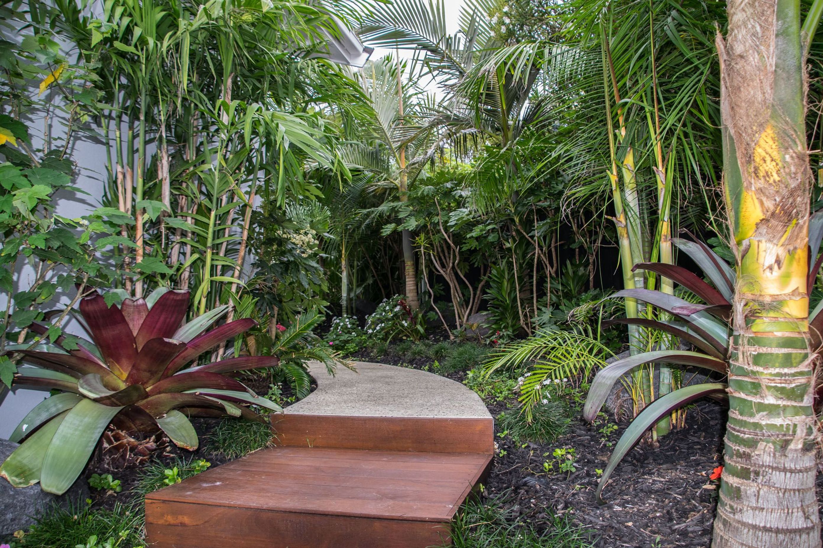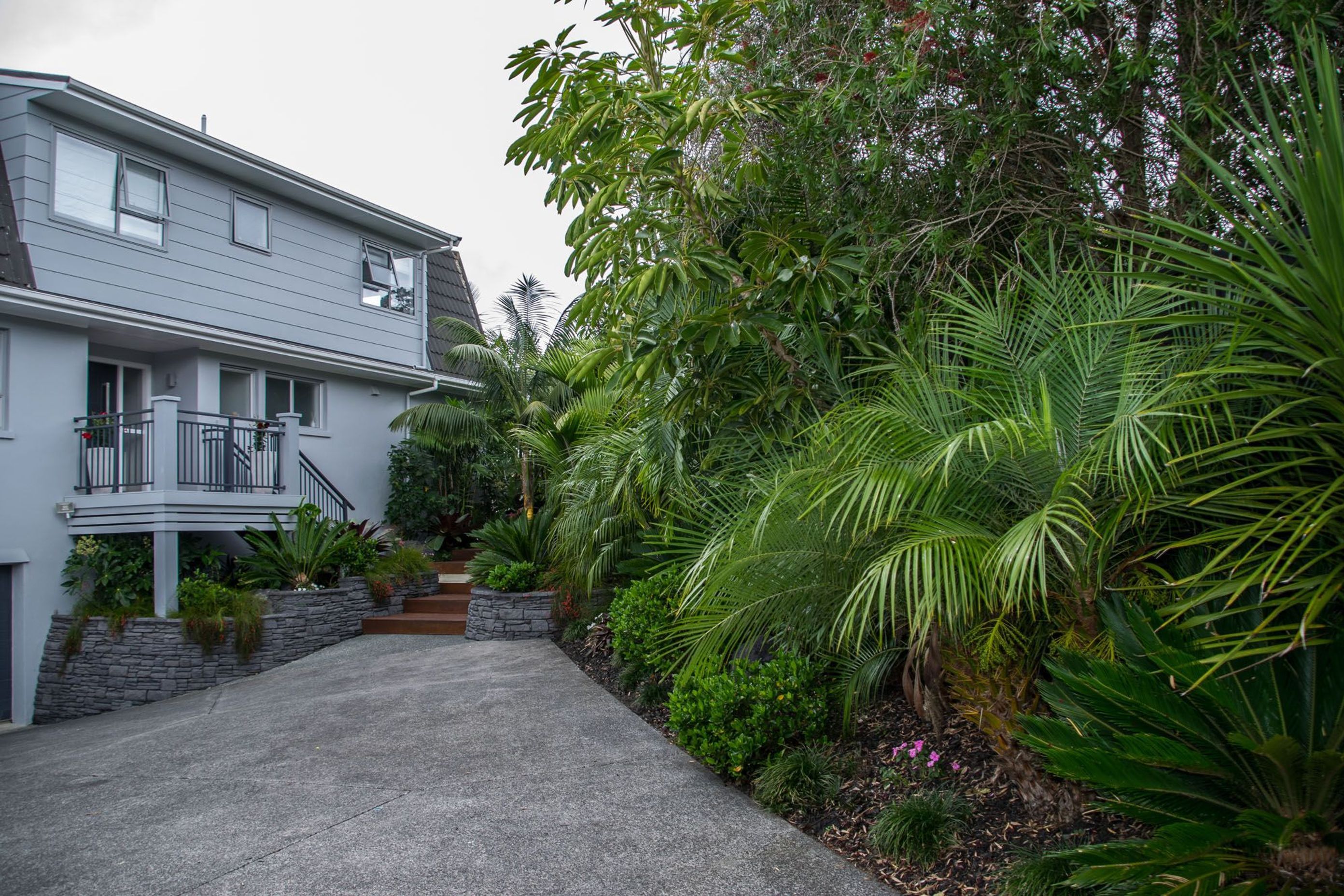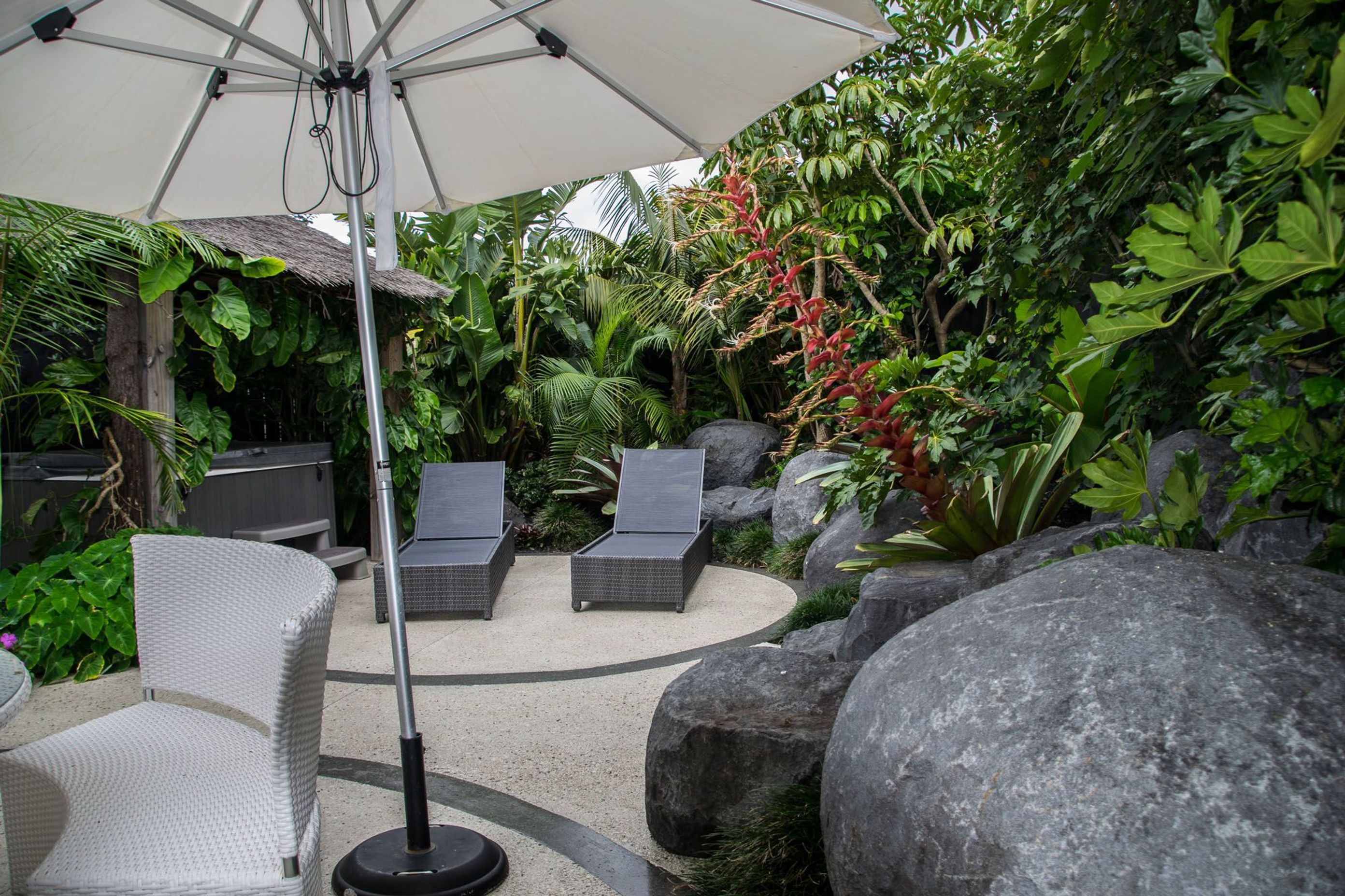 ArchiPro Project Summary - A stunning transformation of a Mairangi Bay backyard into a tropical paradise, featuring expertly placed boulders for retaining walls and elegant insitu concrete, creating a harmonious blend of luxury and practicality for family enjoyment.