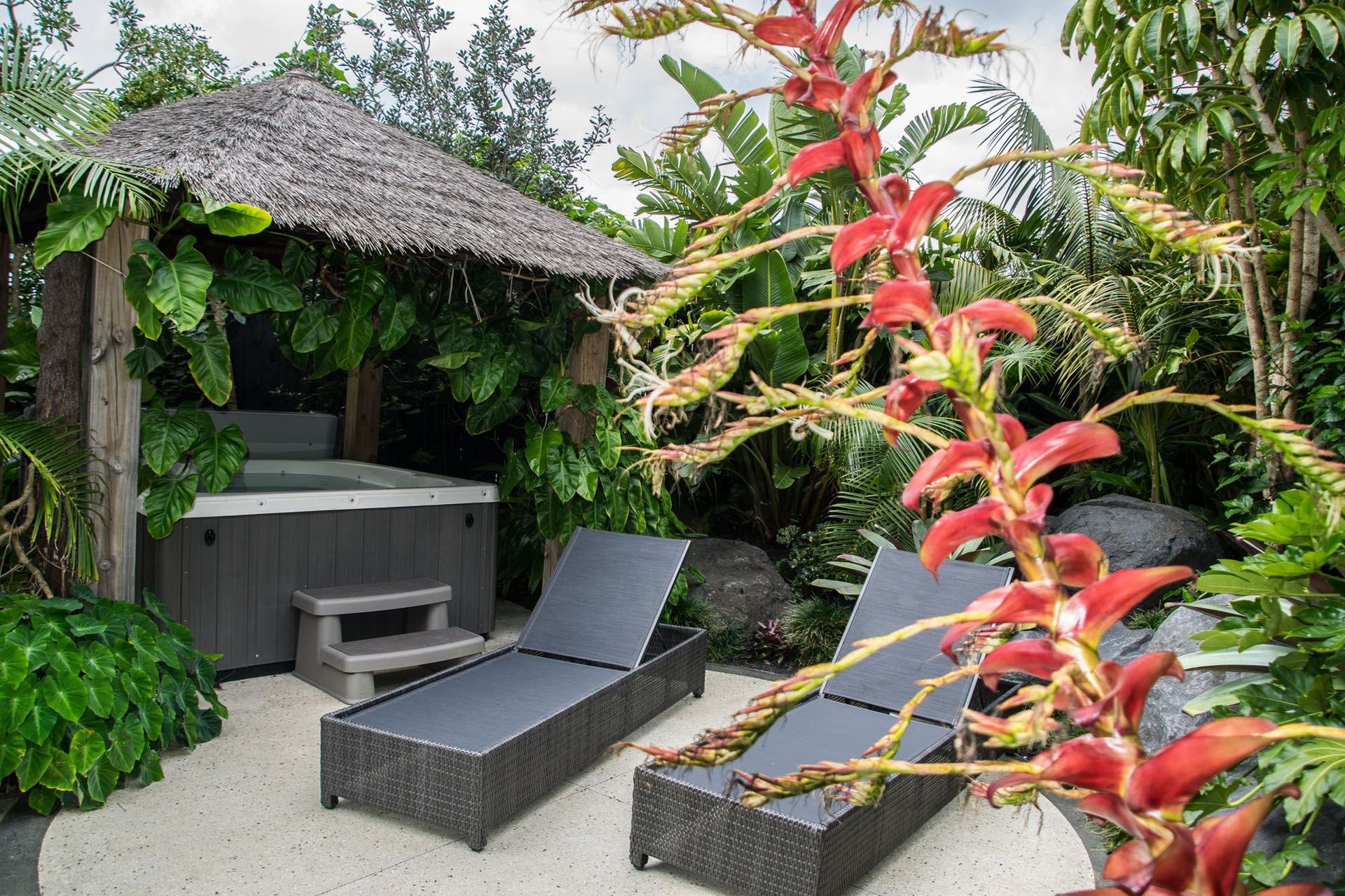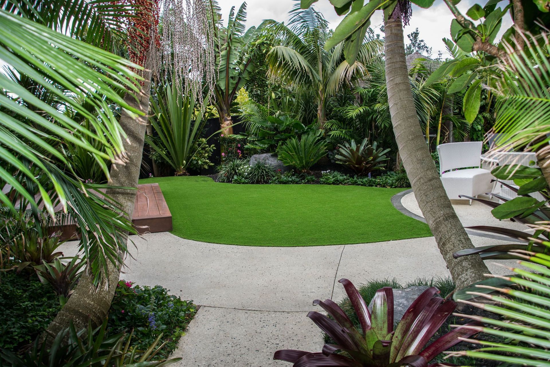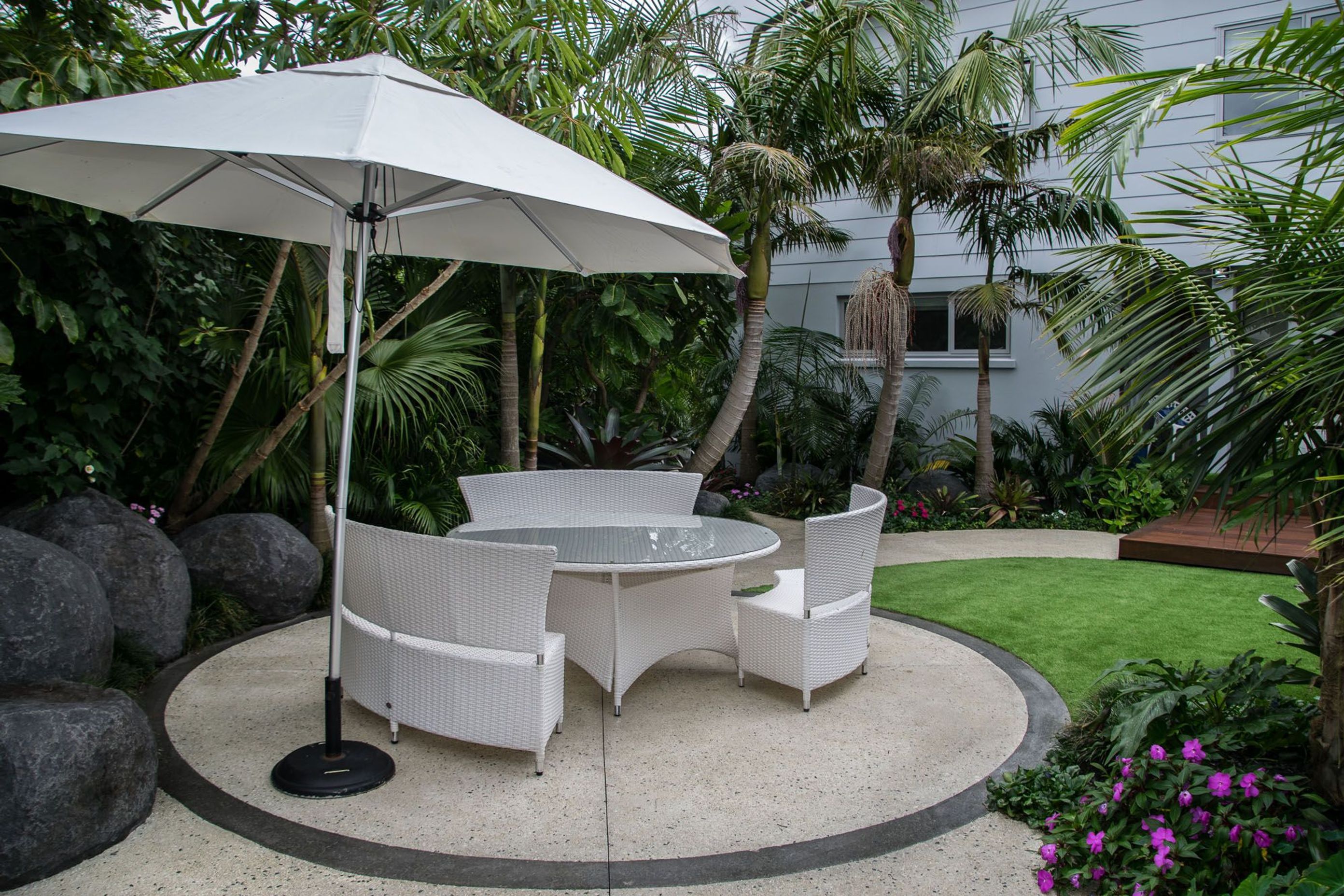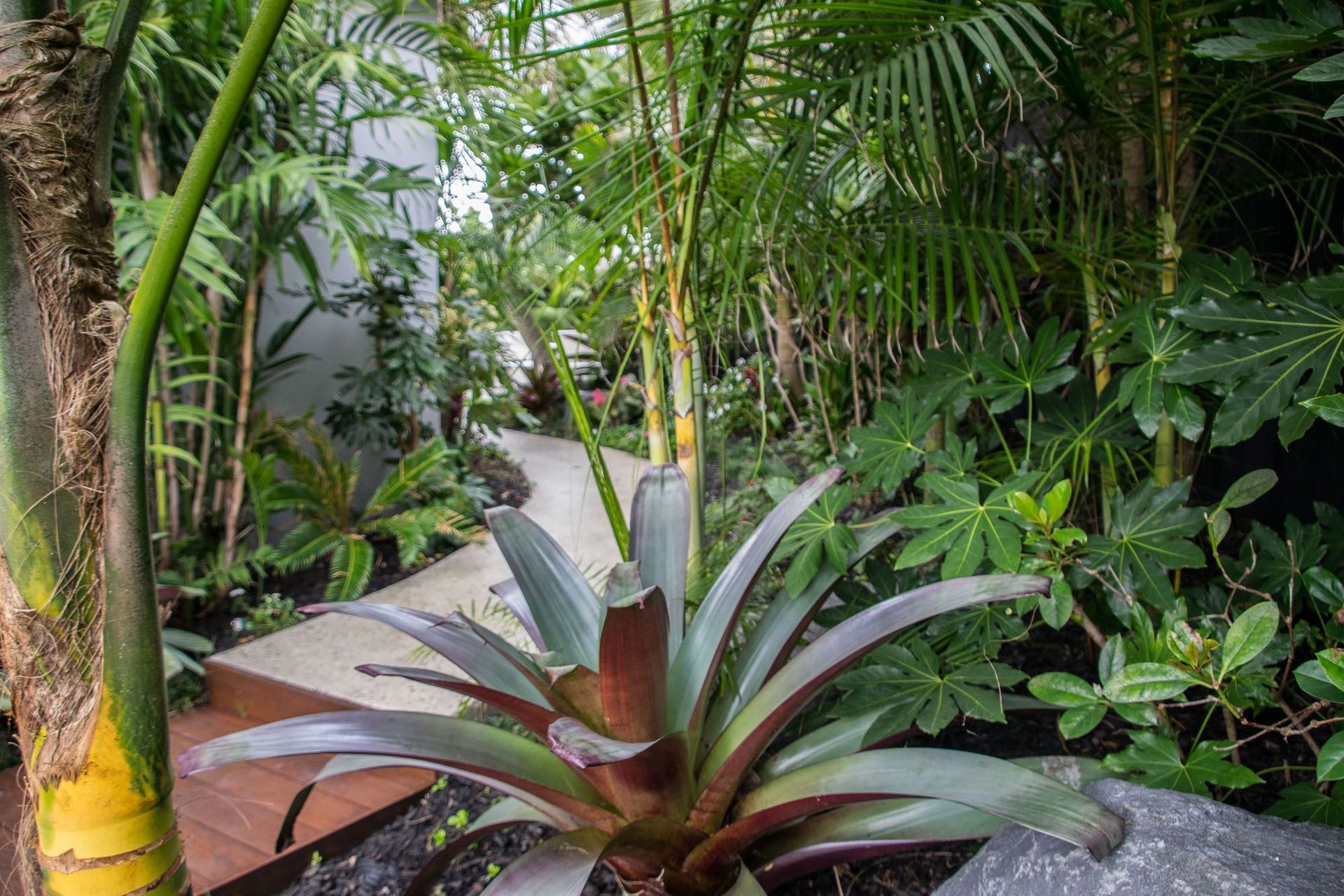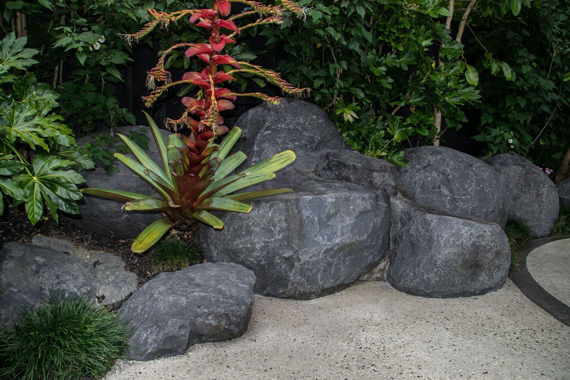 ArchiPro Project Summary - A stunning transformation of a Mairangi Bay backyard into a tropical paradise, featuring expertly placed boulders for retaining walls and elegant insitu concrete, creating a harmonious blend of luxury and practicality for family enjoyment.
