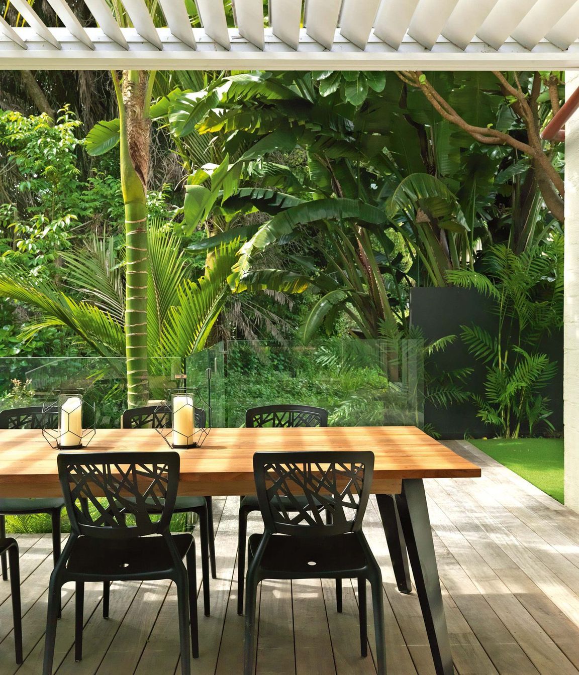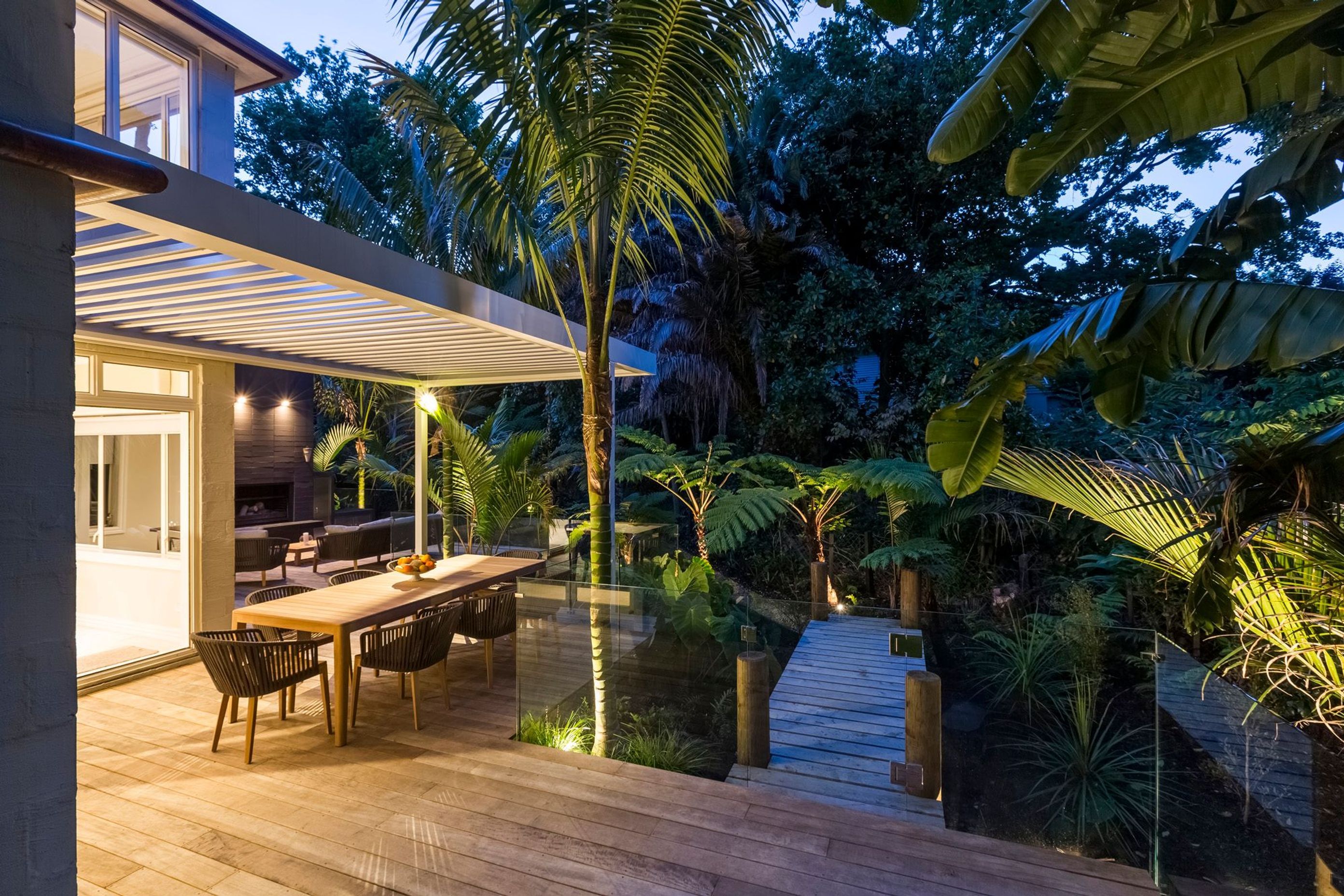 ArchiPro Project Summary - Transforming a challenging site into a tropical oasis for family living, featuring enhanced outdoor spaces, a louvre roof for sheltered entertainment, and a striking feature bridge, all while maximizing natural vistas and child-friendly play areas.