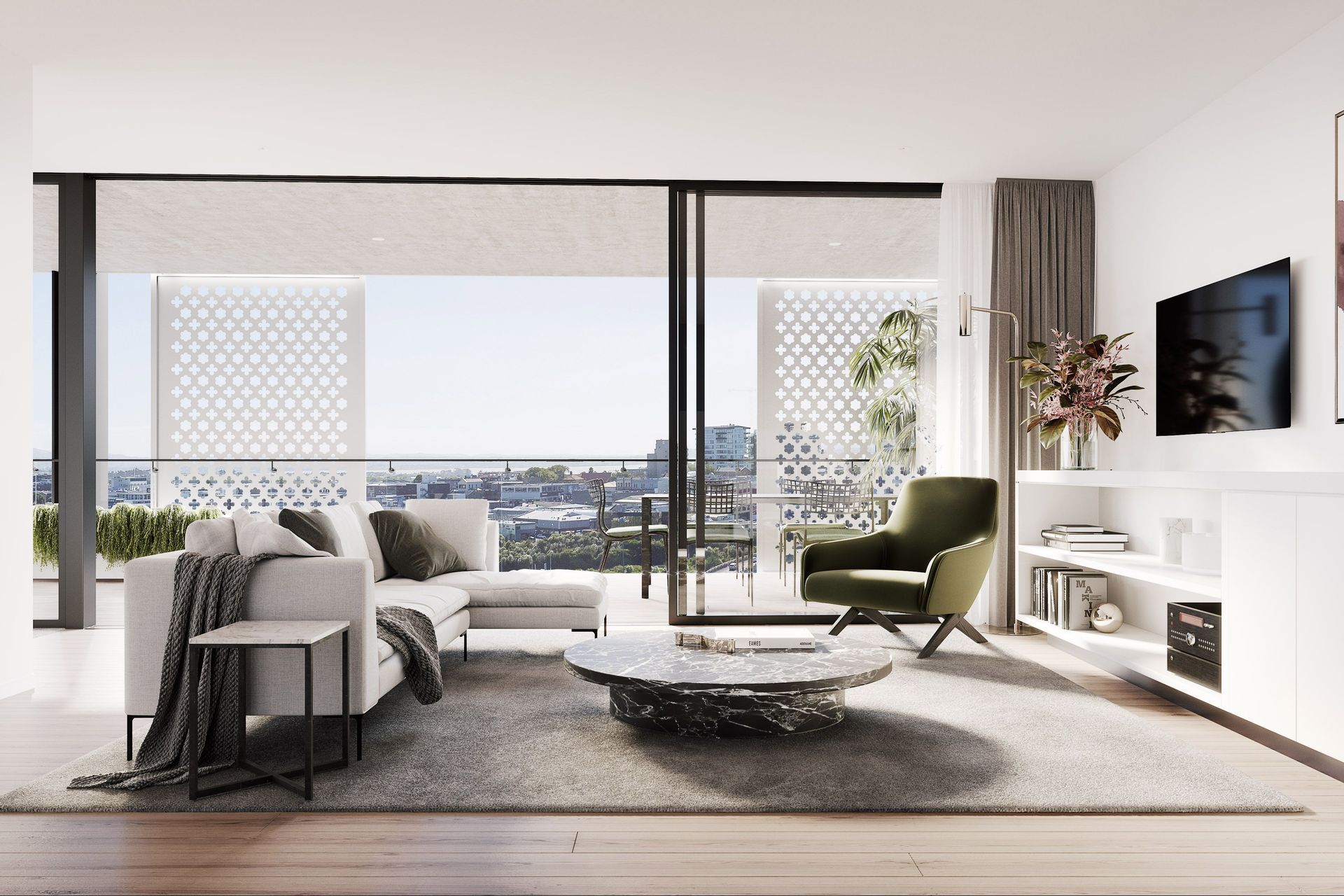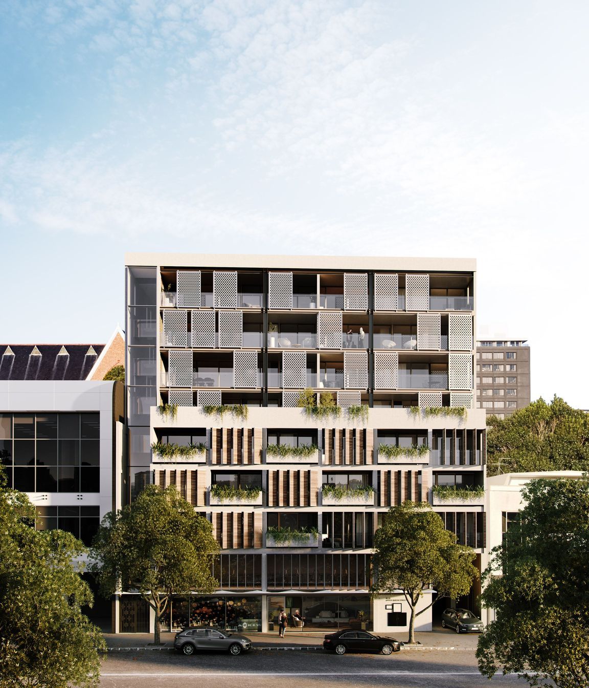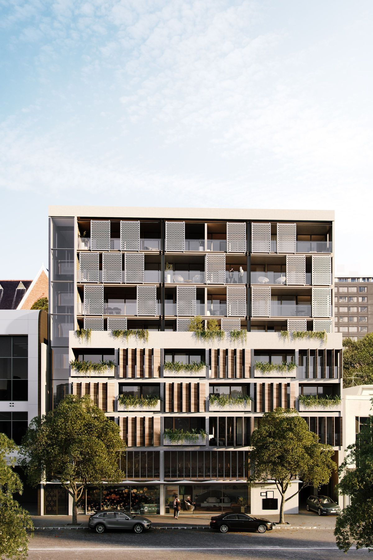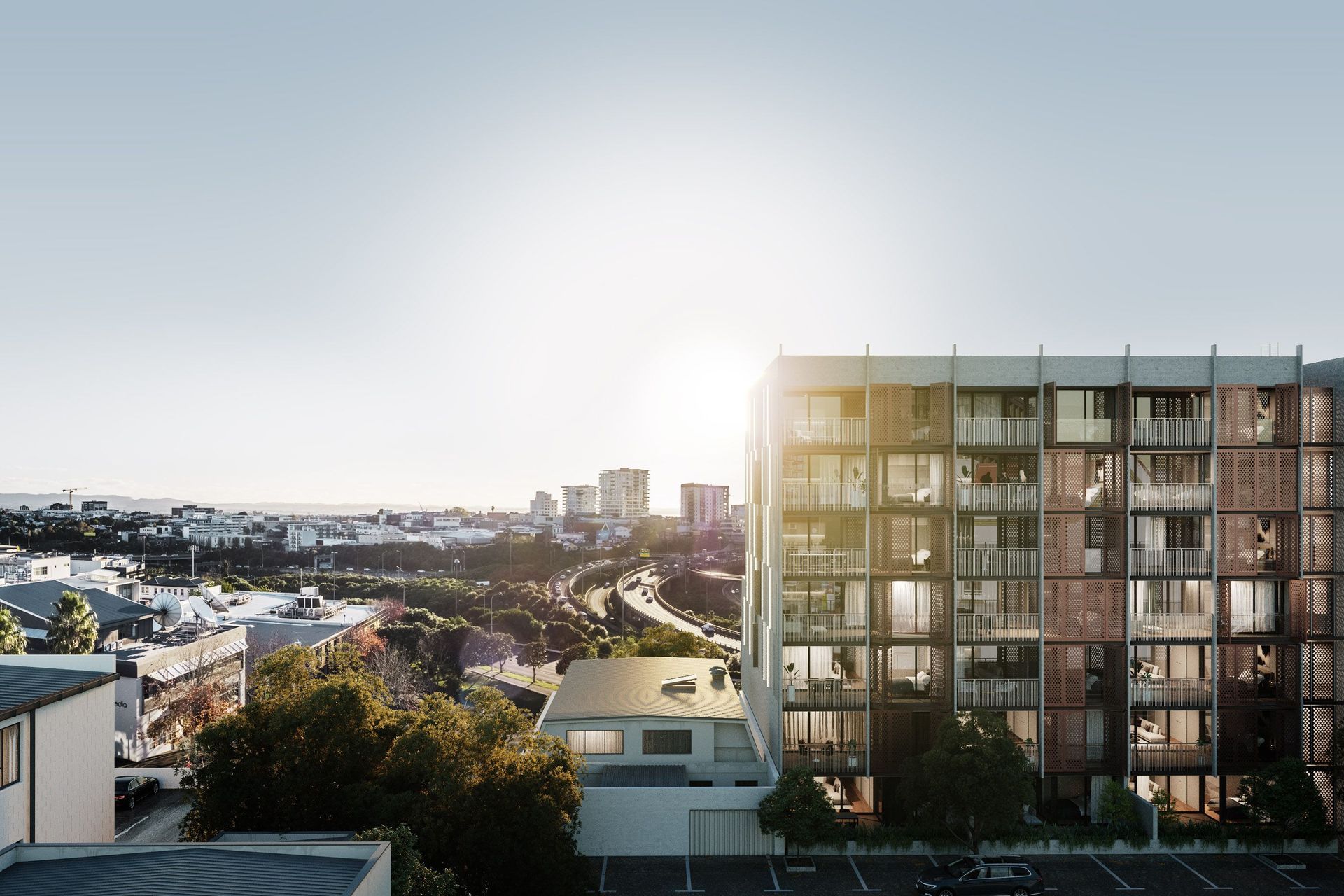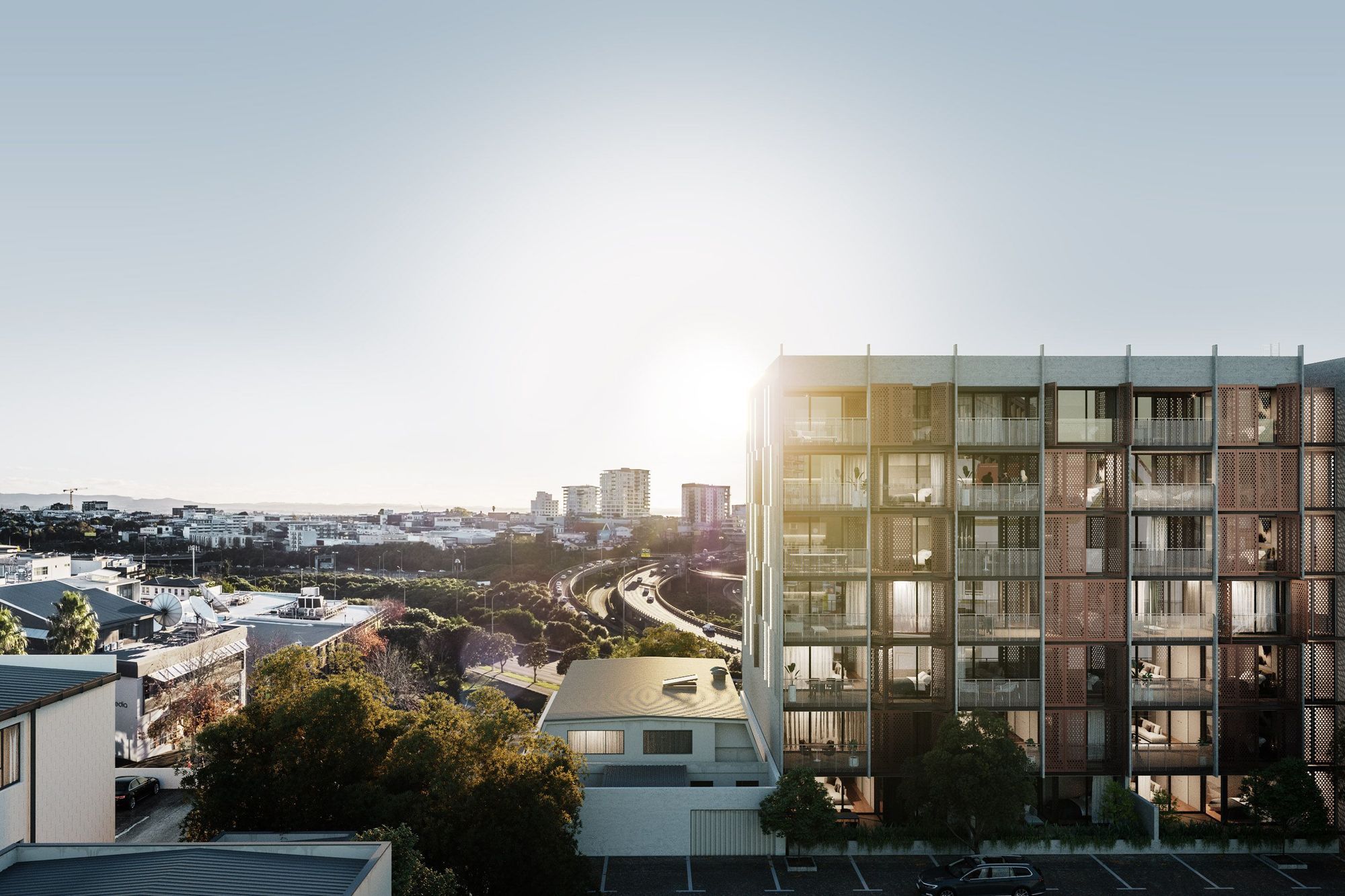 ArchiPro Project Summary - Upper Queen Street Apartments: A contemporary residential development featuring 35 apartments above retail space, designed with a striking blend of concrete and timber cladding, expansive balconies, and thoughtful architectural elements that harmonize with the surrounding urban landscape.
