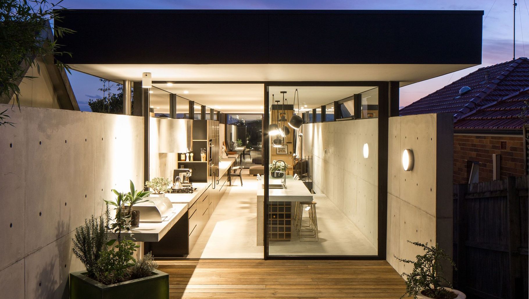 A kitchen comprised of raw form-ply, polished concrete and stainless steel has been positioned at the rear of the first floor such that a bbq sitting on a continuous bench has become a part of the daily cooking experience.
