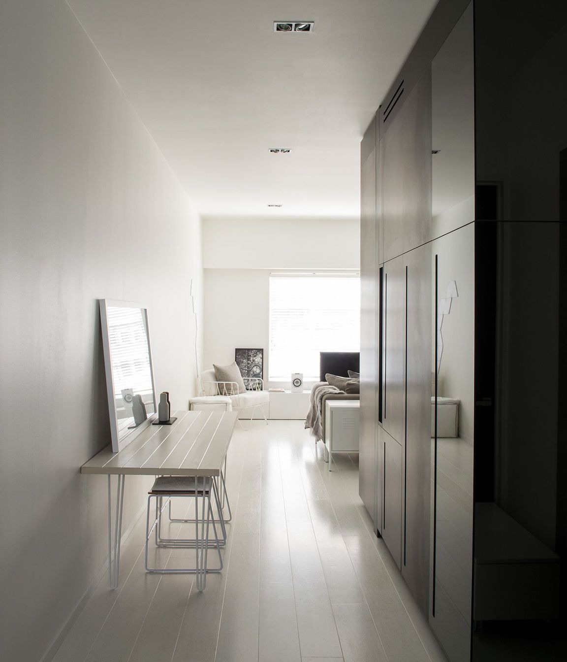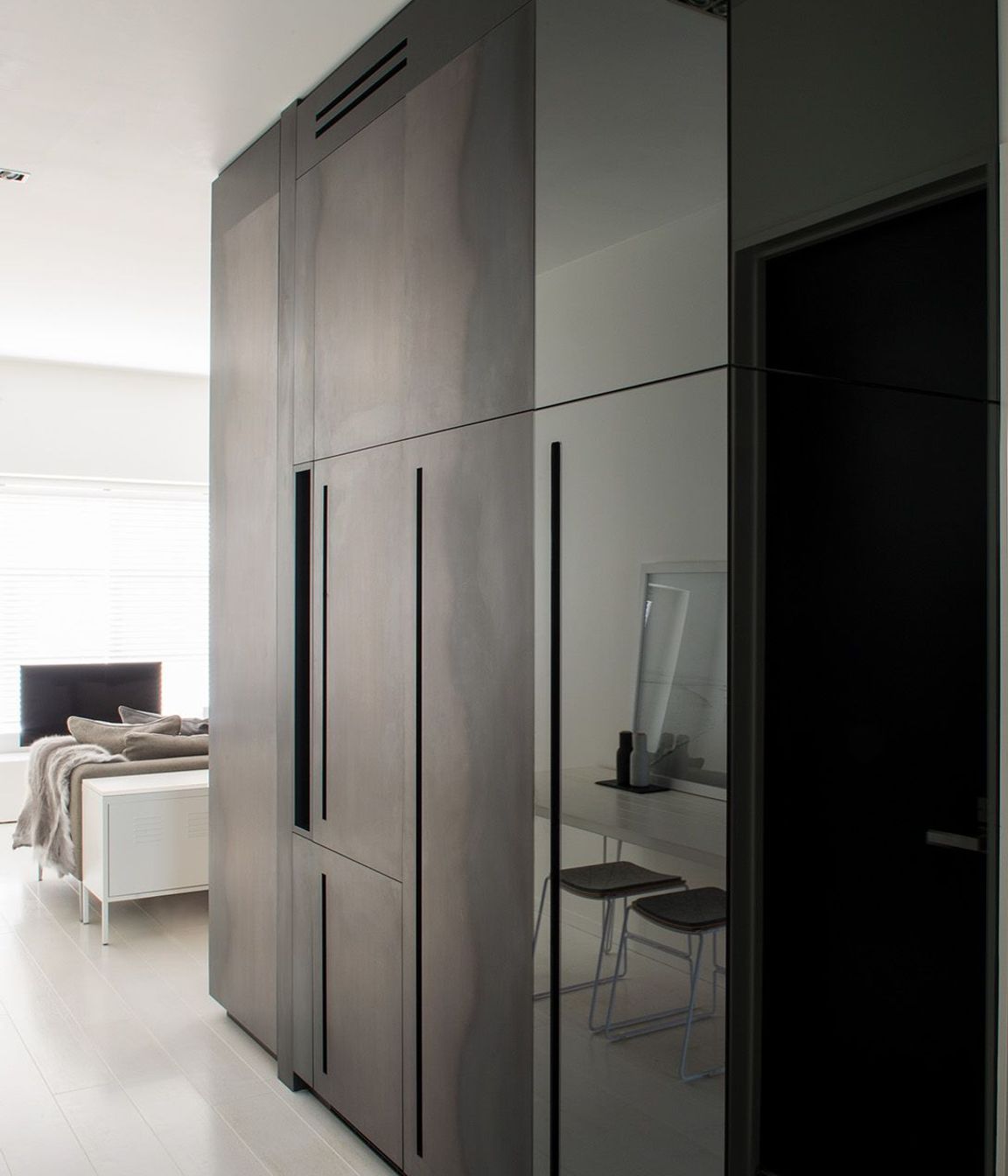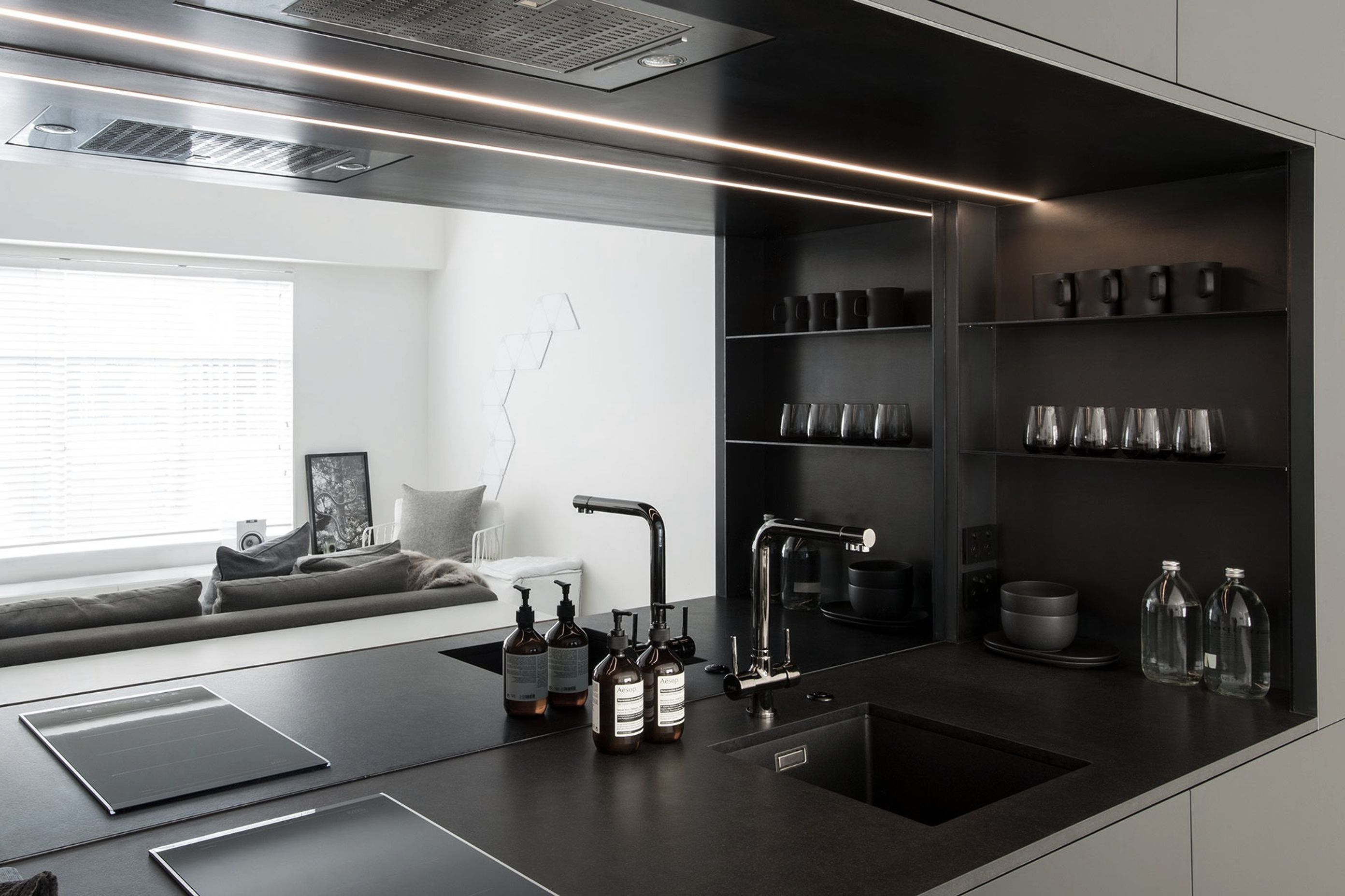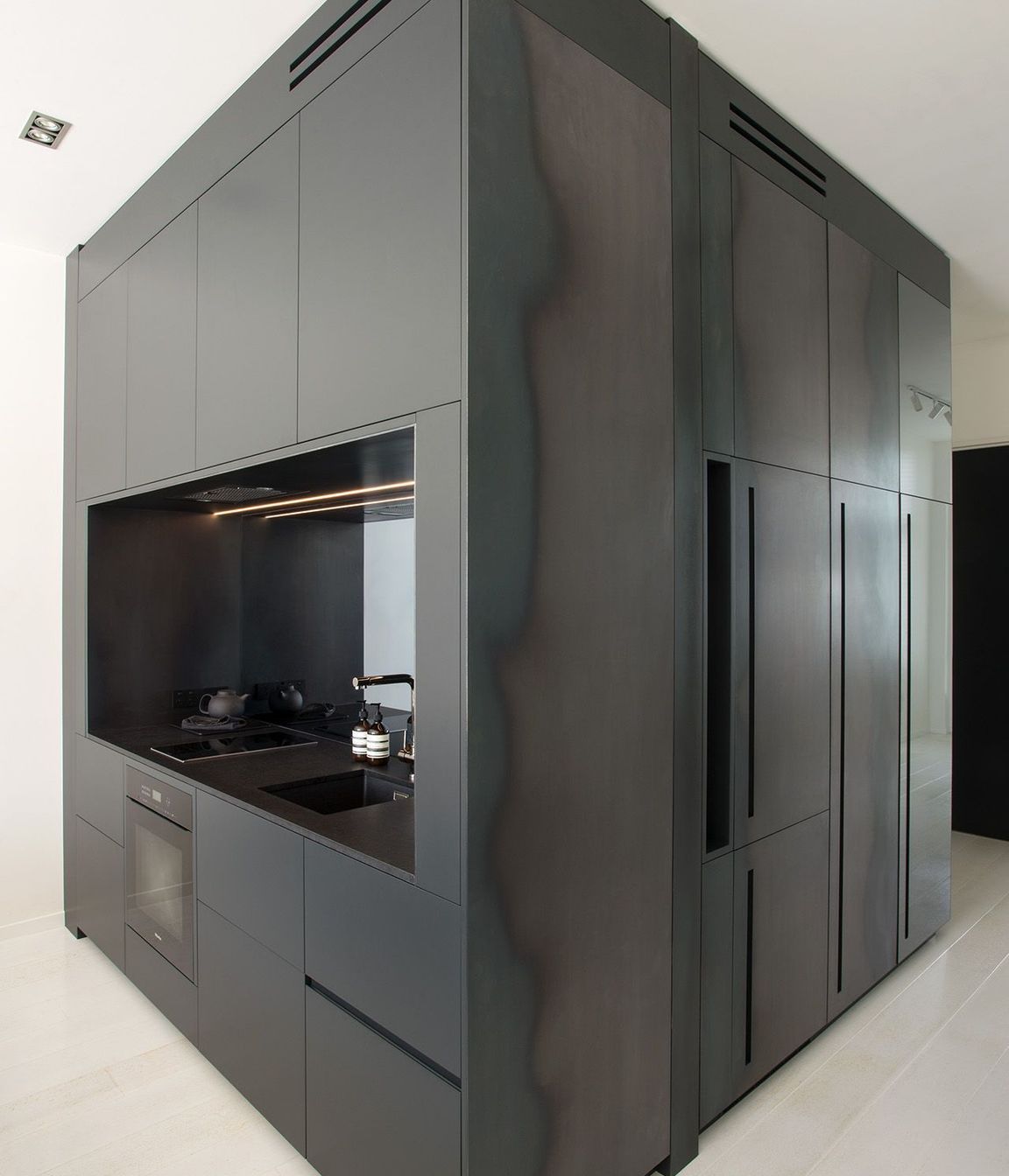 ArchiPro Project Summary - A bold urban apartment featuring a unique kitchen design with a warm white cube and contrasting dark box, utilizing innovative materials for a seamless aesthetic and integrated appliances for a distinctive living space.