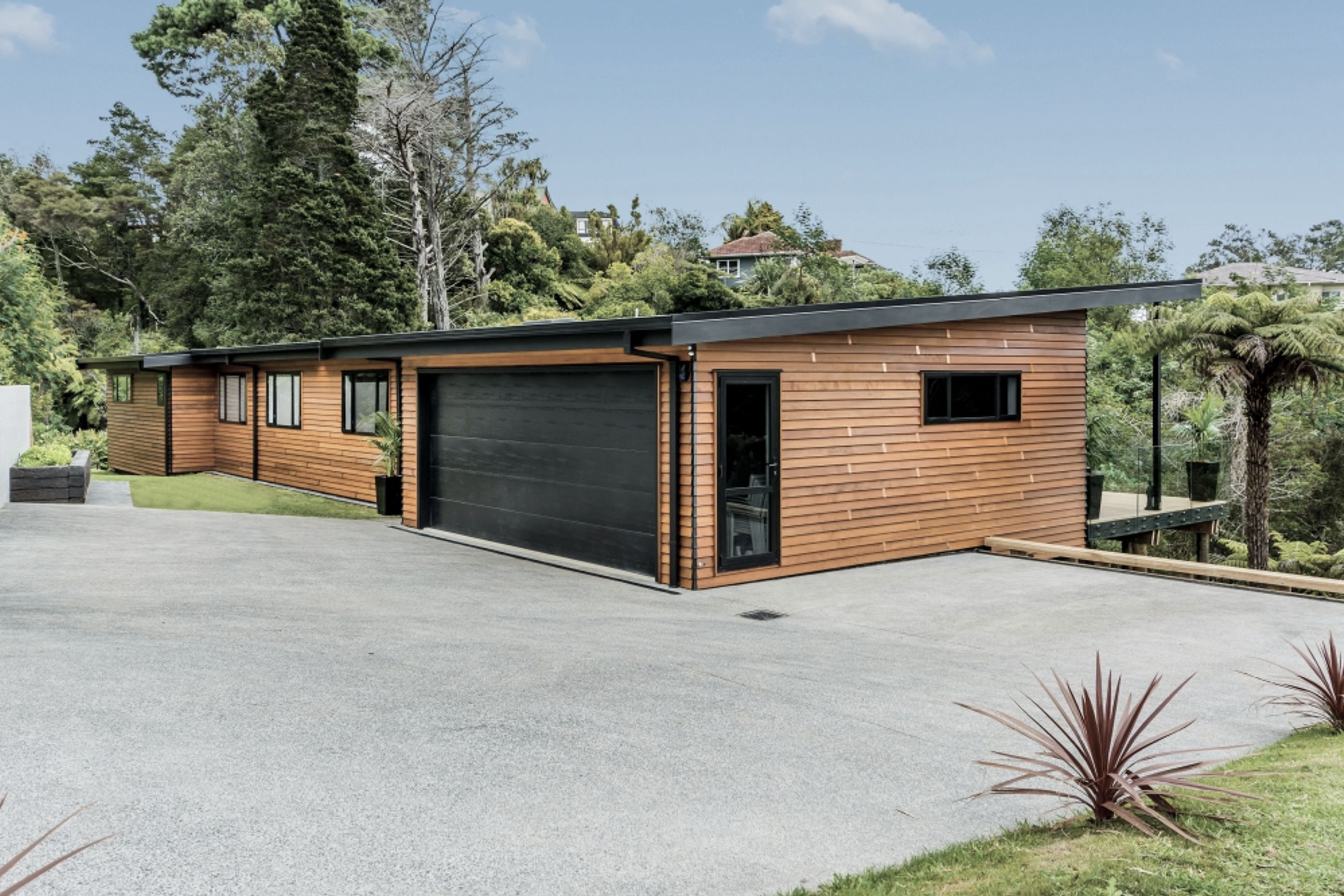 ArchiPro Project Summary - A cedar-clad minimalist home featuring three bedrooms, a study, and a spacious deck, expertly designed on a unique sloping section with extensive earthworks and engineering, complemented by a two-car garage and serene bush outlook.