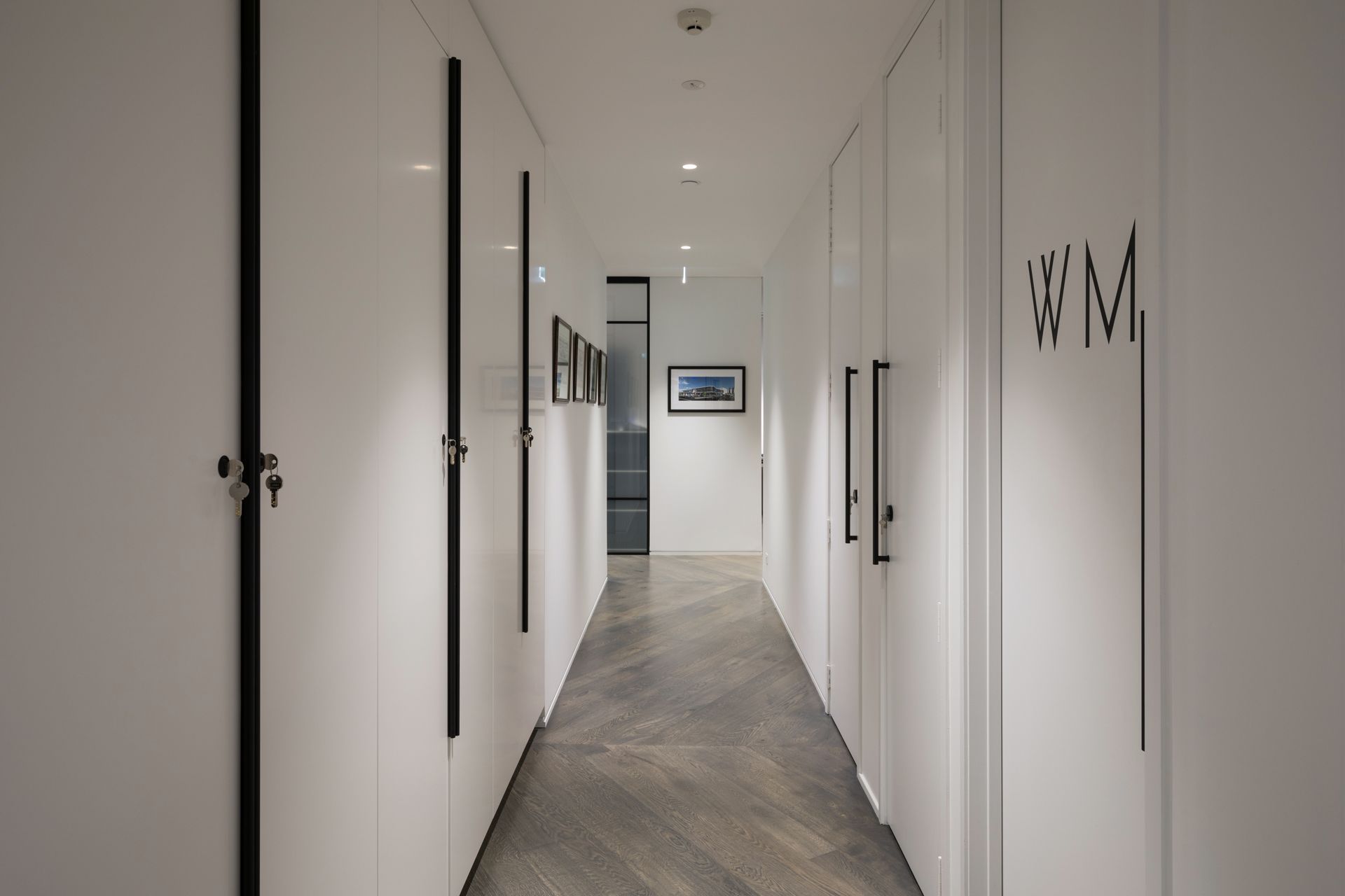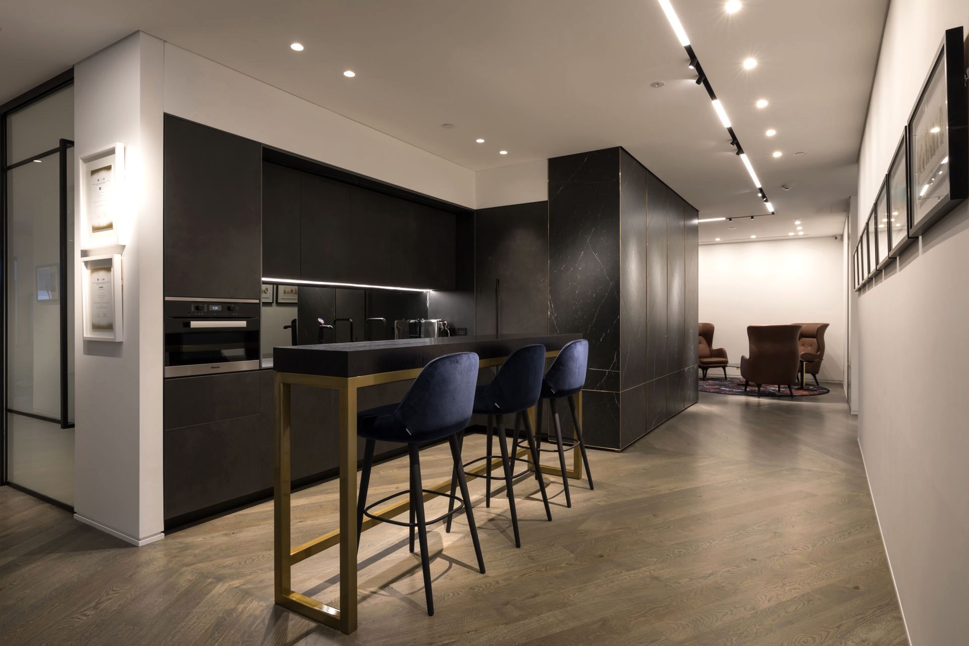 ArchiPro Project Summary - A refined waterfront office space blending elegance and practicality, featuring executive offices, a bar and kitchen, and a seaward-facing lounge for meetings and events, all crafted with natural materials and bespoke furnishings.