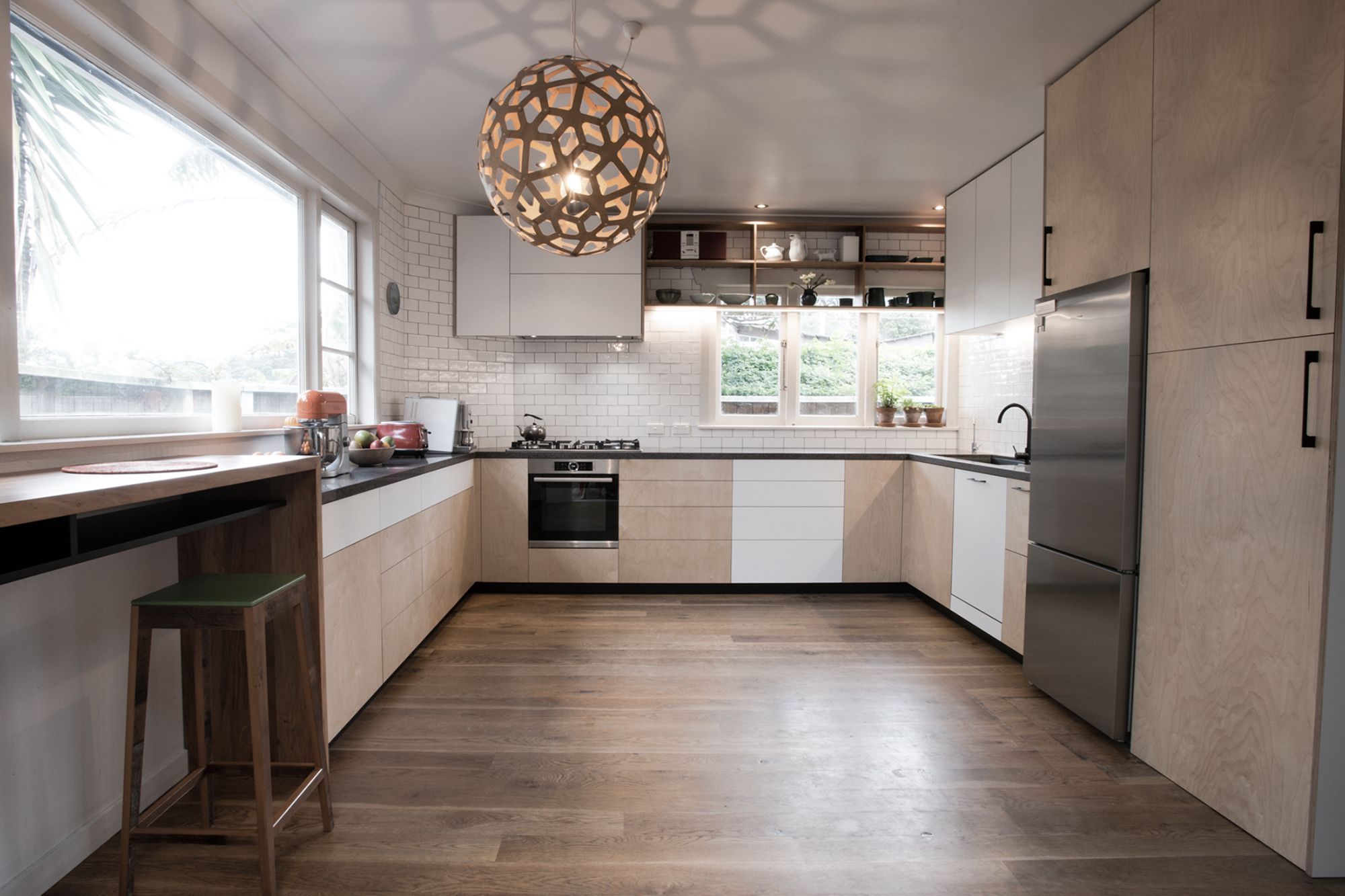 ArchiPro Project Summary - A functional and stylish kitchen designed for a busy family, featuring Eurolite Poplar and Birch plywoods, a bespoke workstation in reclaimed Rimu, and a striking contrast of white laminate and natural timber.