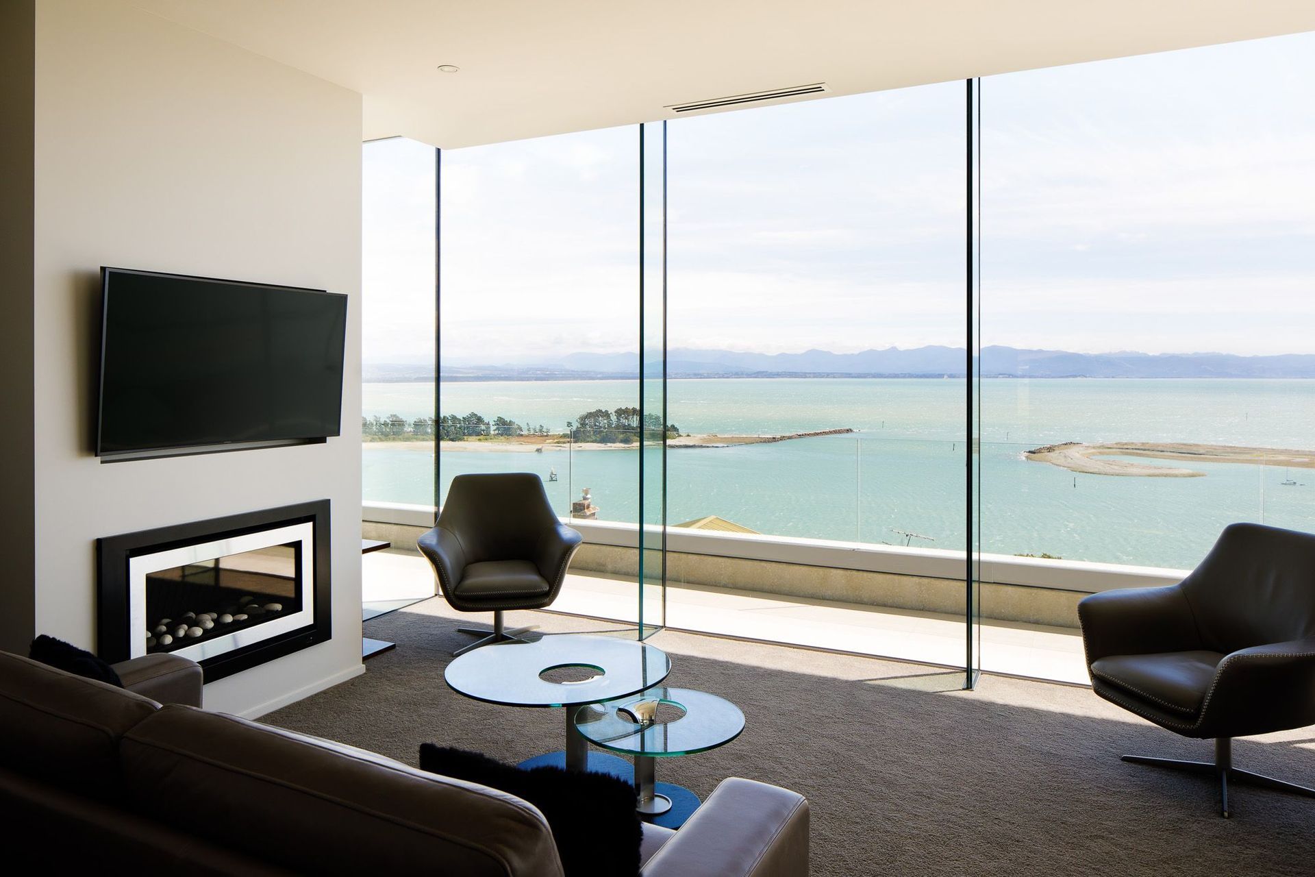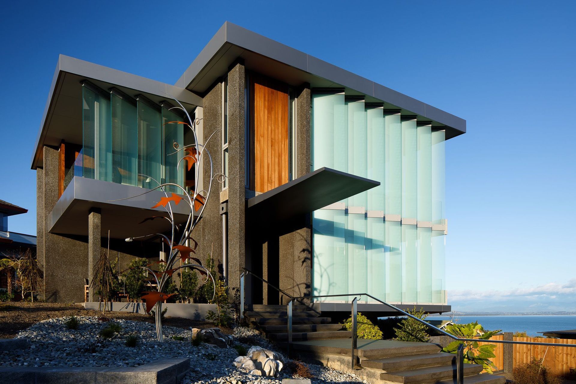 ArchiPro Project Summary - Victoria Heights House: A stunning three-level residence in Nelson, offering breathtaking 270-degree views of Tasman Bay, designed for optimal enjoyment and privacy with innovative features and durable materials.